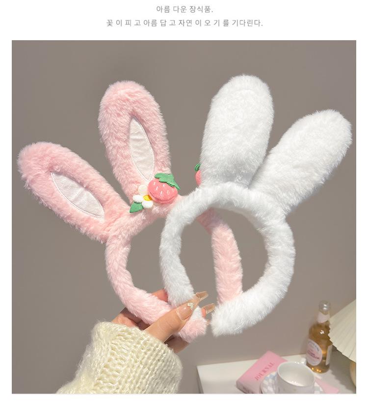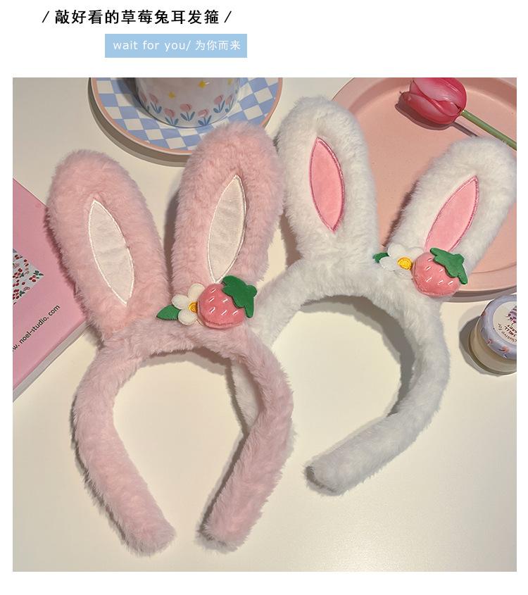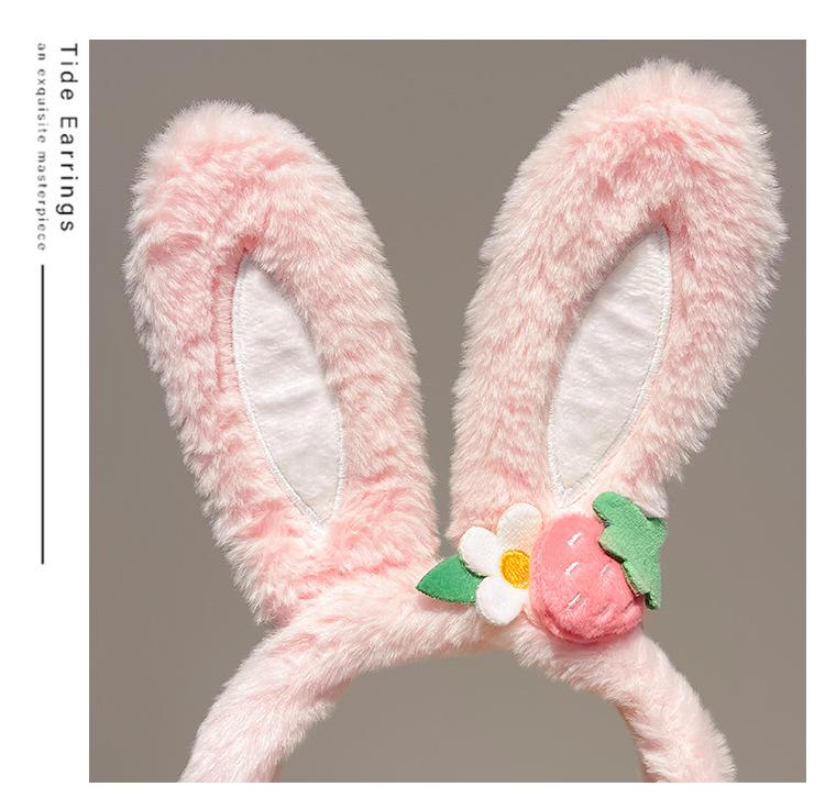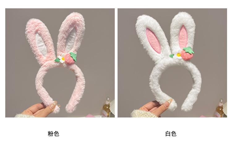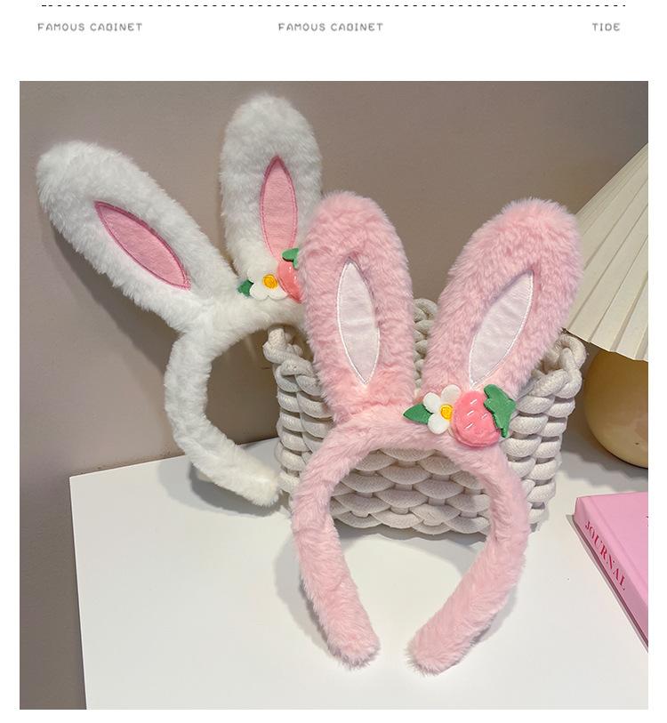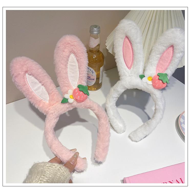 Diadema de felpa con orejas de conejo para mujer, diadema con diseño de flor de fresa y dibujos animados, ideal para otoño e invierno