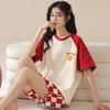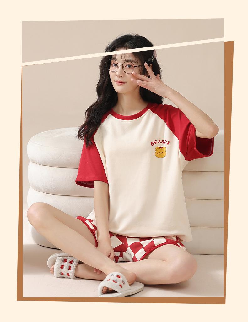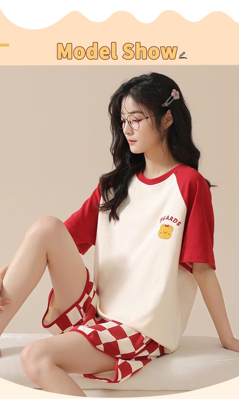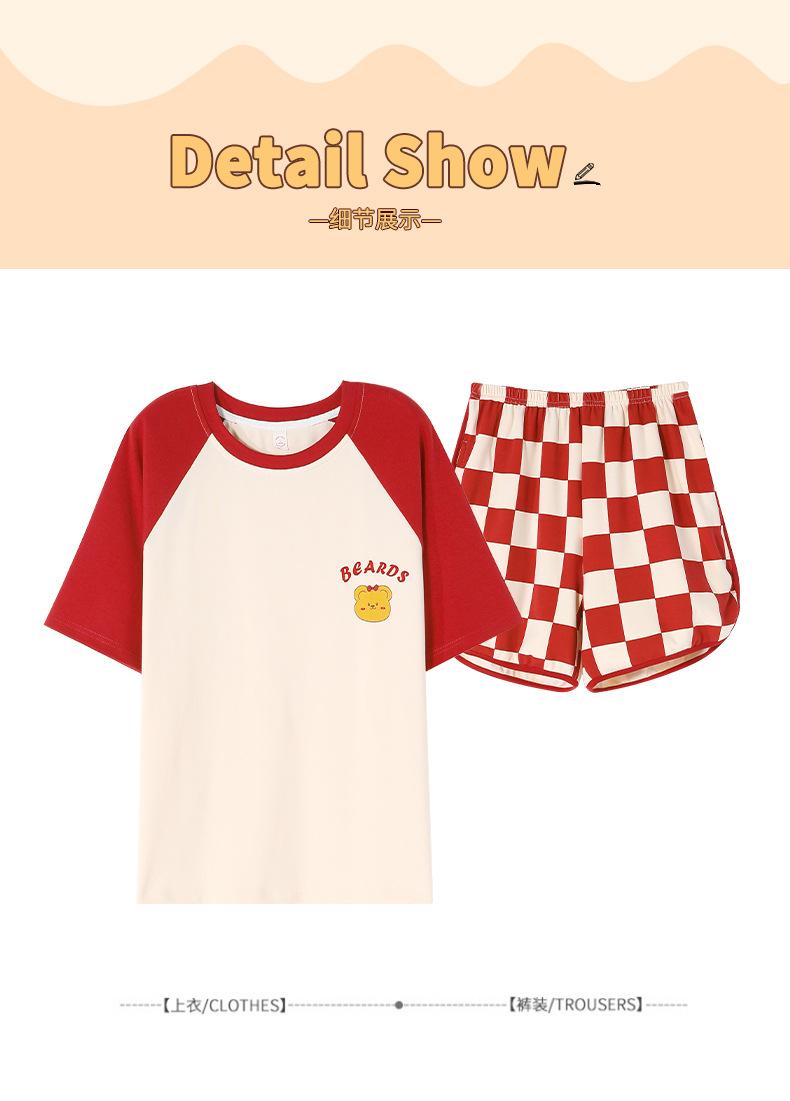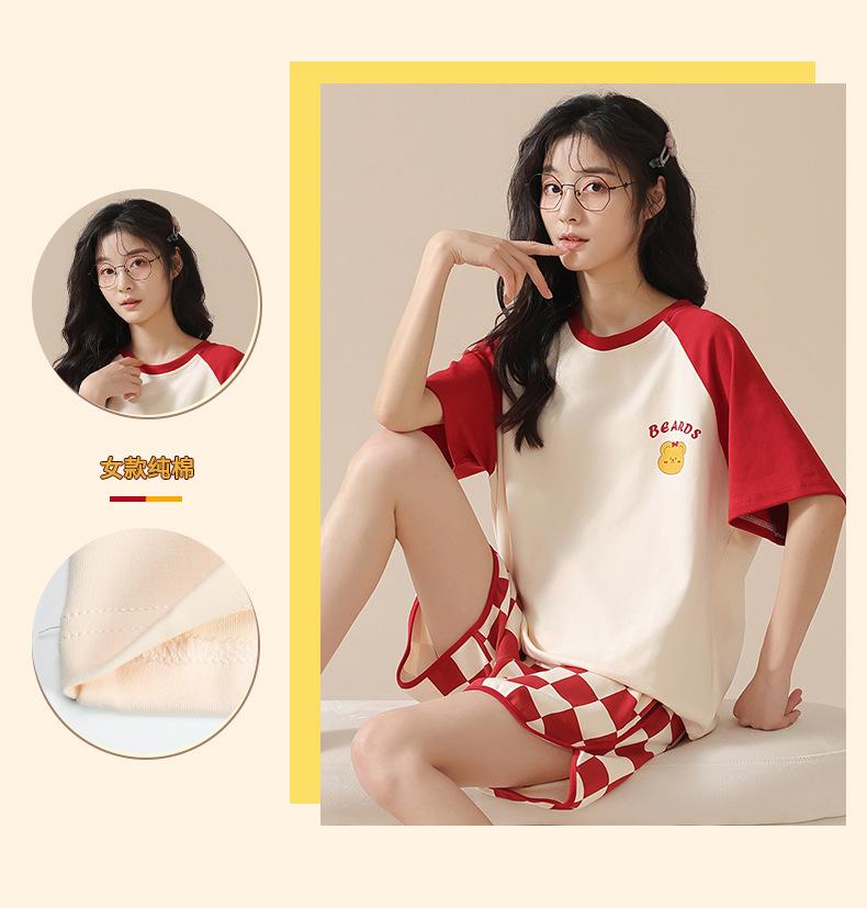 [Algodón Puro] Pijama de Verano para Mujer Estilo Rojo de Internet Casual Manga Corta Shorts Traje Ropa de Casa Delgada para Niña Se Puede Usar