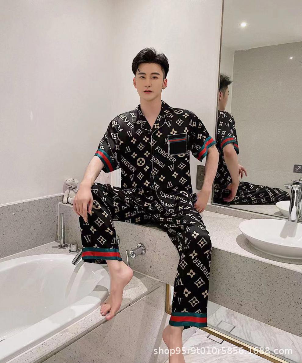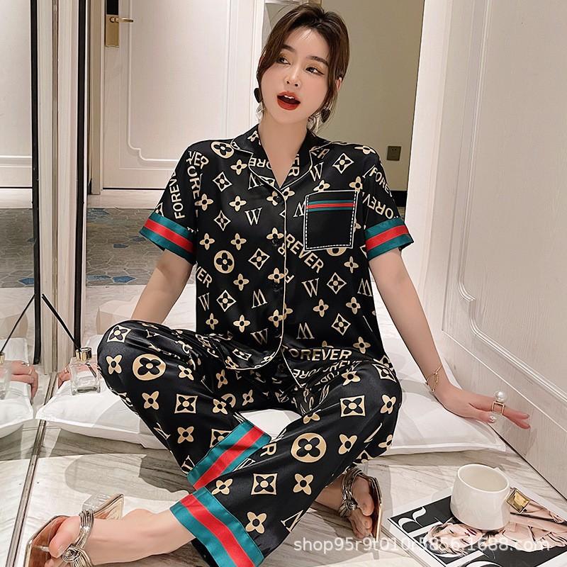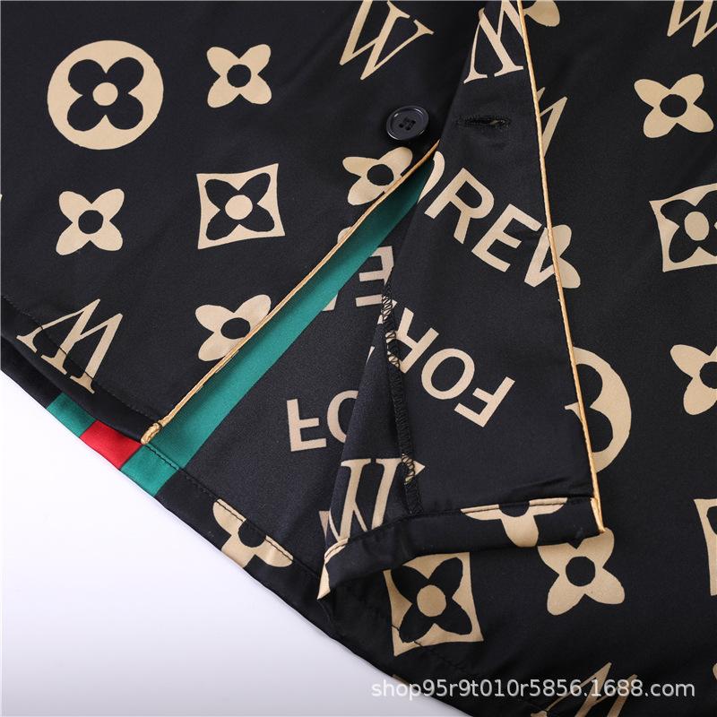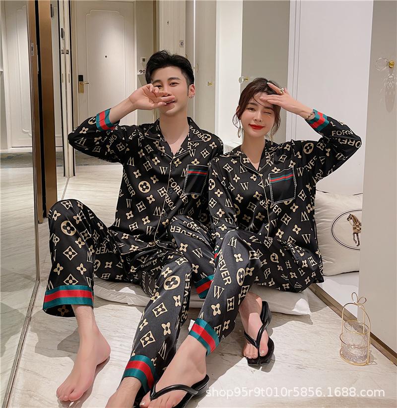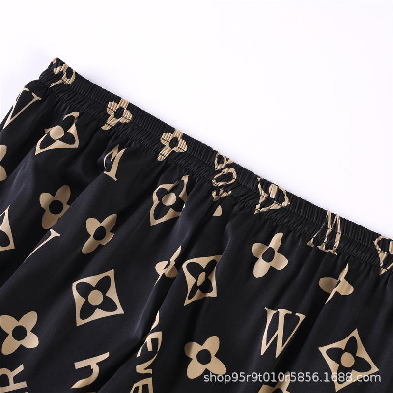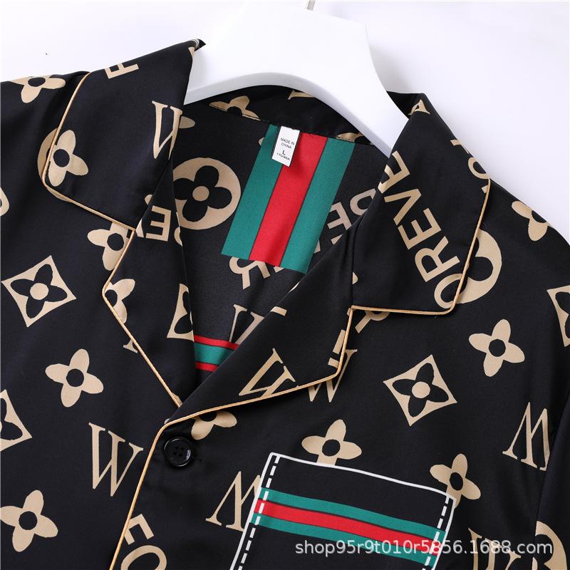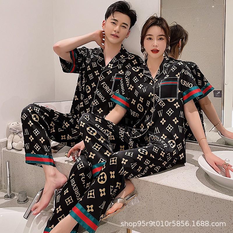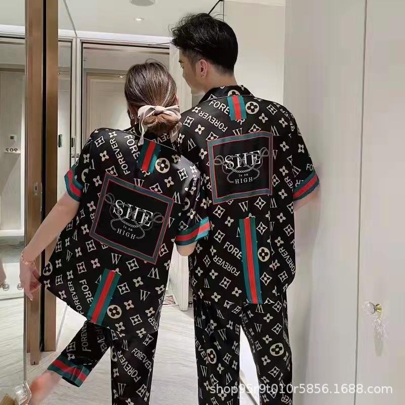 Ropa de Casa para Pareja Negro Dorado Verano Seda de Hielo Manga Corta Pantalones Casual Moda Pijama Traje para Usar