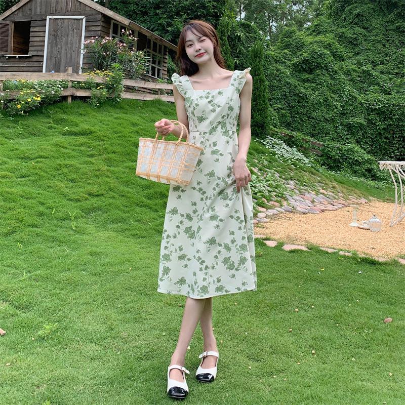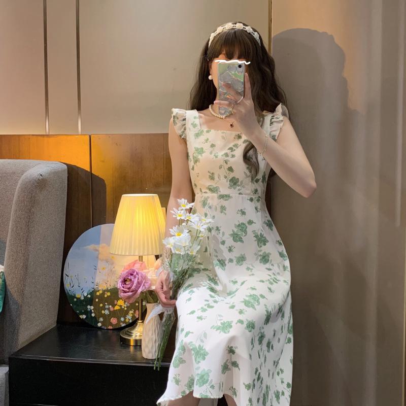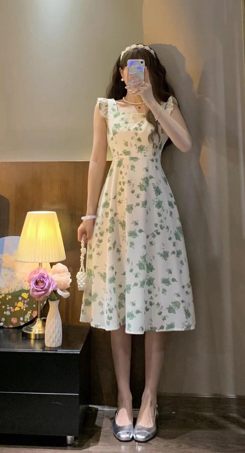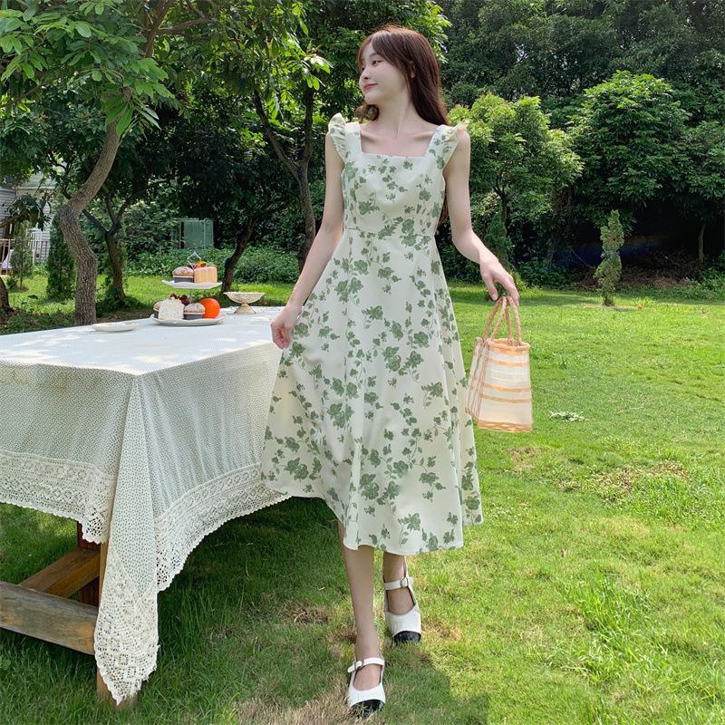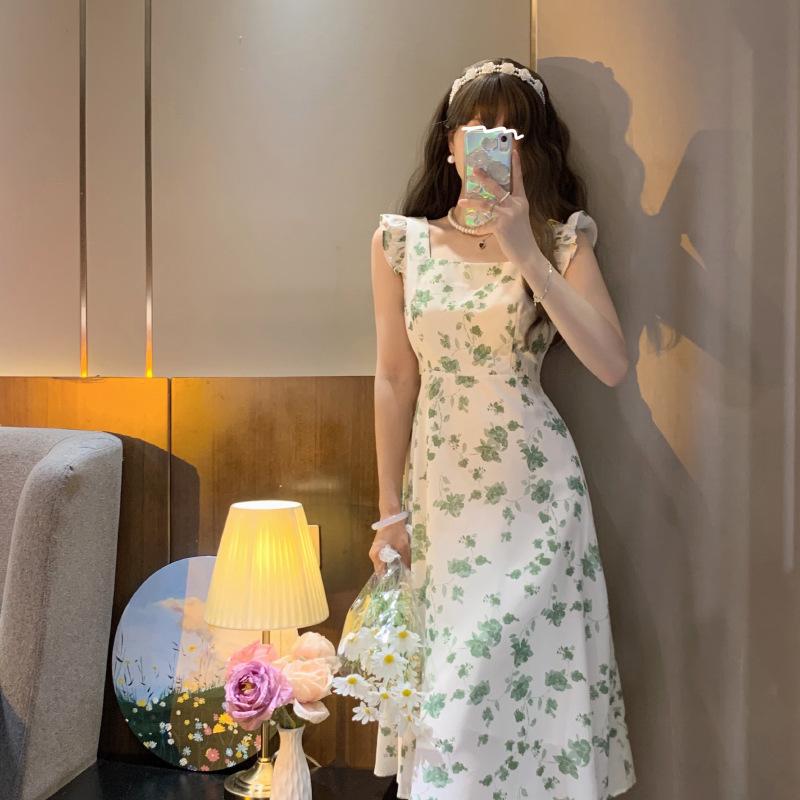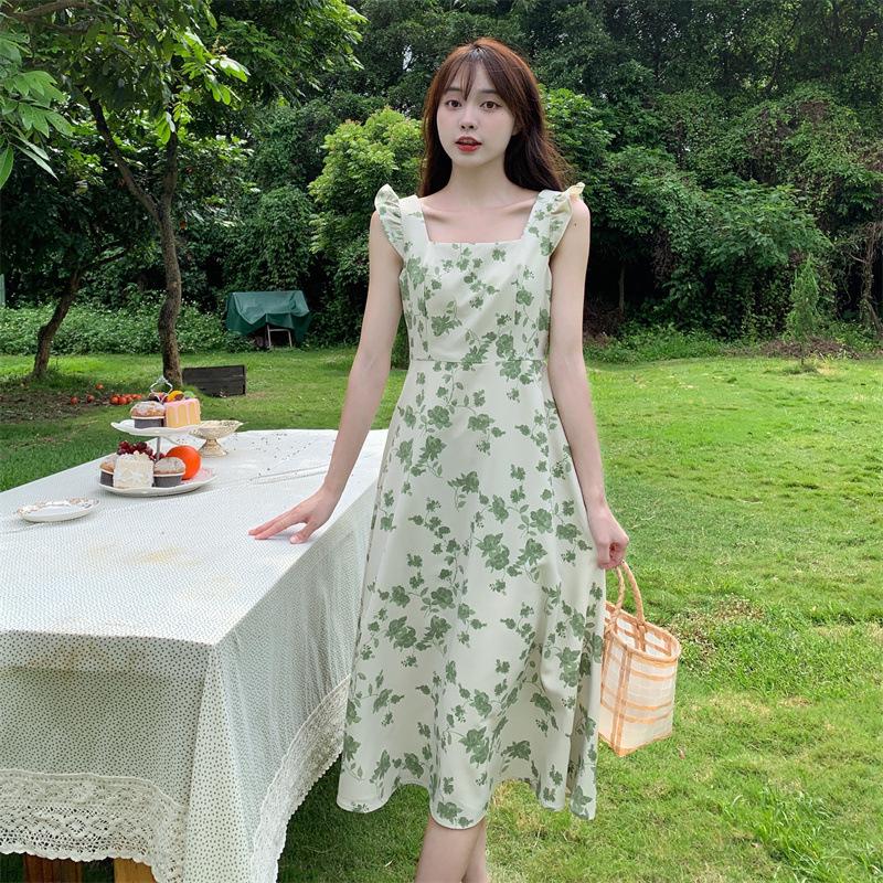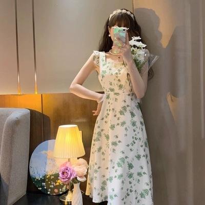 Verano 2023 Cuello Cuadrado Francés Mangas Cortas con Vuelo Vestido Floral Diseño Nicho Adelgazante de Cintura Falda Larga Línea A Moda