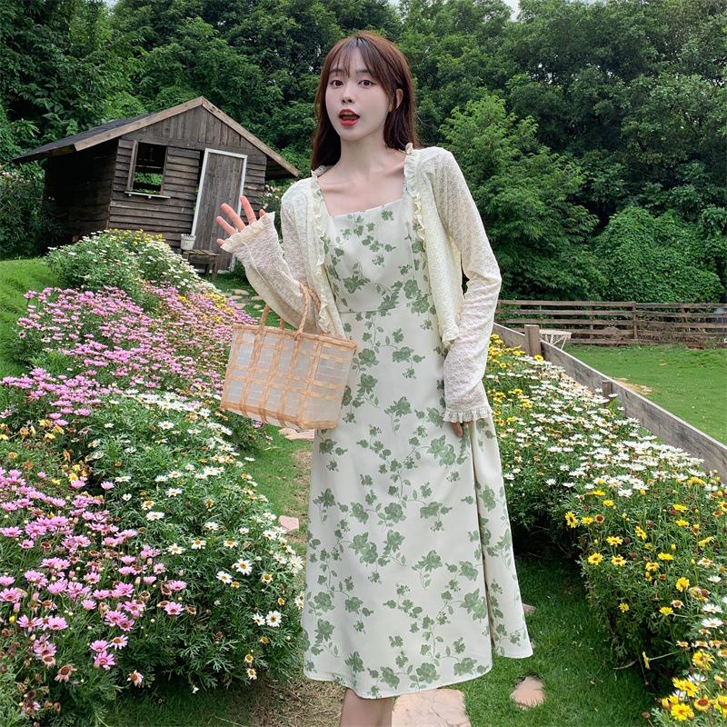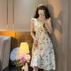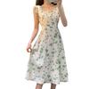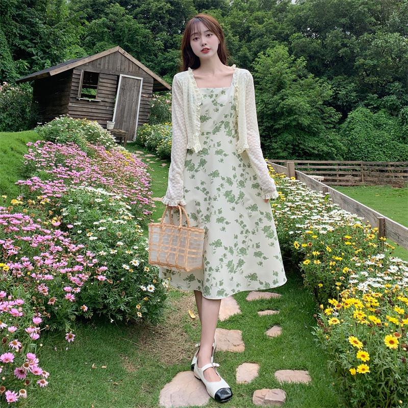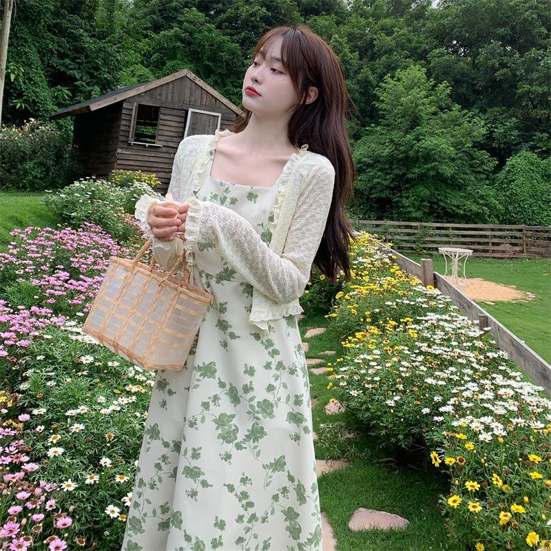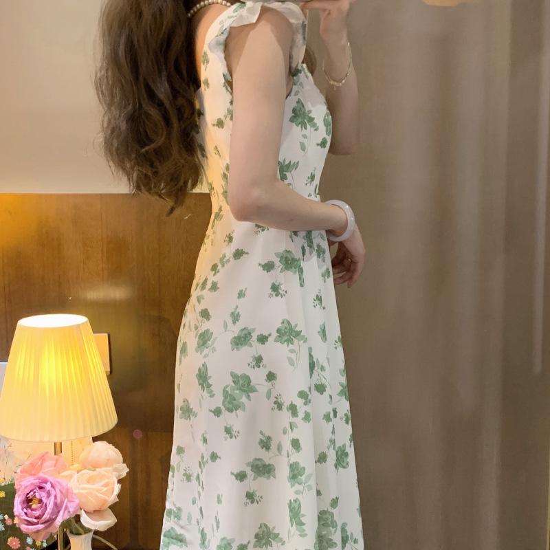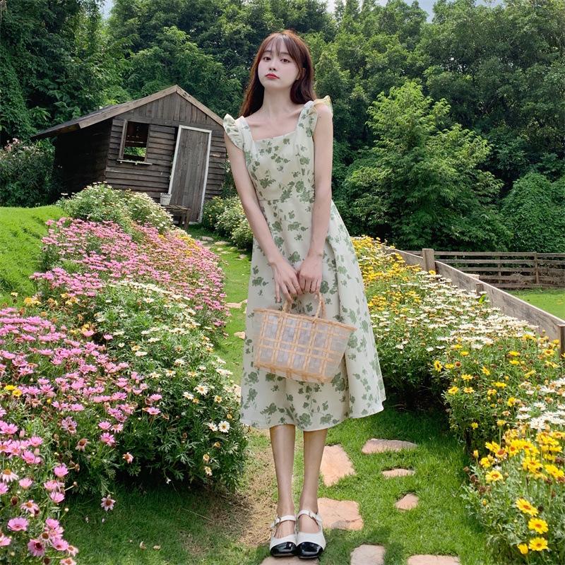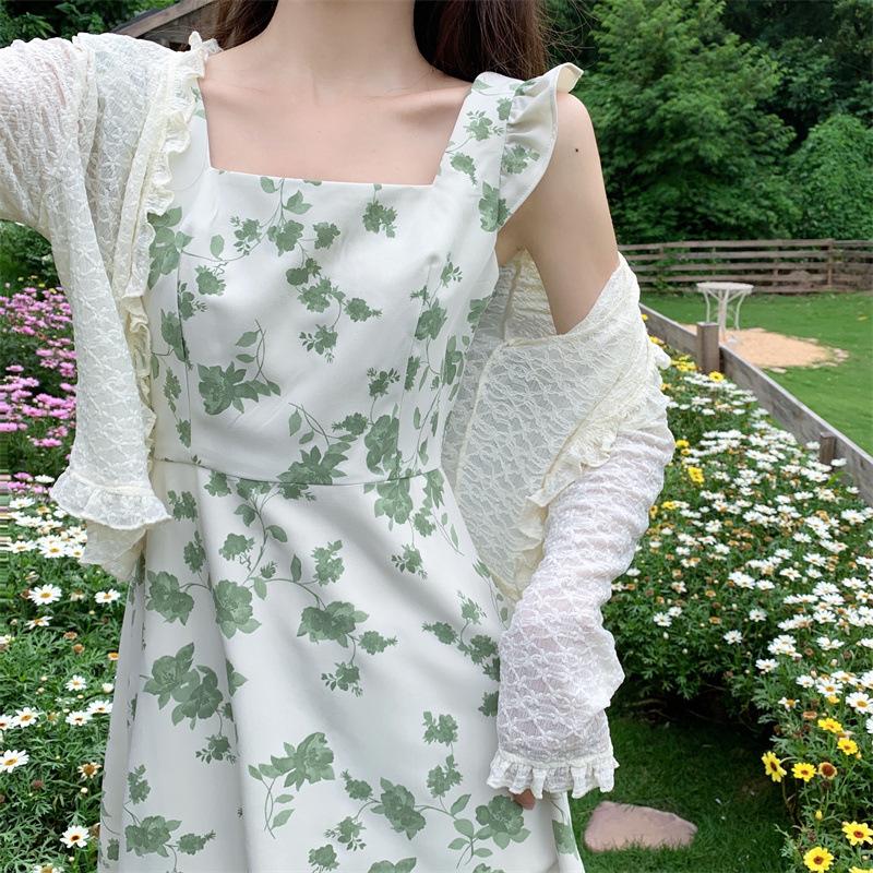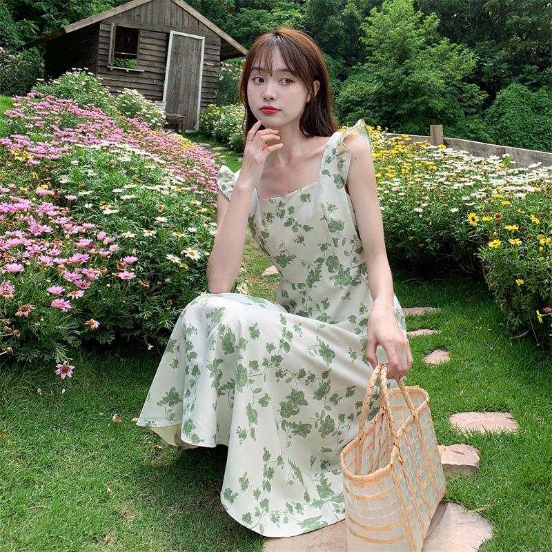 Verano 2023 Cuello Cuadrado Francés Mangas Cortas con Vuelo Vestido Floral Diseño Nicho Adelgazante de Cintura Falda Larga Línea A Moda