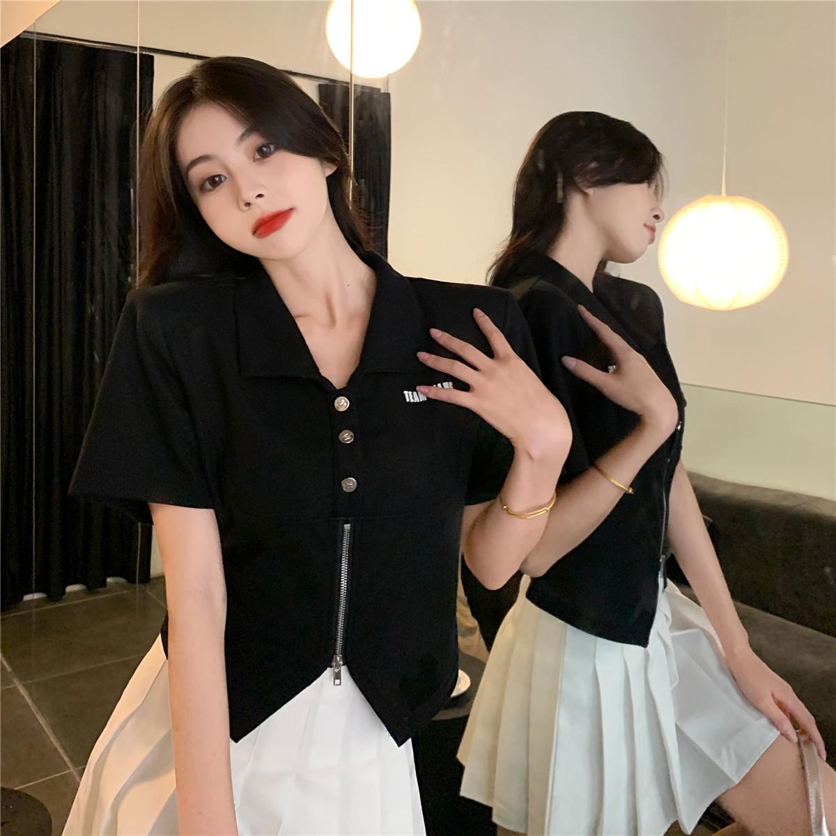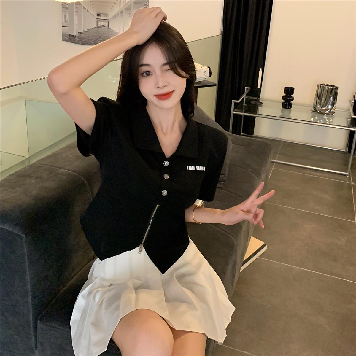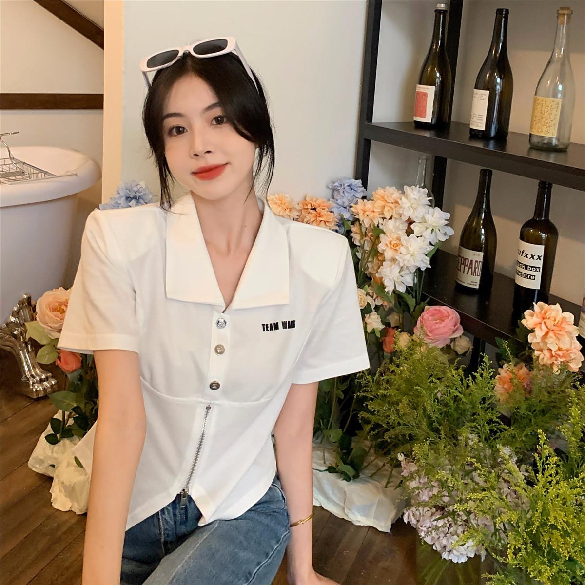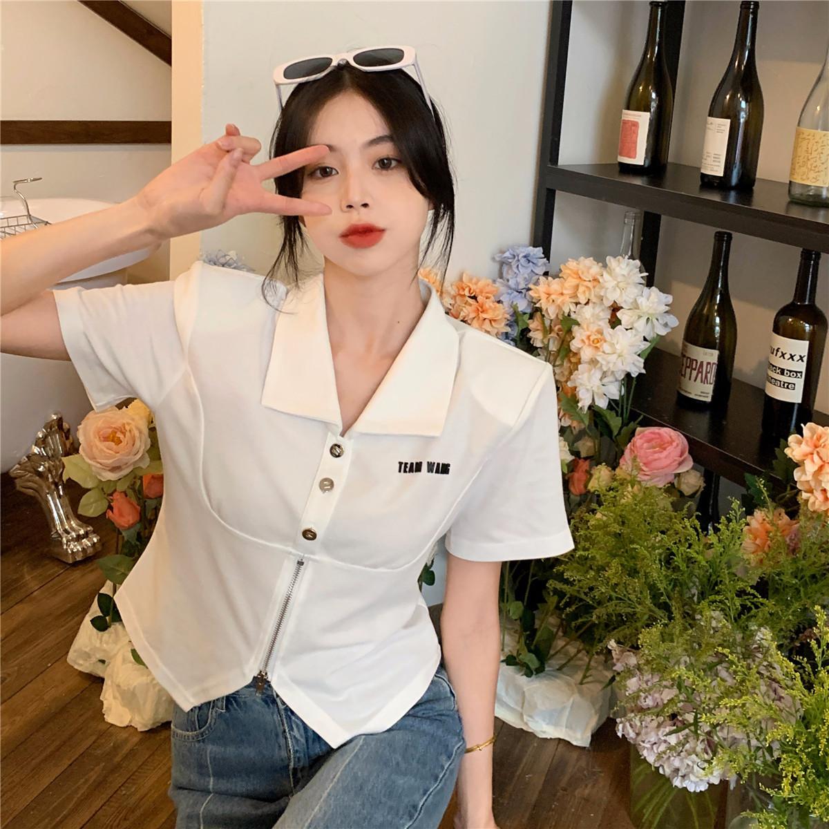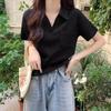 Camiseta de manga corta con cuello polo para mujer, diseño de nicho, irregular, de verano, holgada y adelgazante.