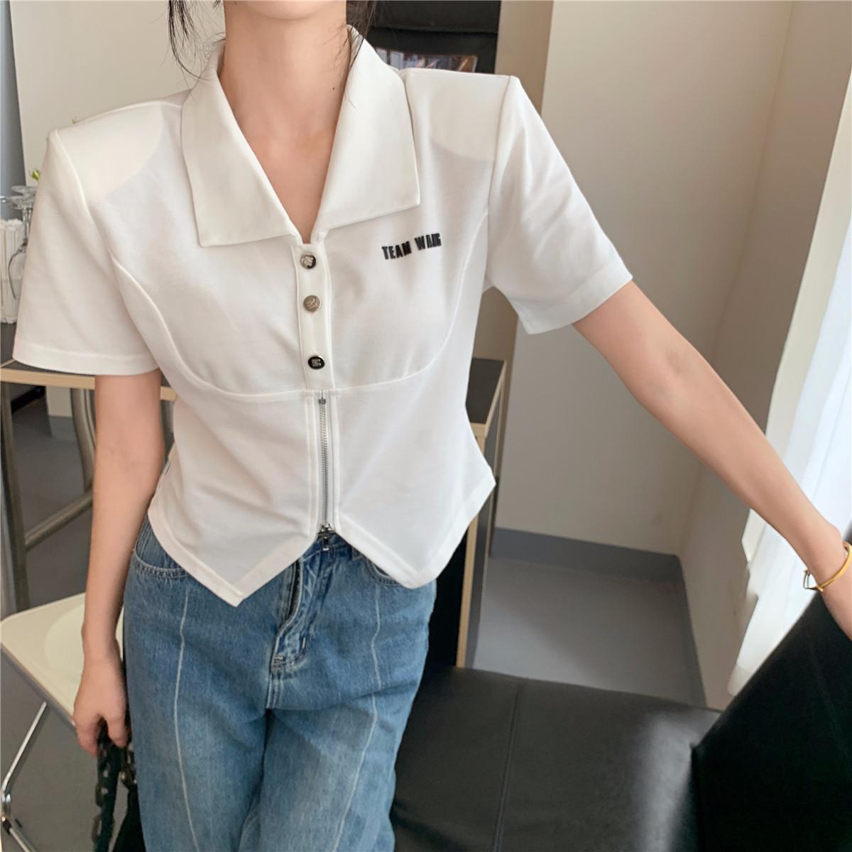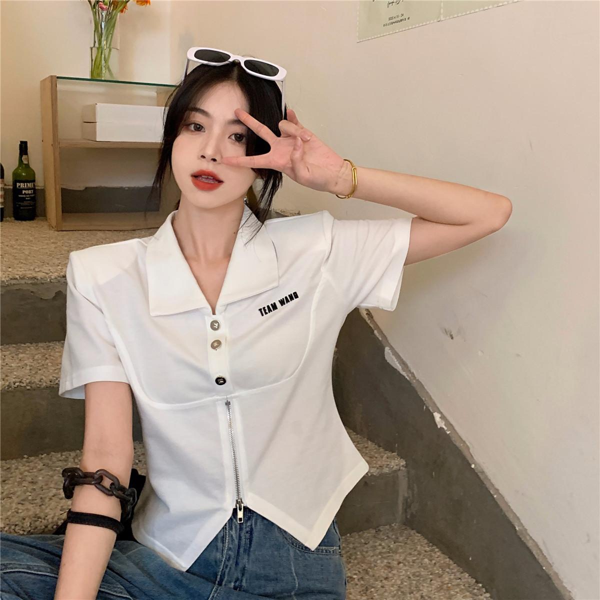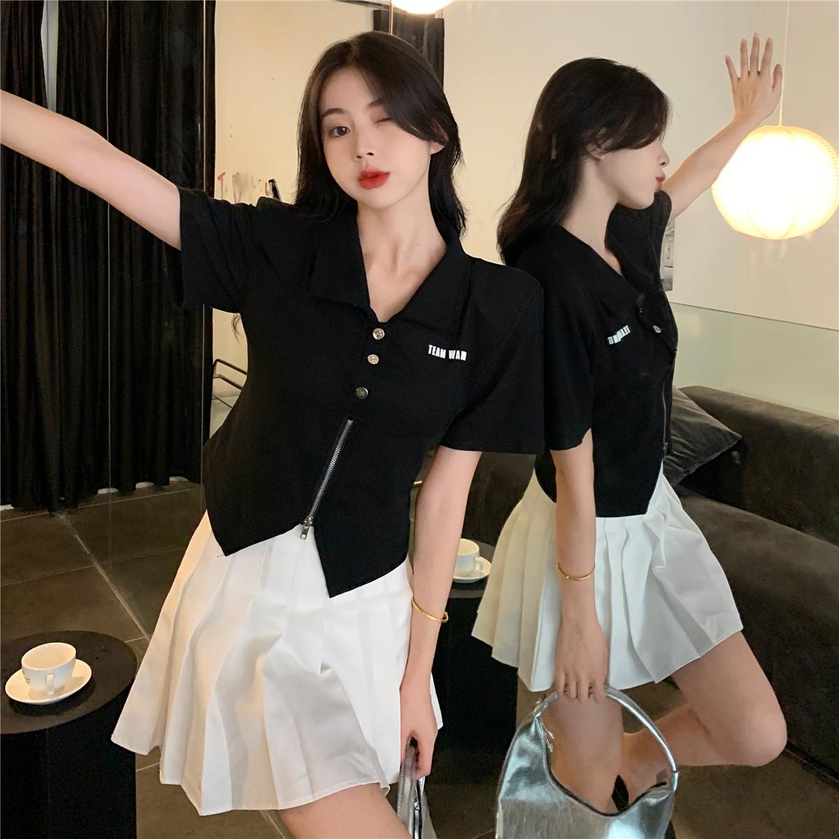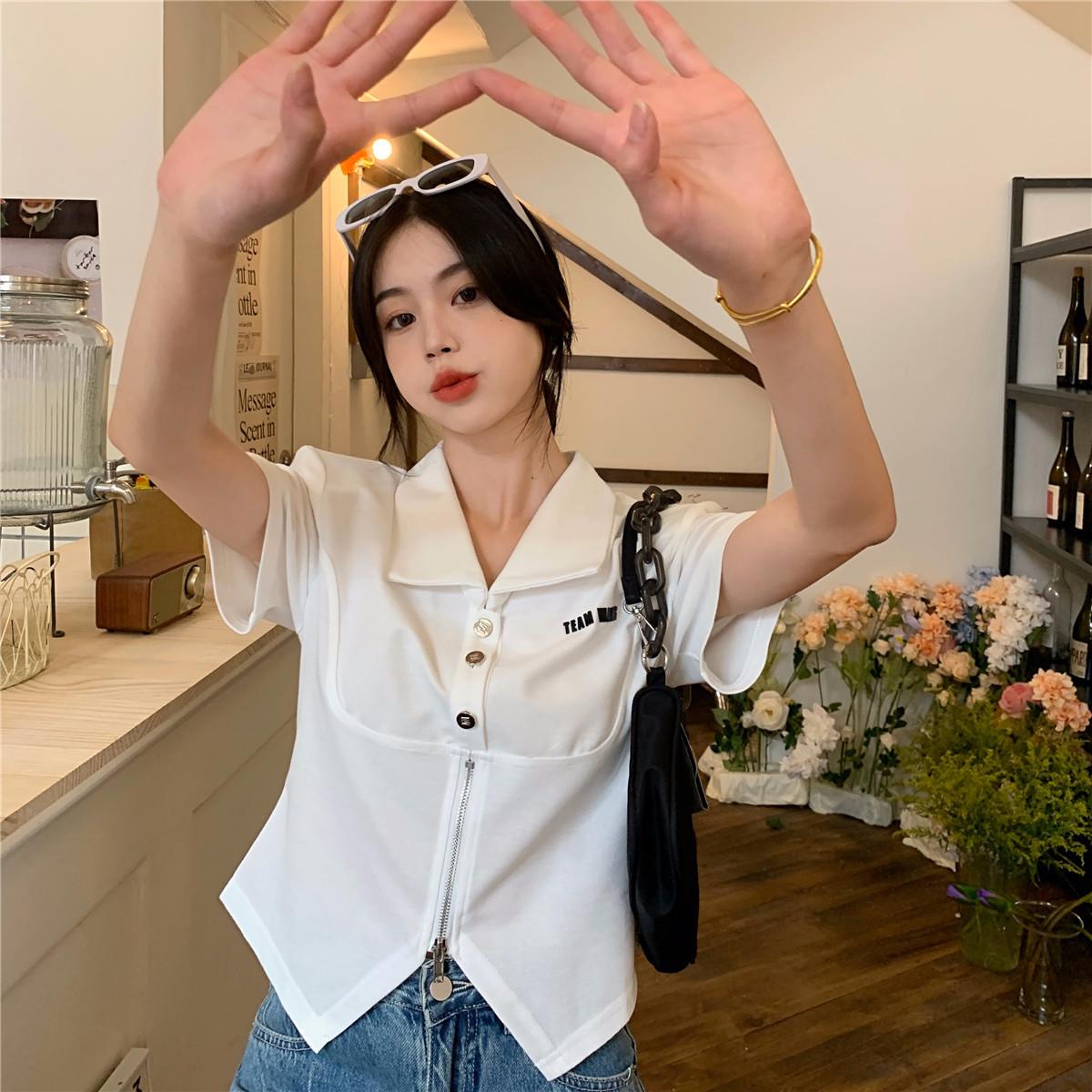 Camiseta de manga corta con cuello polo para mujer, diseño de nicho, irregular, de verano, holgada y adelgazante.
