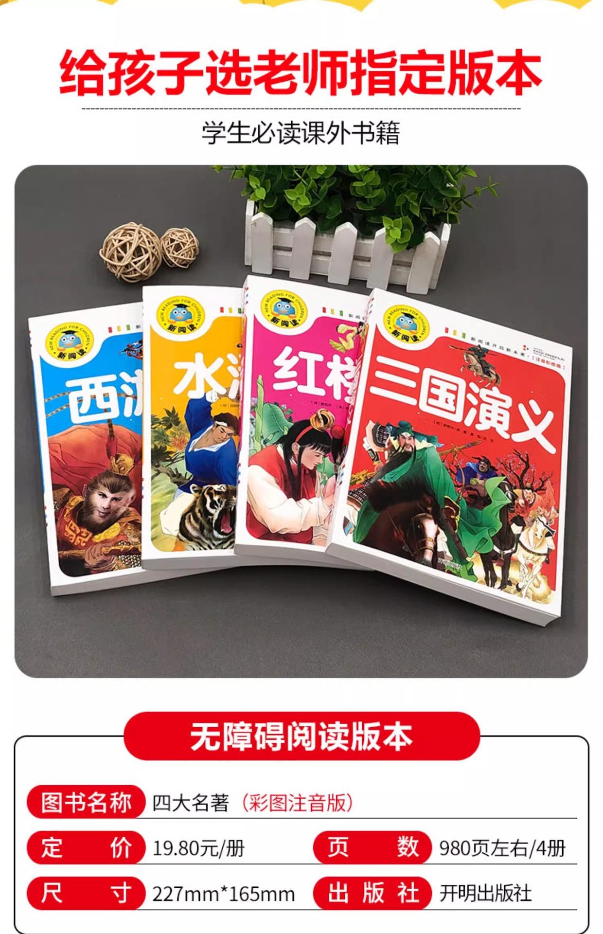 Cuatro obras maestras Edición fonética Edición para escuela primaria Conjunto completo de 4 Romance genuino de los Tres Reinos Sueño de las Mansiones Rojas A la orilla del agua Viaje al Oeste