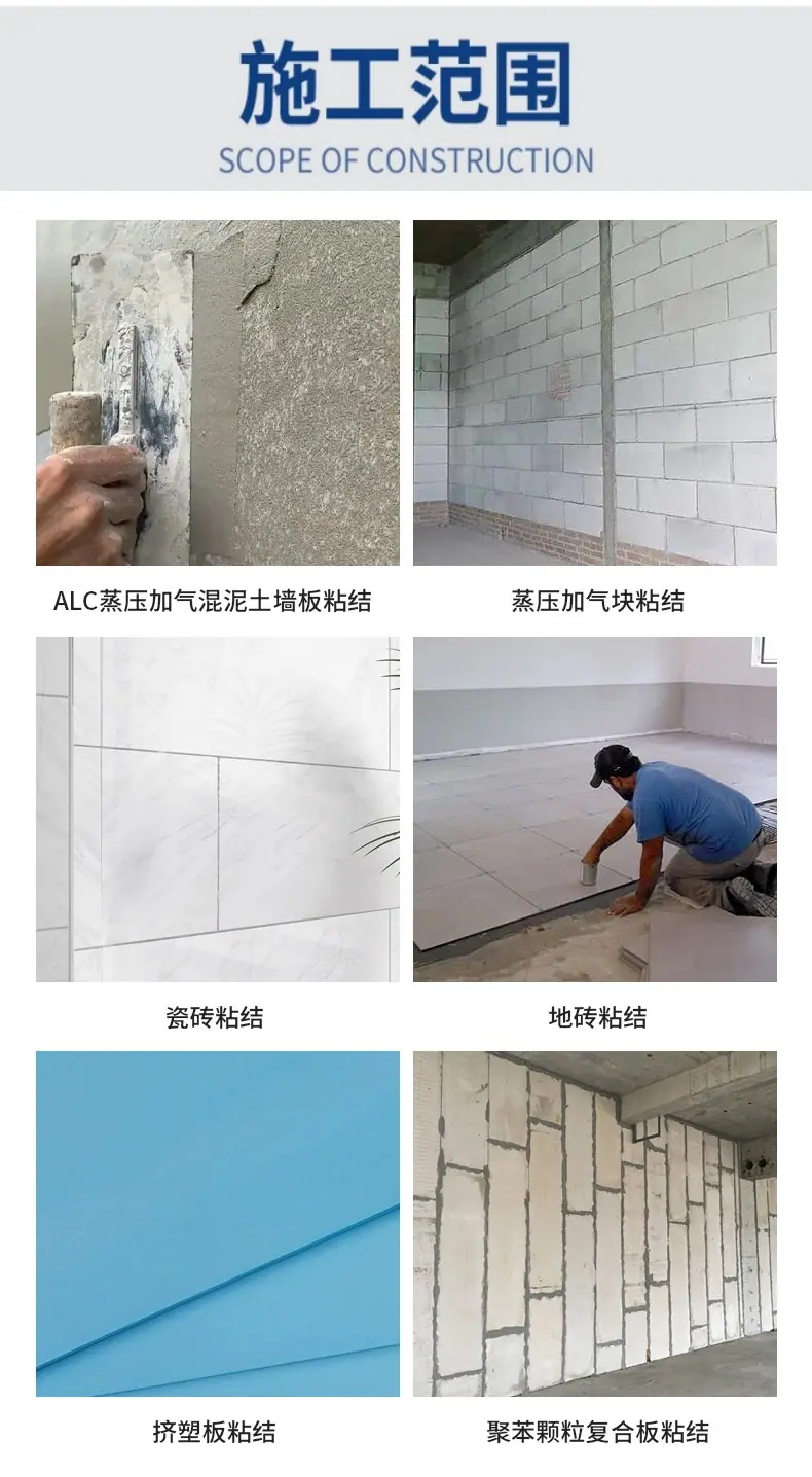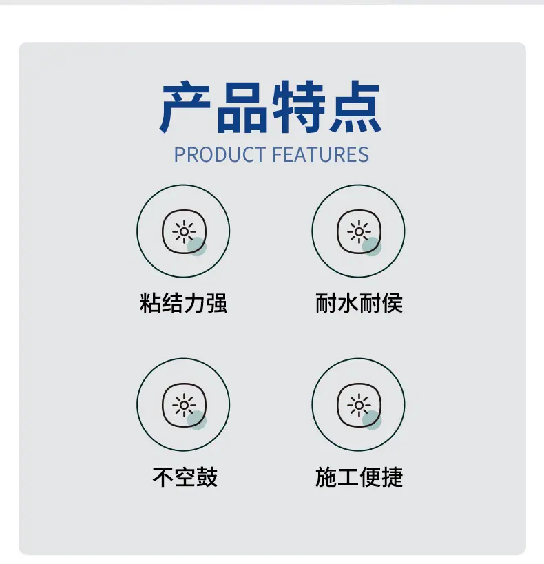 El mortero adhesivo modificado con polímero se fabrica con cemento especial modificado y diversos materiales poliméricos y rellenos mediante un proceso tecnológico de composición. Tiene buena retención de agua, alta resistencia de adherencia y no se desliza durante la construcción. Tiene excelente resistencia a la intemperie, resistencia al impacto y resistencia al agrietamiento.