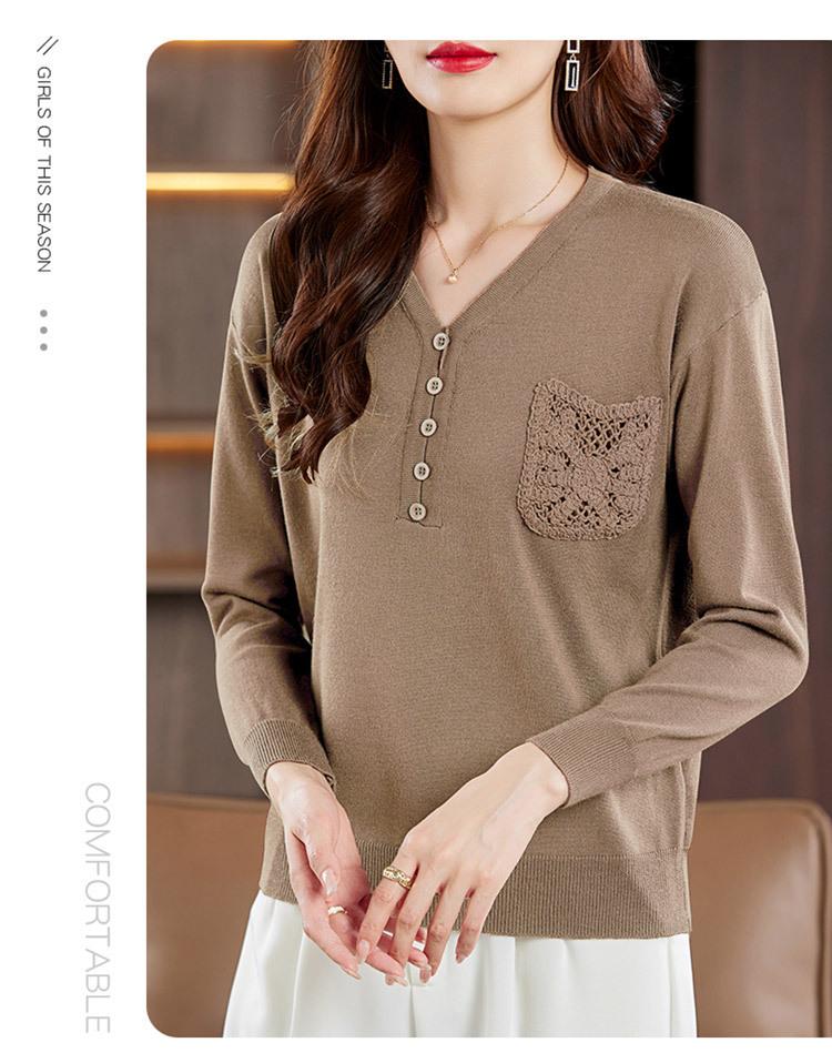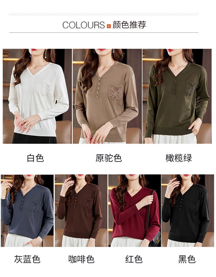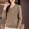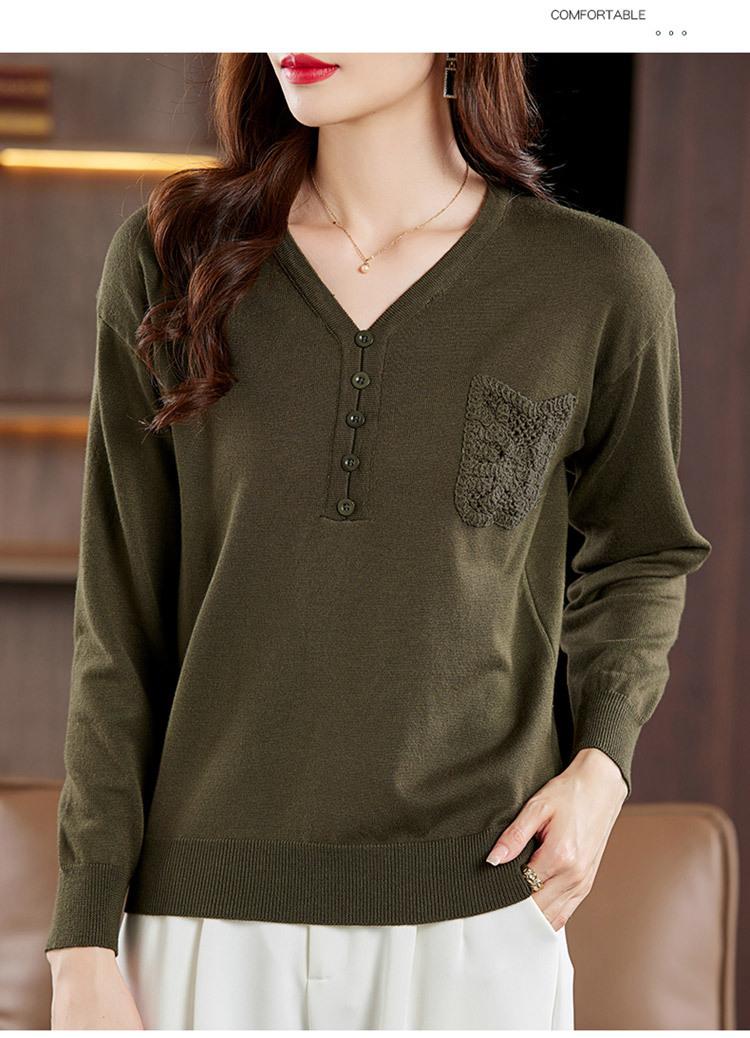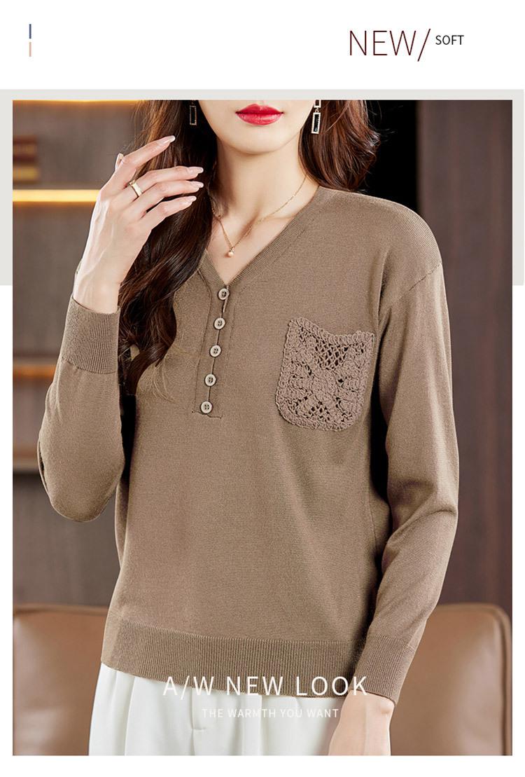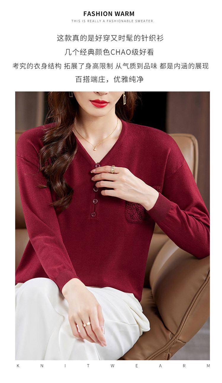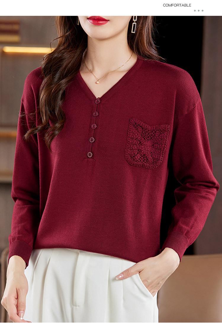 2023 otoño nuevo suéter de punto bordado de color sólido con cuello en V y manga larga para mujer, suéter básico para mamá que combina con todo, top para mujer