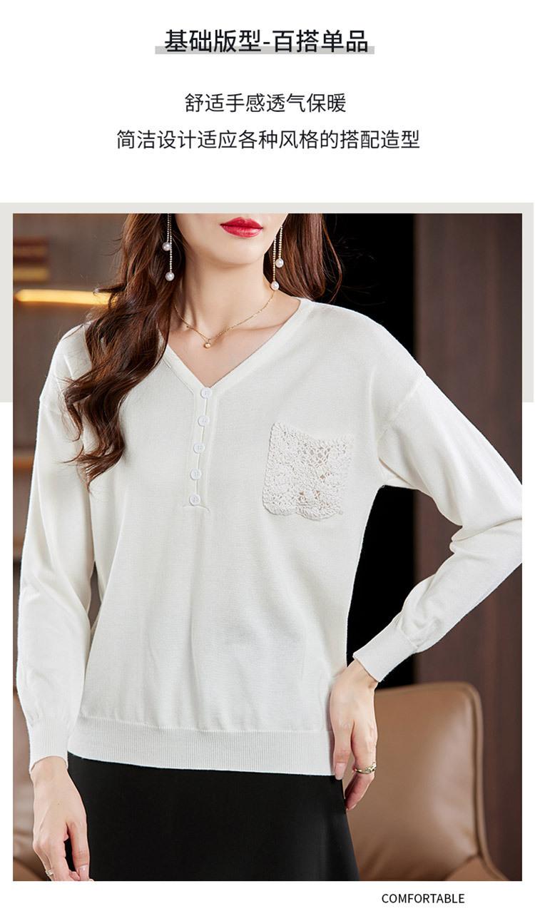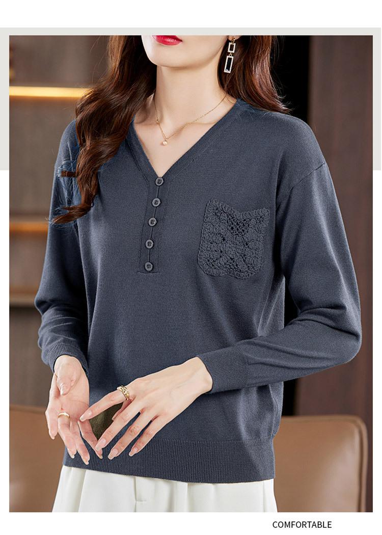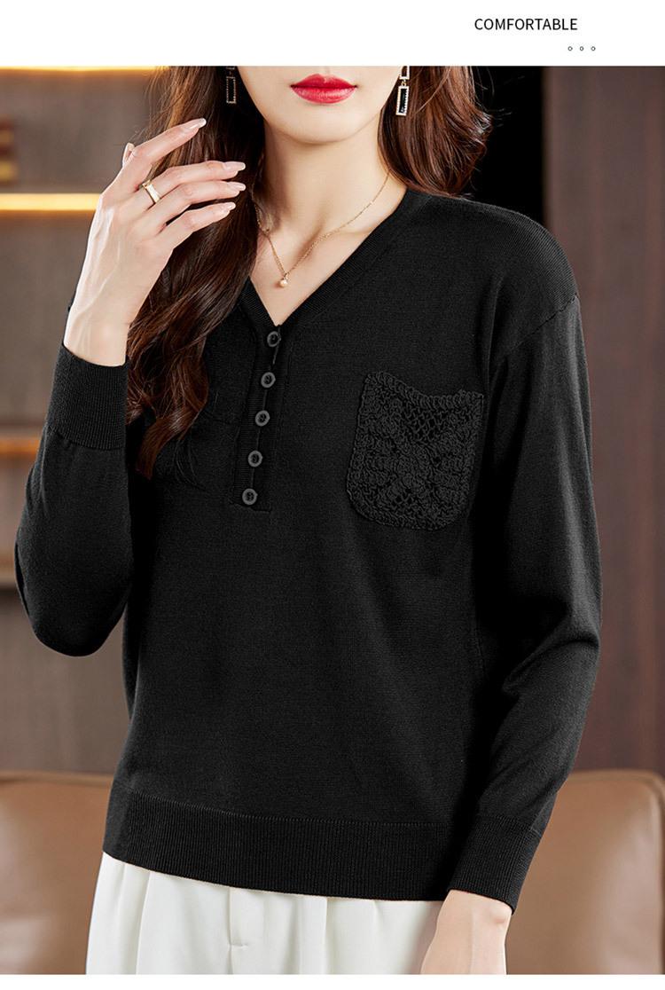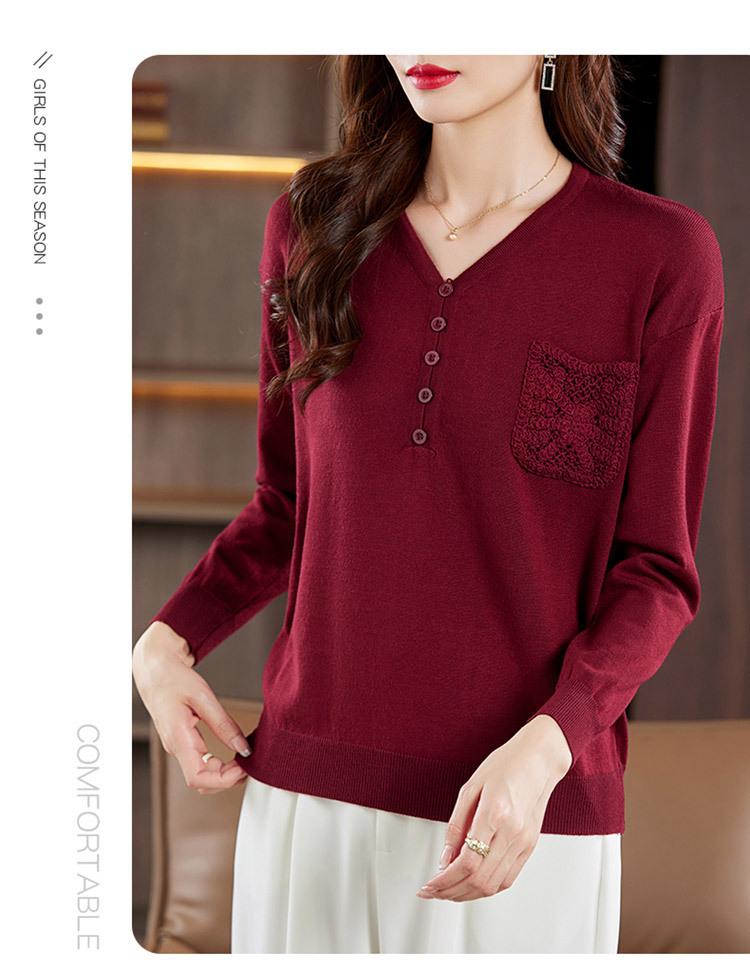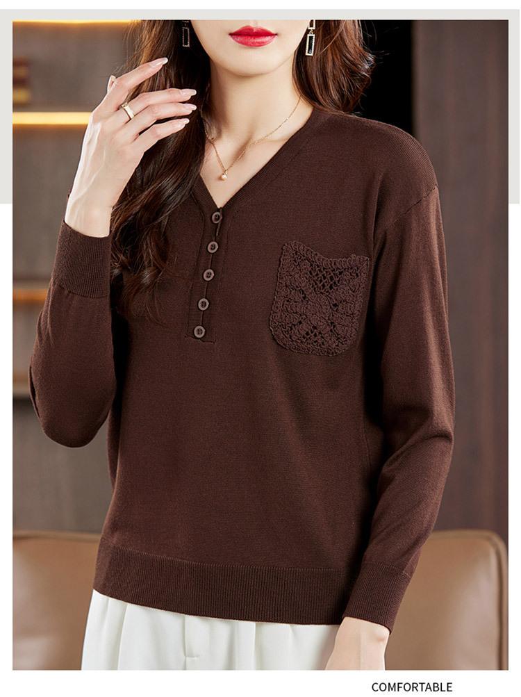 2023 otoño nuevo suéter de punto bordado de color sólido con cuello en V y manga larga para mujer, suéter básico para mamá que combina con todo, top para mujer