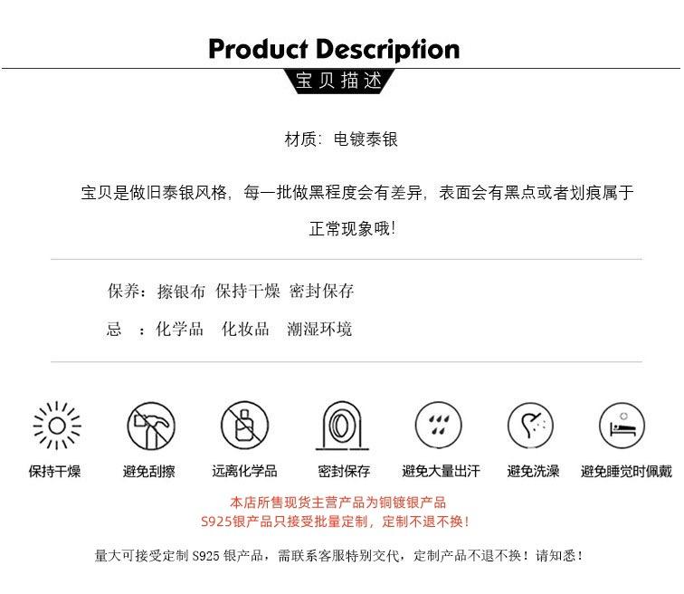 Los principales productos vendidos en nuestra tienda son productos de plata chapada en cobre. Los productos de plata S925 solo se aceptan para personalización al por mayor por parte de los clientes, ¡y la personalización no es reembolsable ni intercambiable!