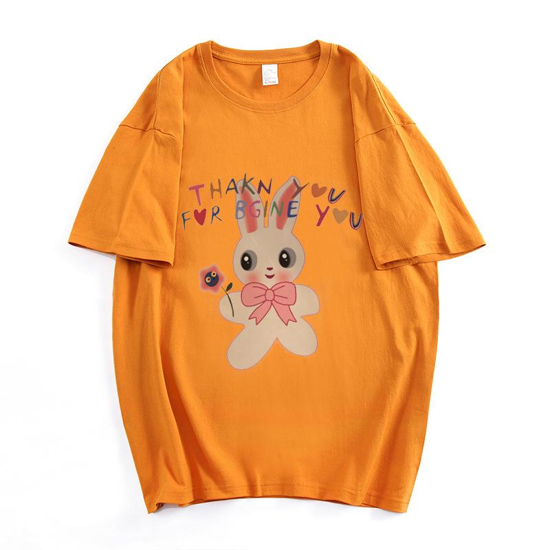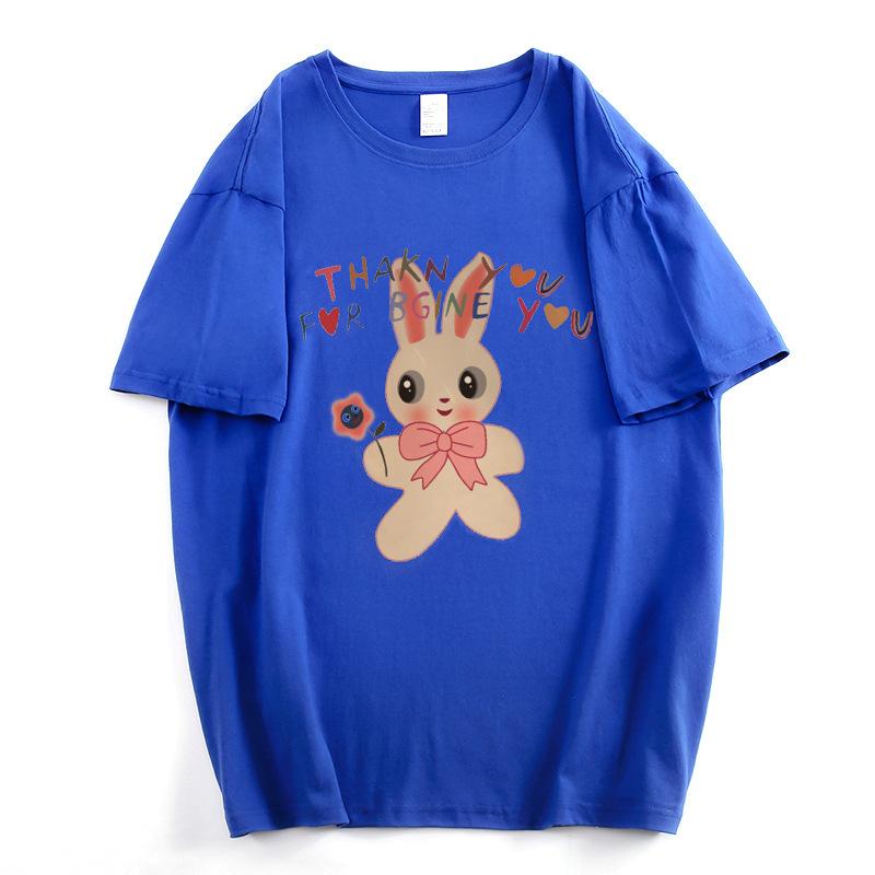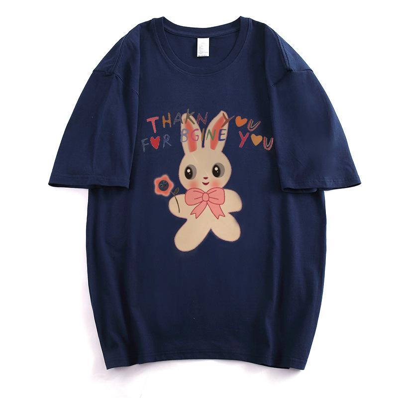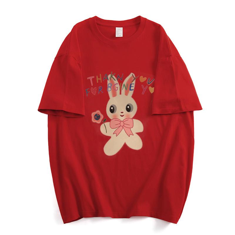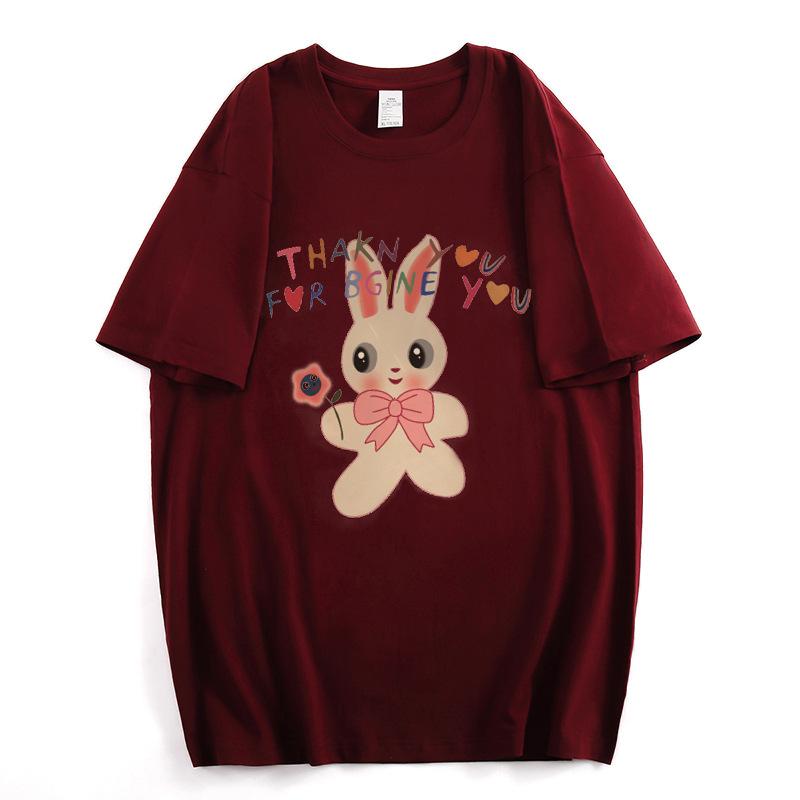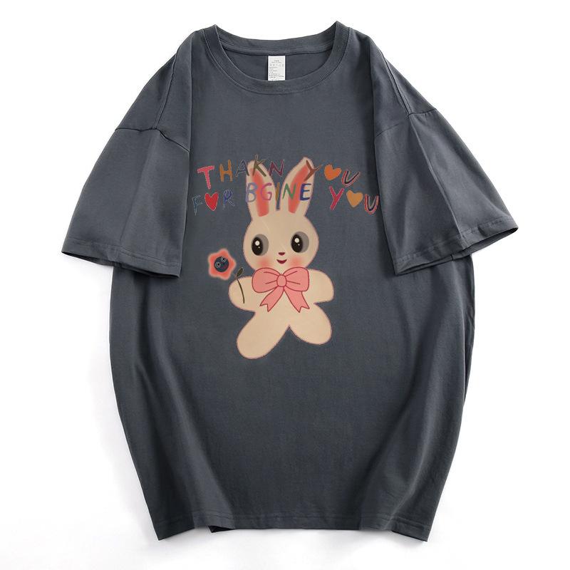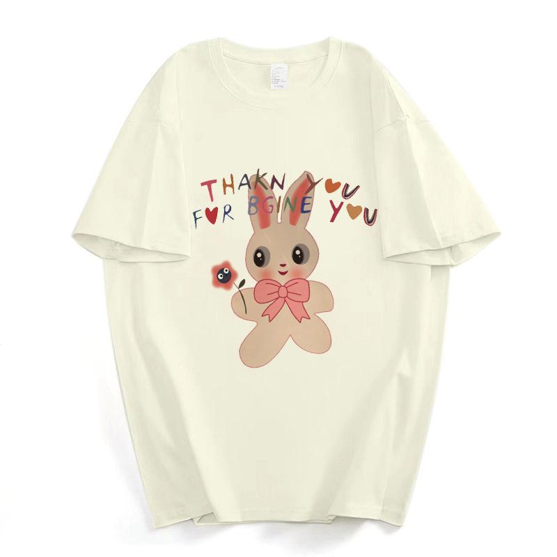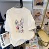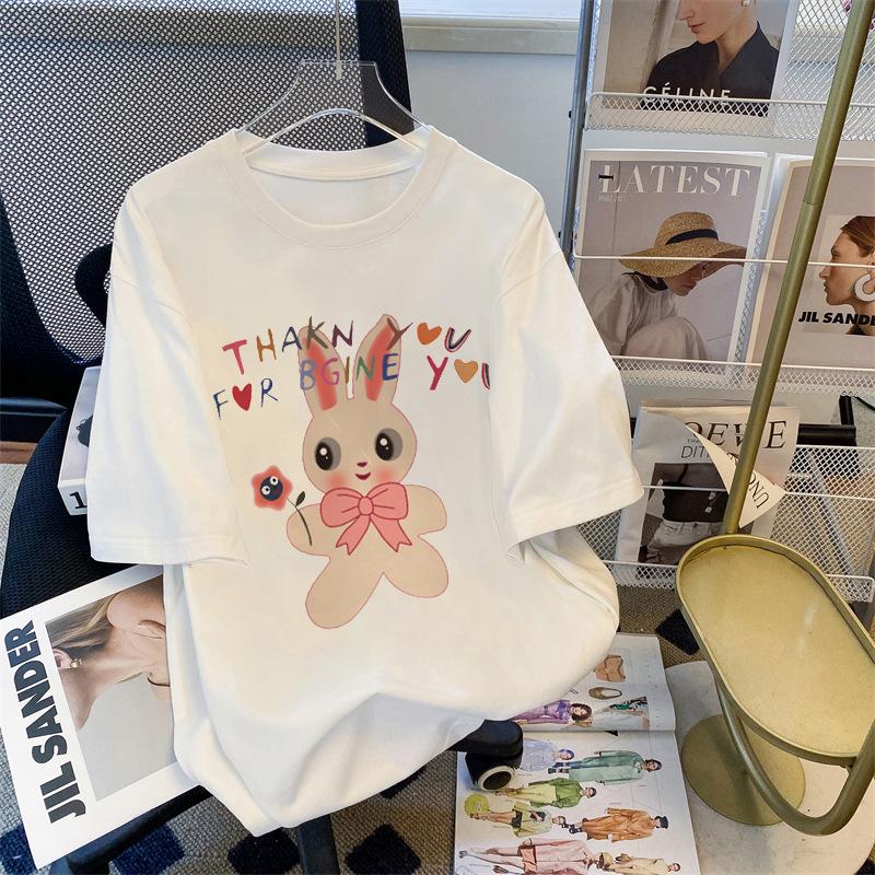 Camiseta de manga corta con cuello de algodón y estampado de conejo blanco para mujer, nueva camiseta de verano holgada de largo medio, informal, combinable con todo.