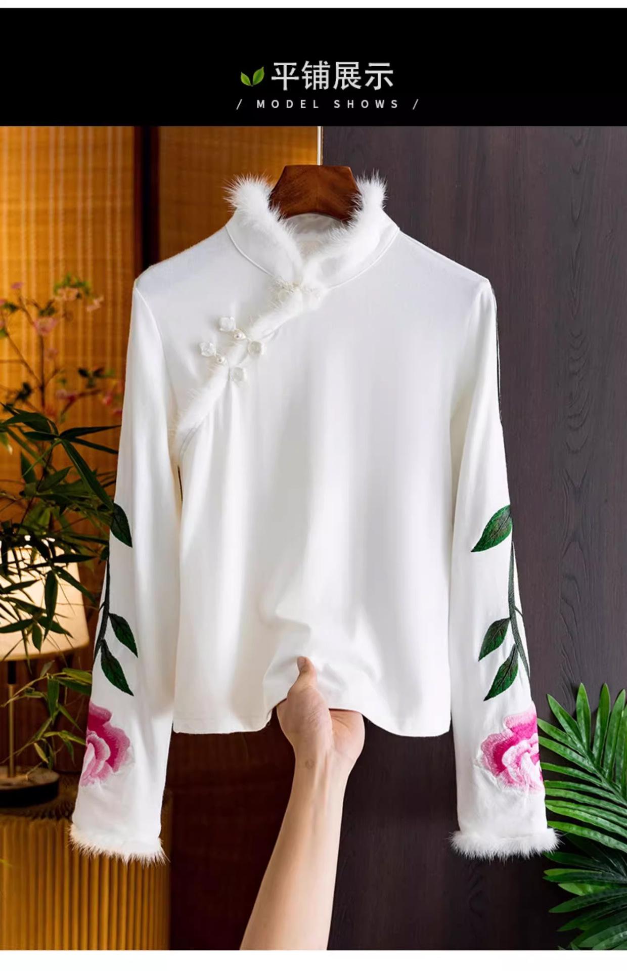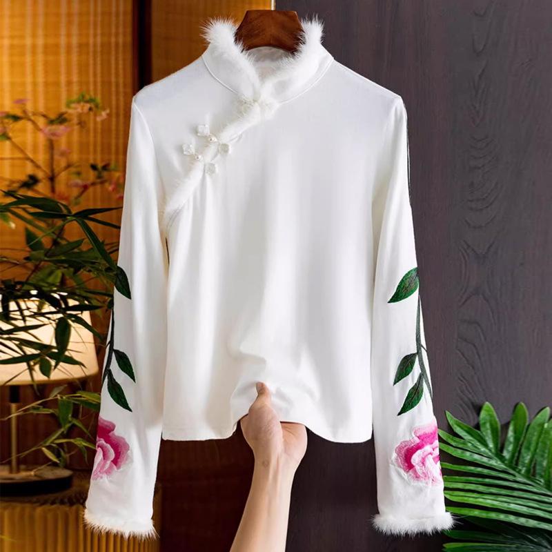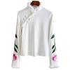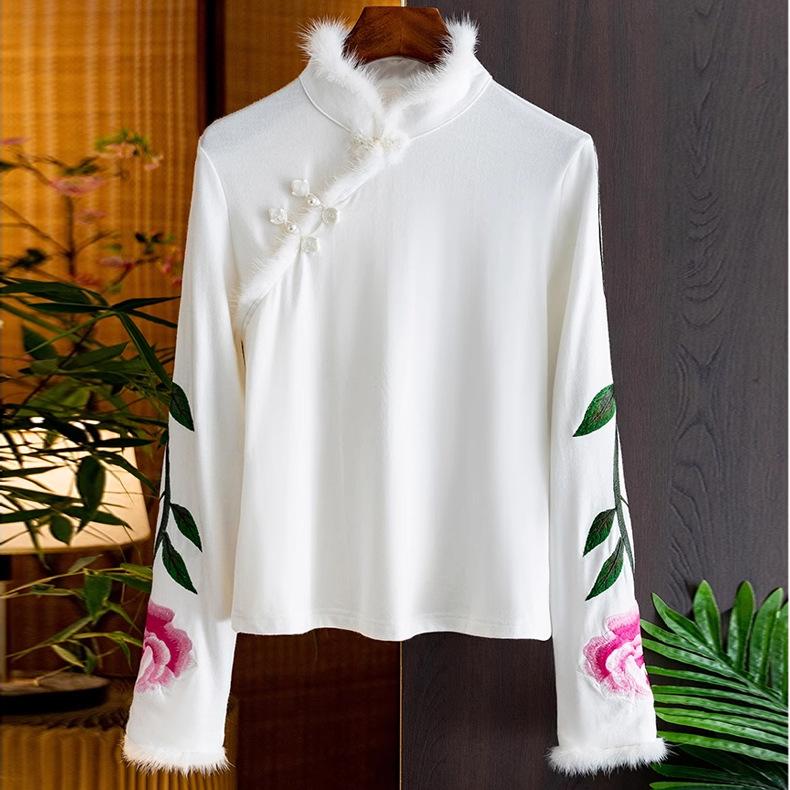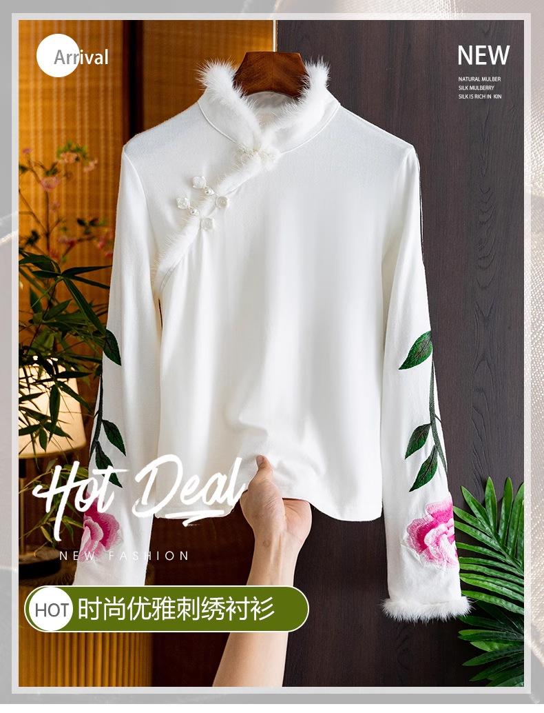 Camisa Vintage de Nuevo Estilo Chino Base Blanca para Mujer 2023 Otoño e Invierno Nueva Moda Elegante Bordado de Industria Pesada Cuello Top