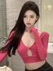 Camiseta rosa de cuello en V sexy de manga larga para mujer, otoño, dulce chica picante, elástica, calada, corta, ajustada, top ajustado, camiseta básica