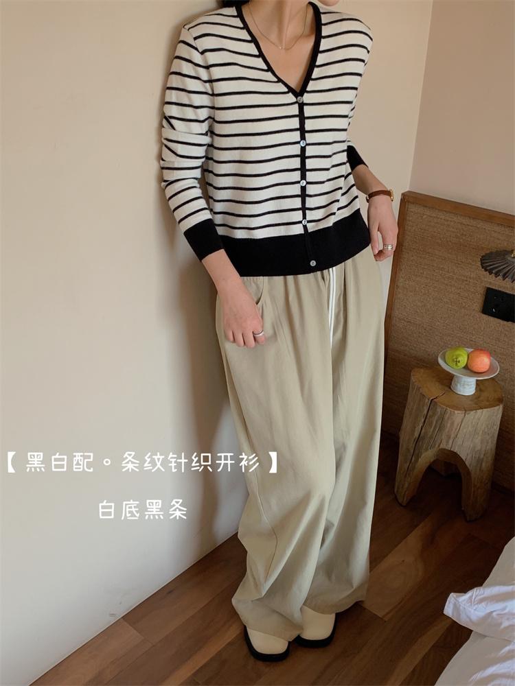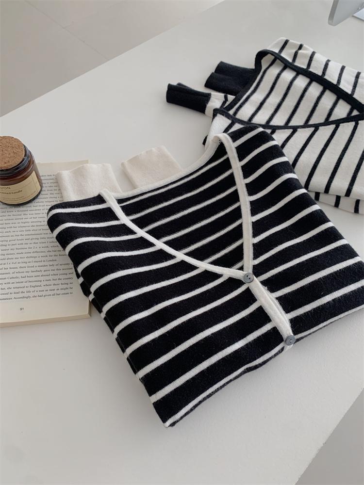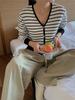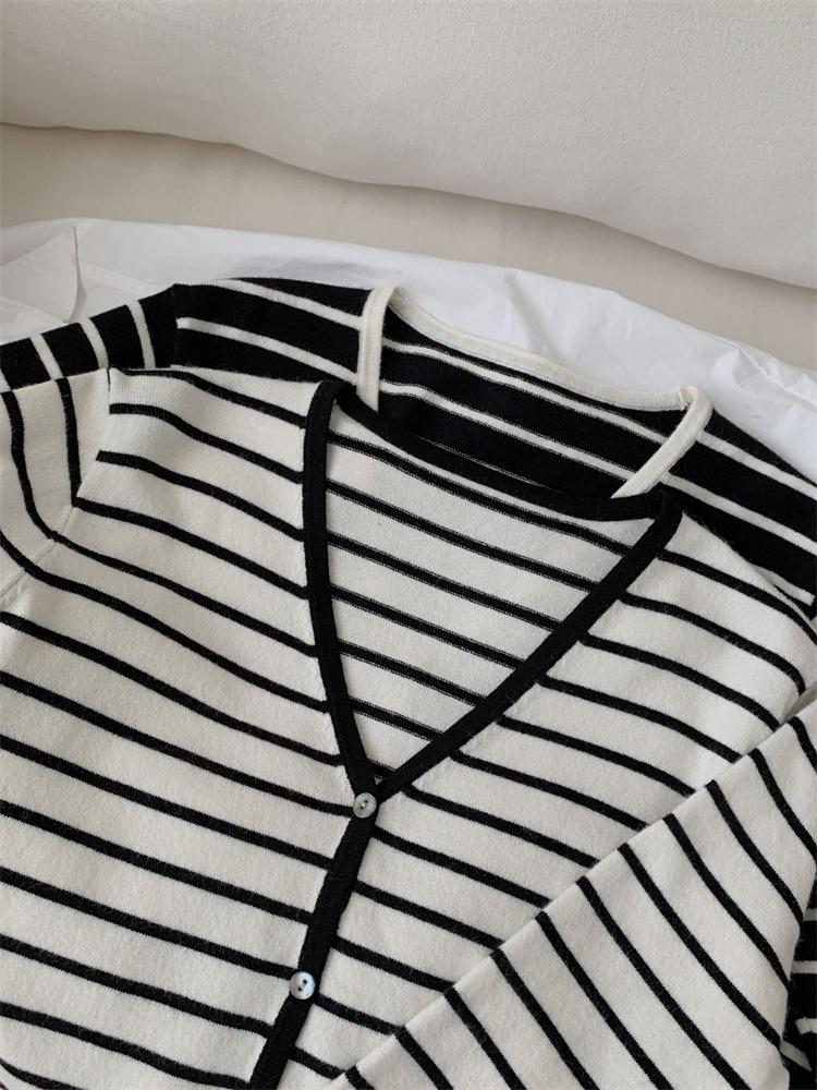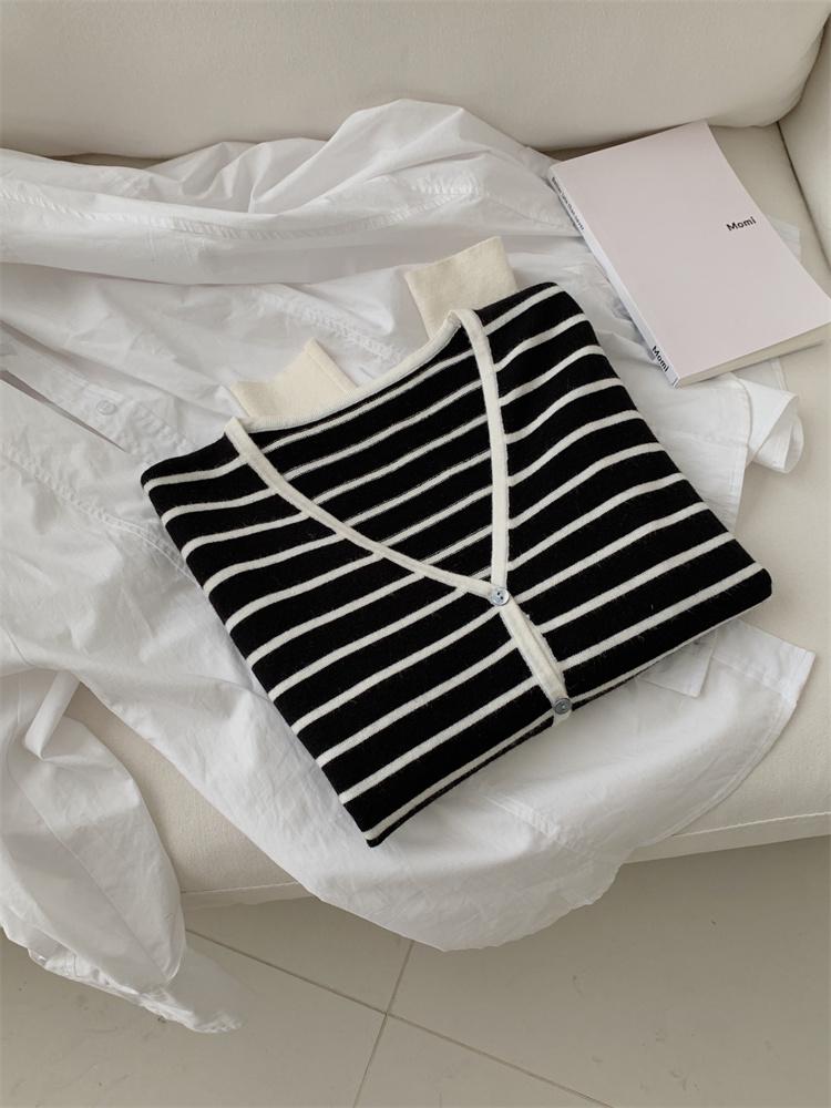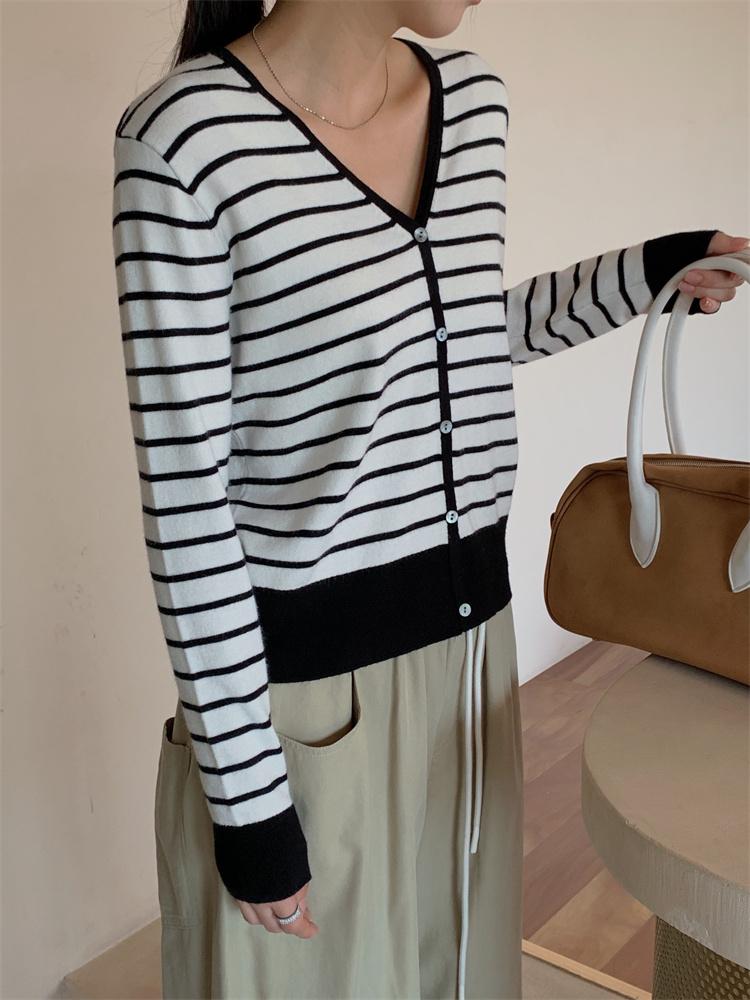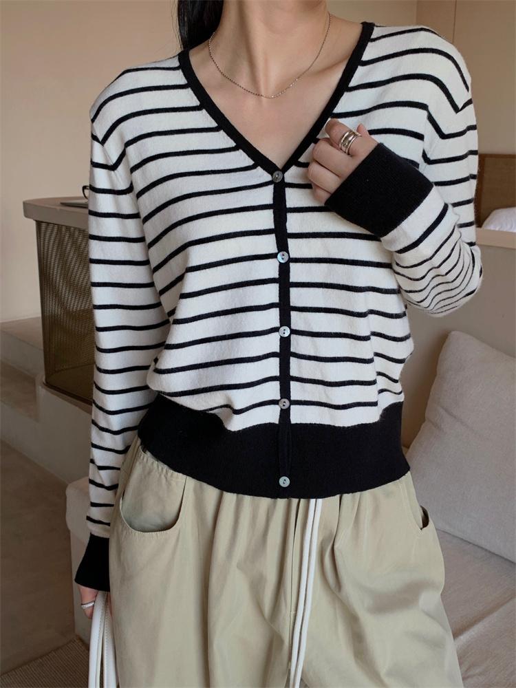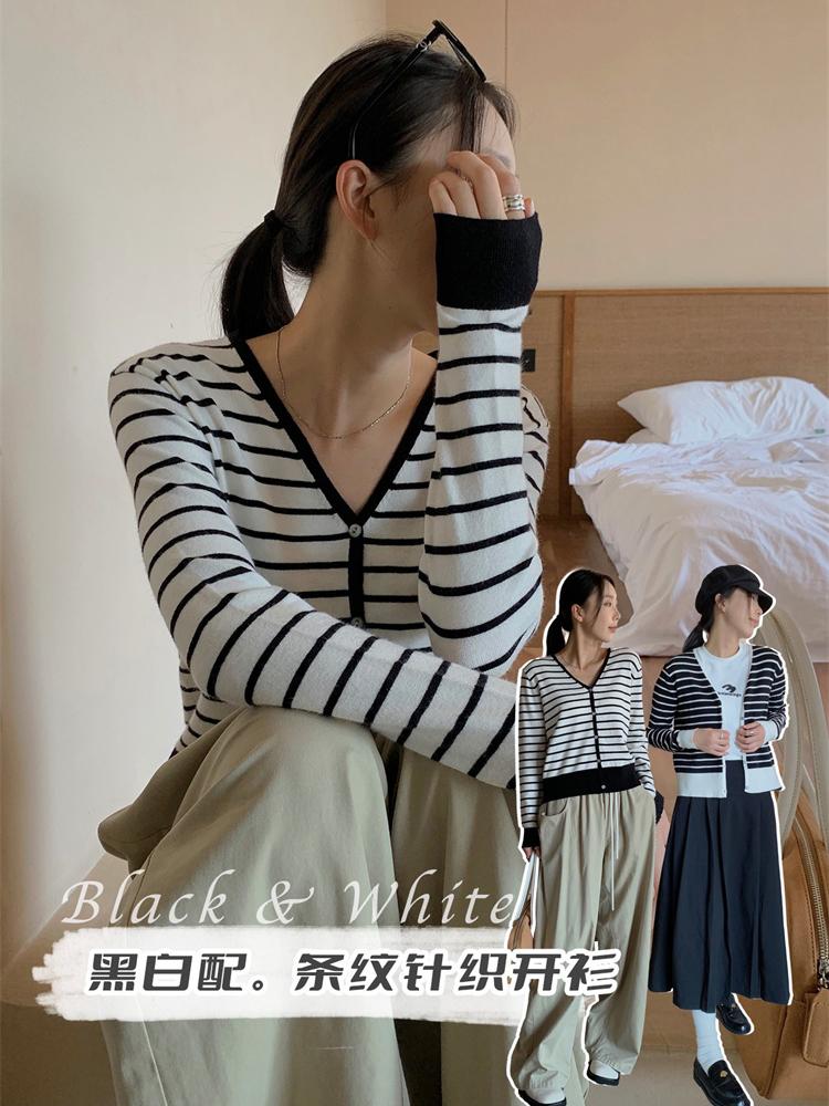 Cárdigan de punto con escote en V a rayas en blanco y negro para mujer, abrigo corto versátil, holgado y adelgazante de primavera y otoño para mujer