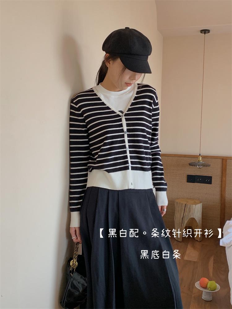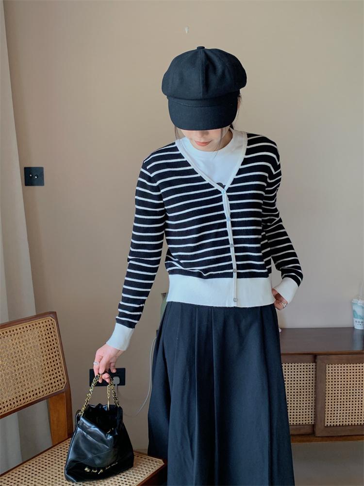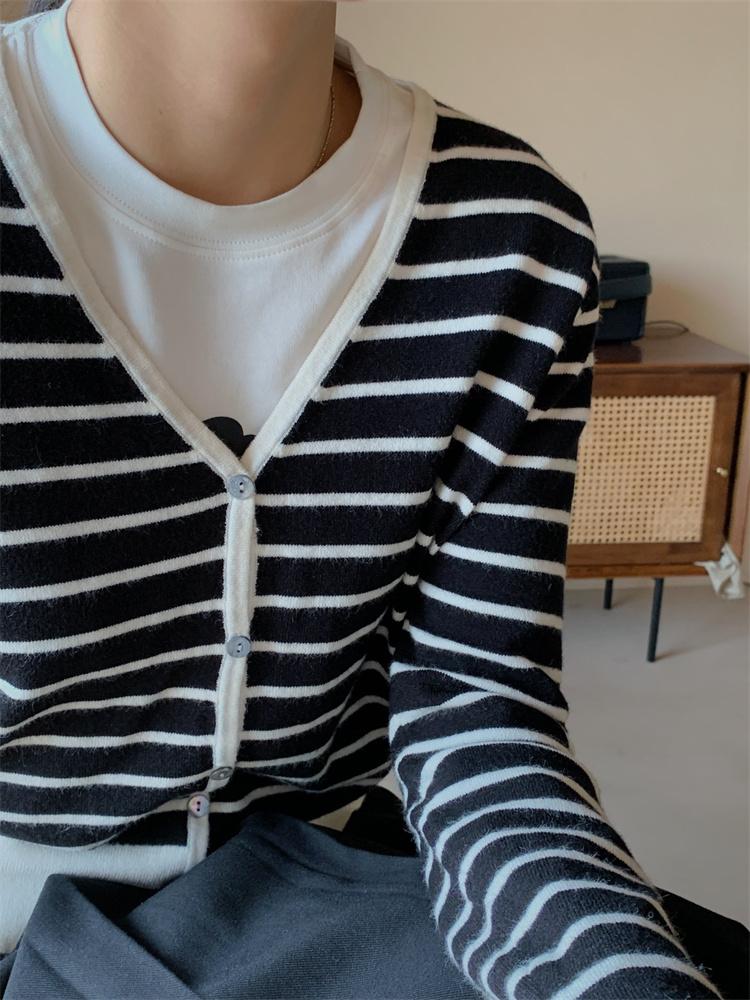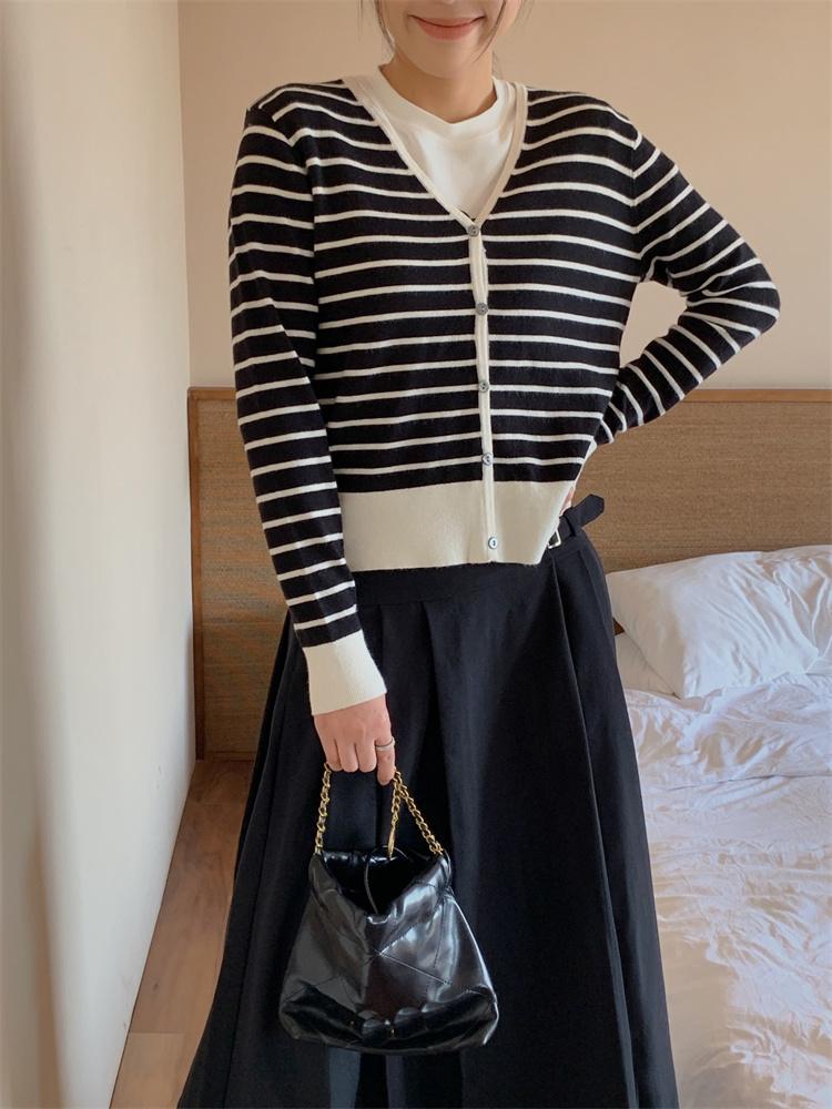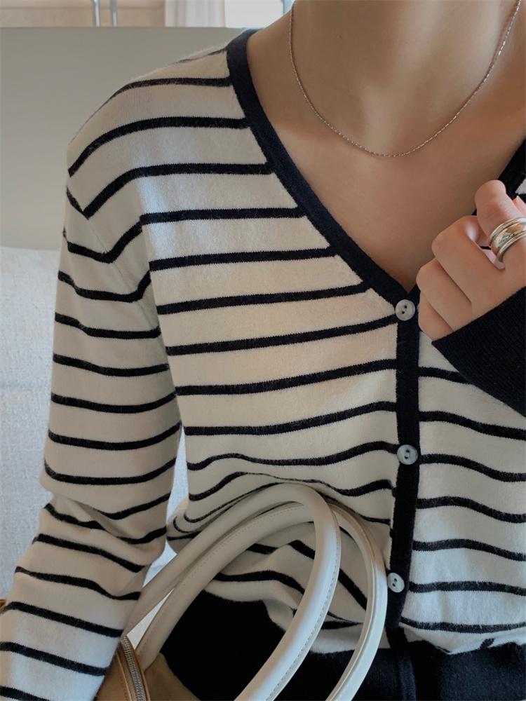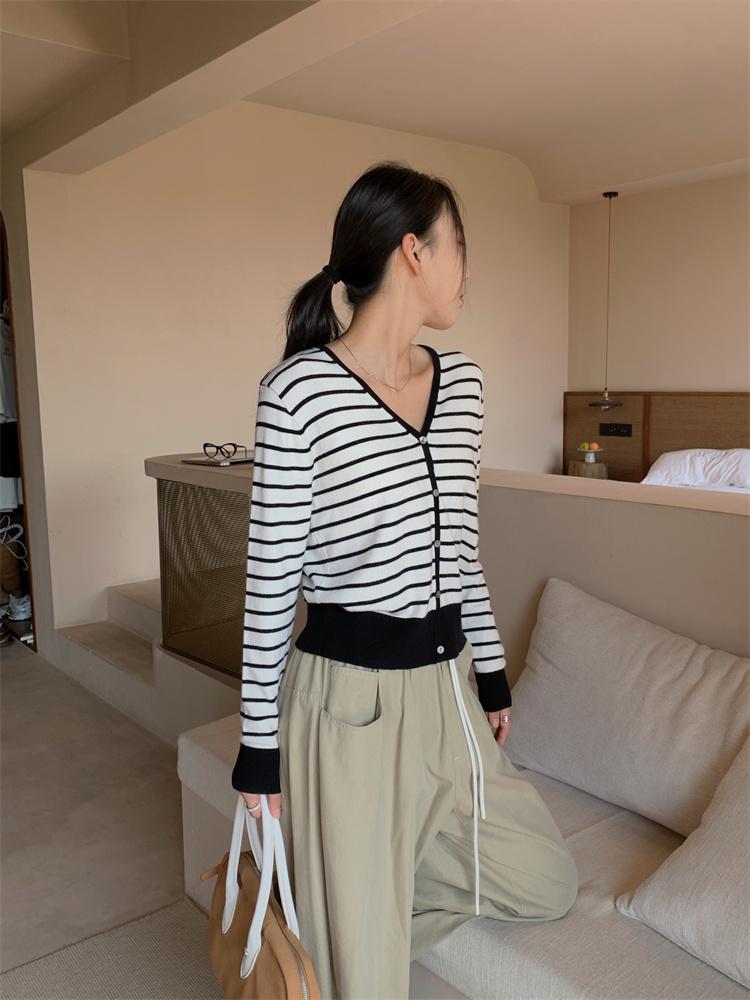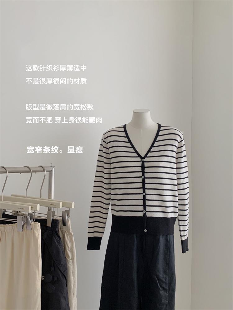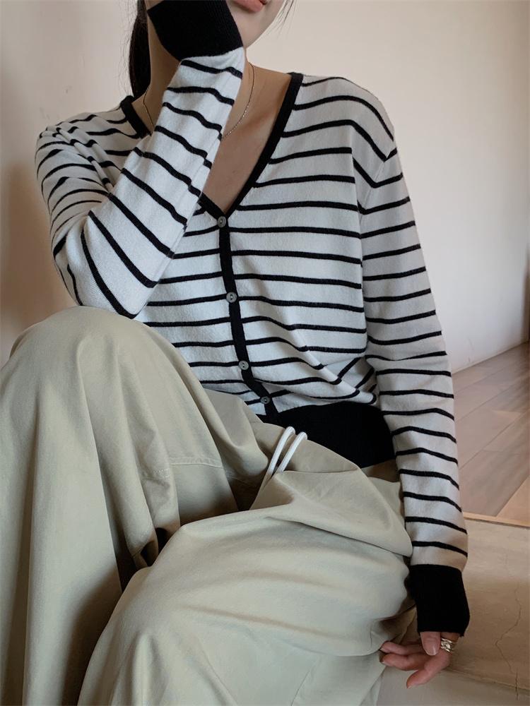 Cárdigan de punto con escote en V a rayas en blanco y negro para mujer, abrigo corto versátil, holgado y adelgazante de primavera y otoño para mujer