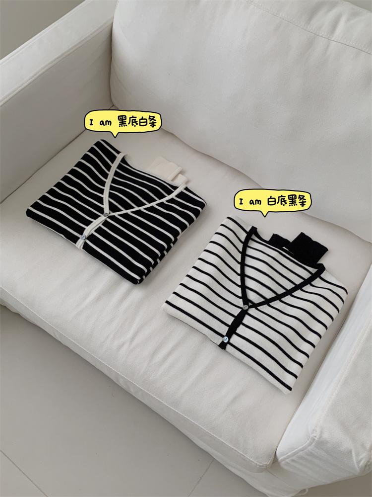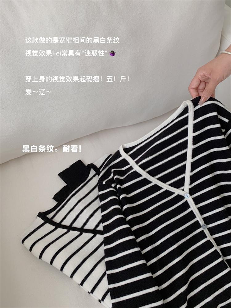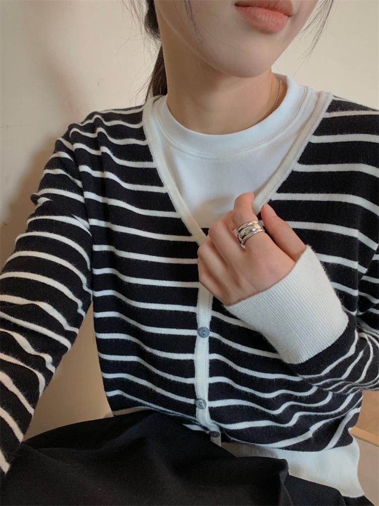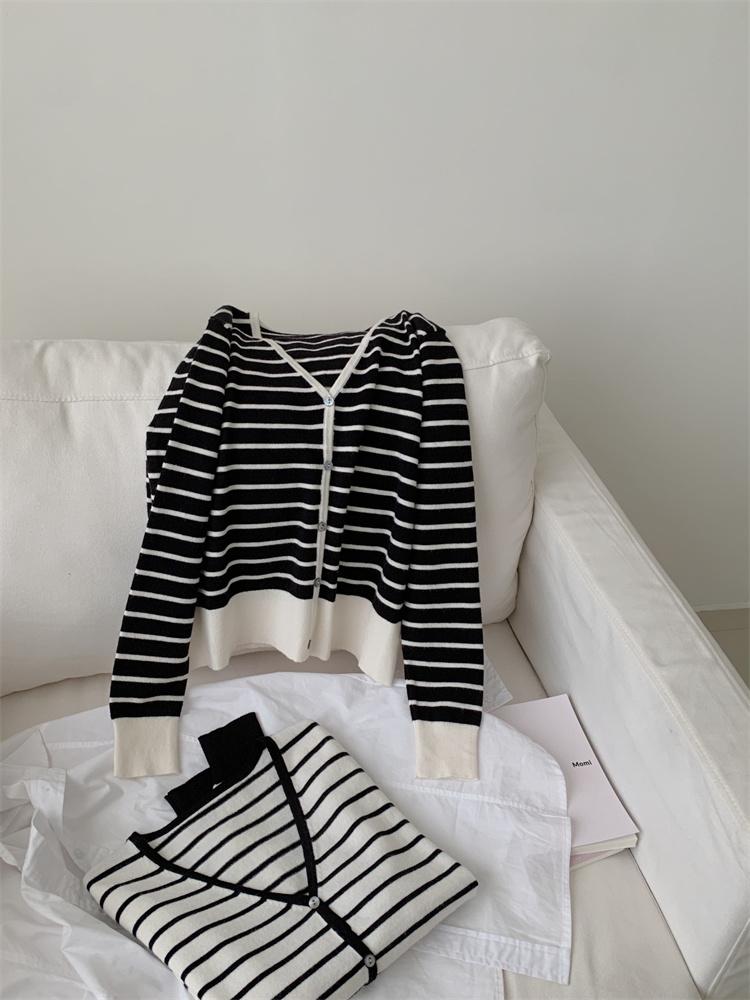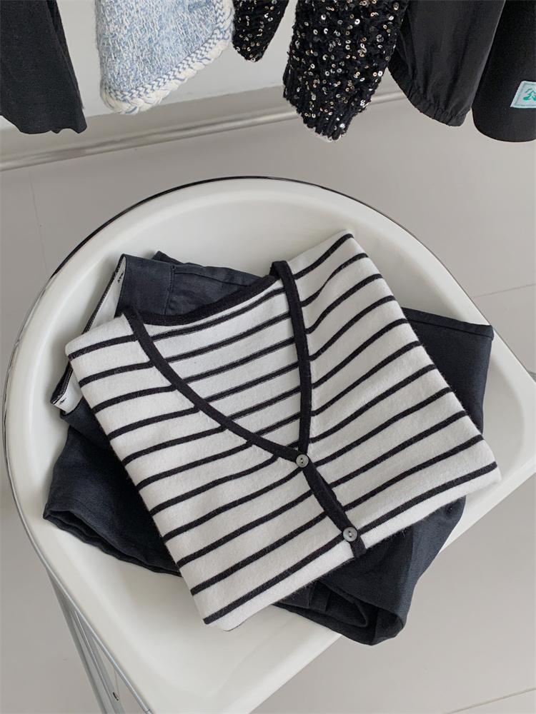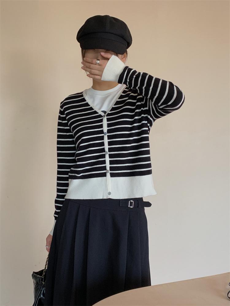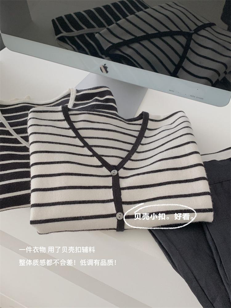 Cárdigan de punto con escote en V a rayas en blanco y negro para mujer, abrigo corto versátil, holgado y adelgazante de primavera y otoño para mujer