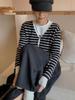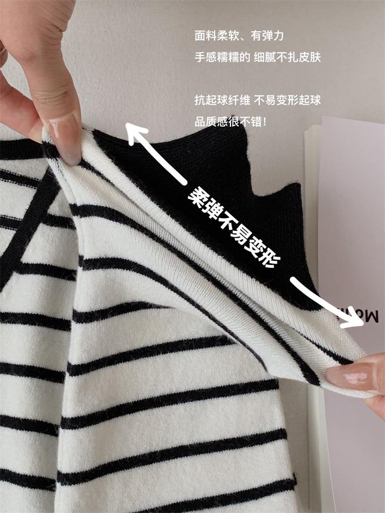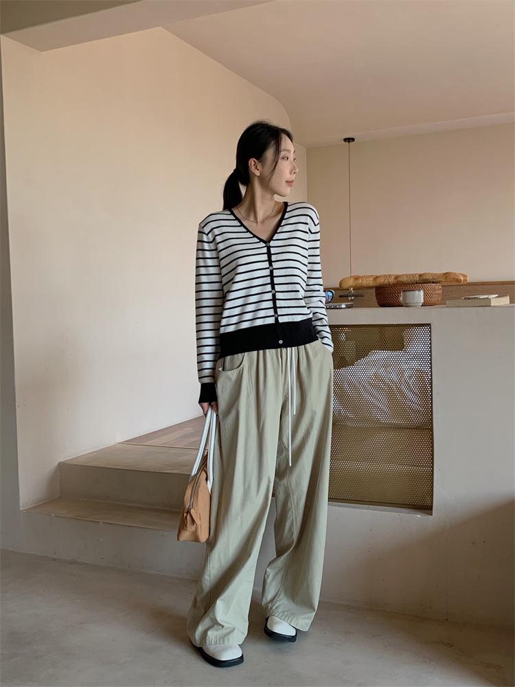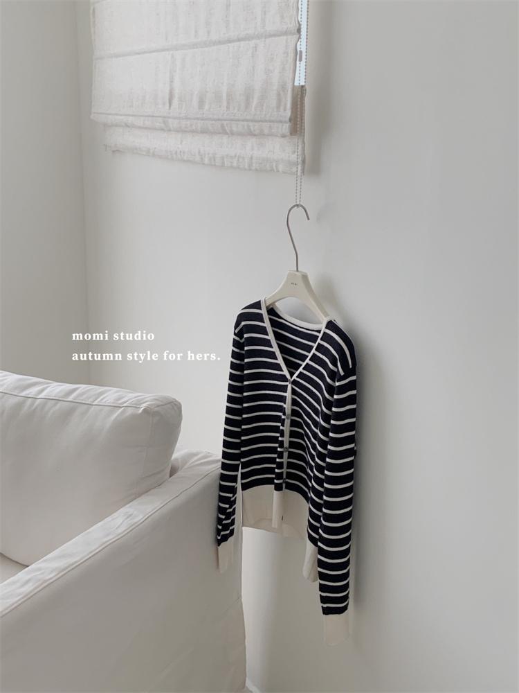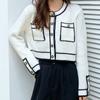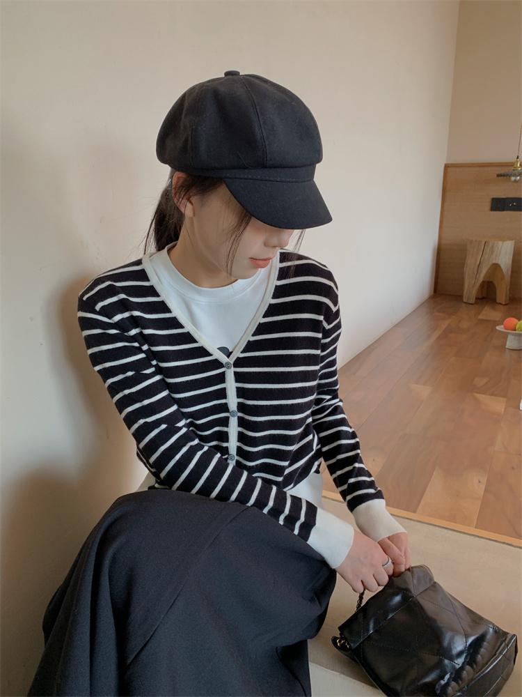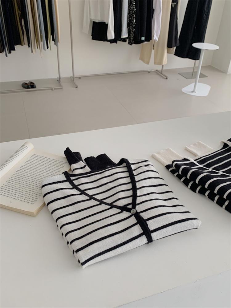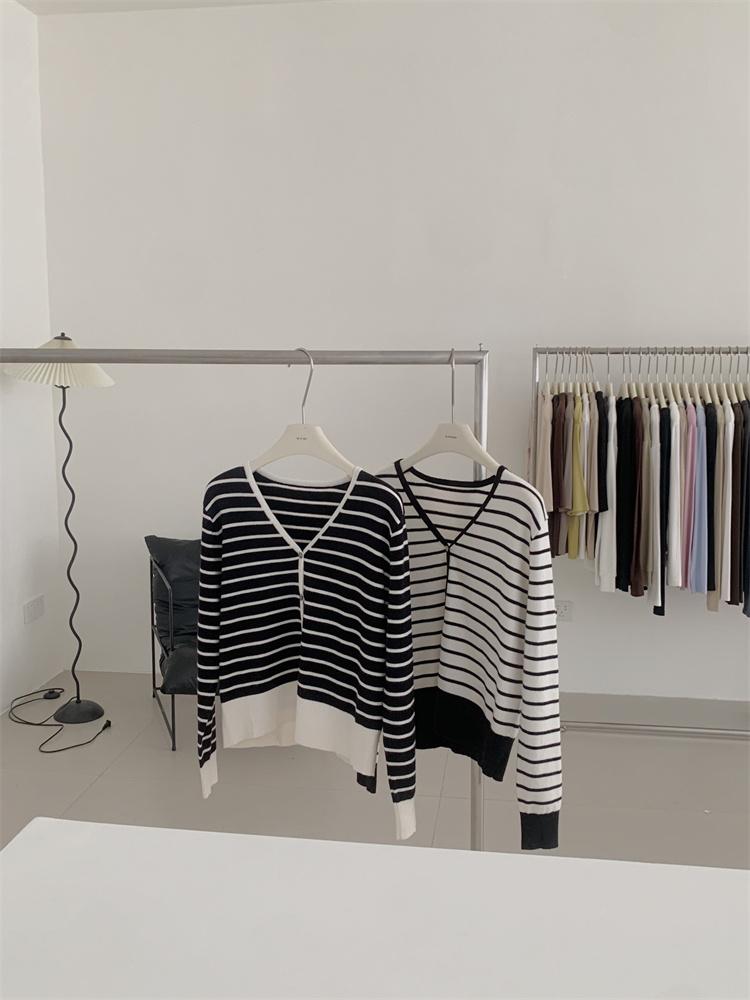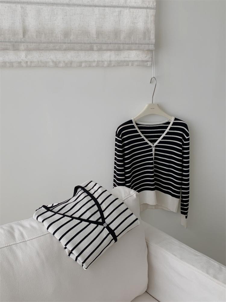 Cárdigan de punto con escote en V a rayas en blanco y negro para mujer, abrigo corto versátil, holgado y adelgazante de primavera y otoño para mujer