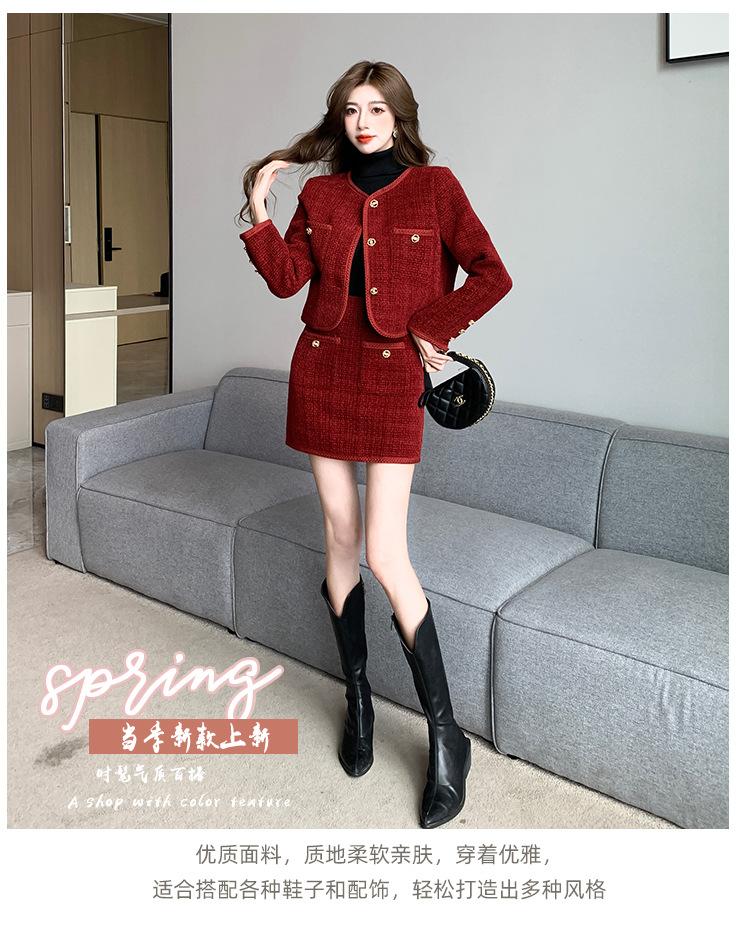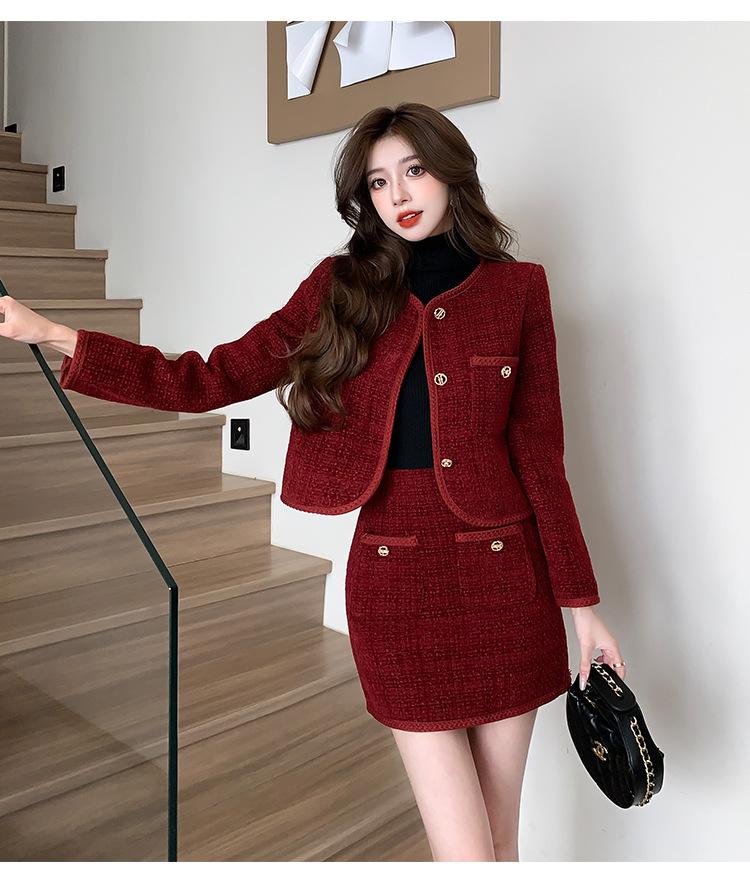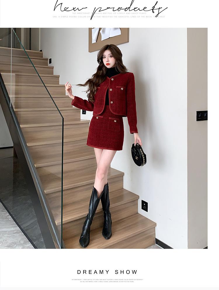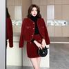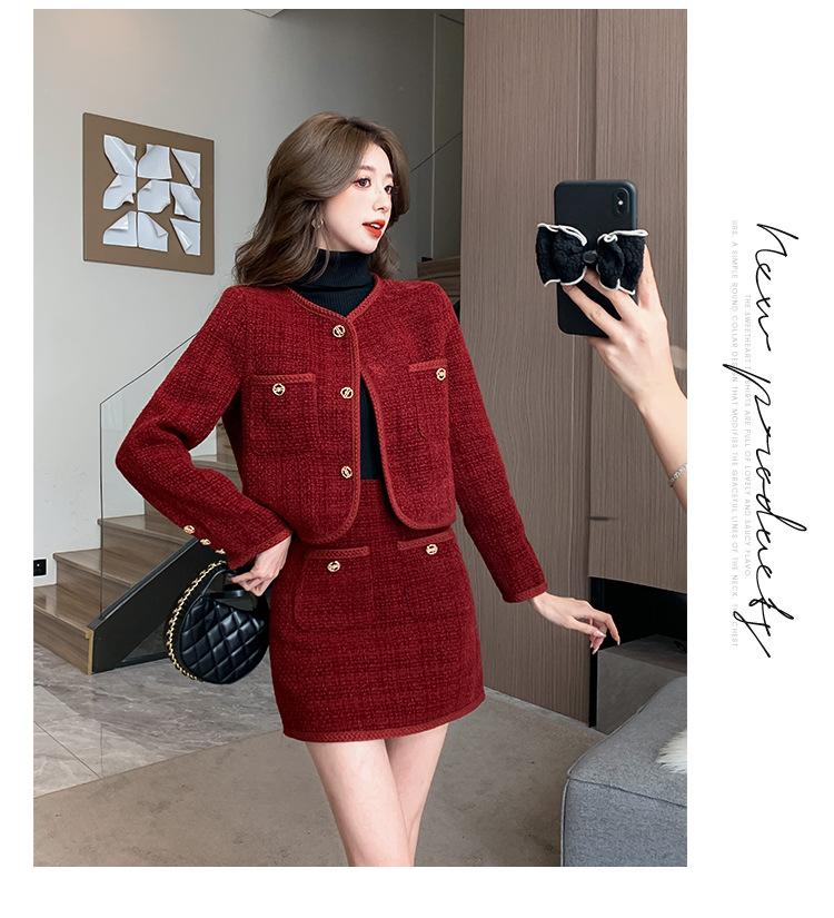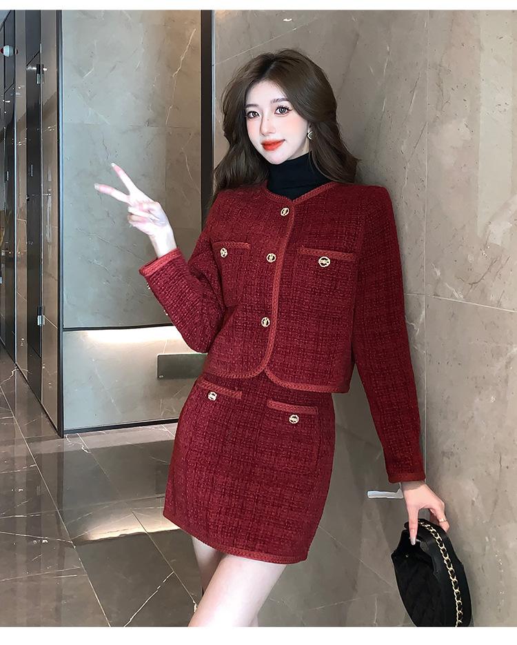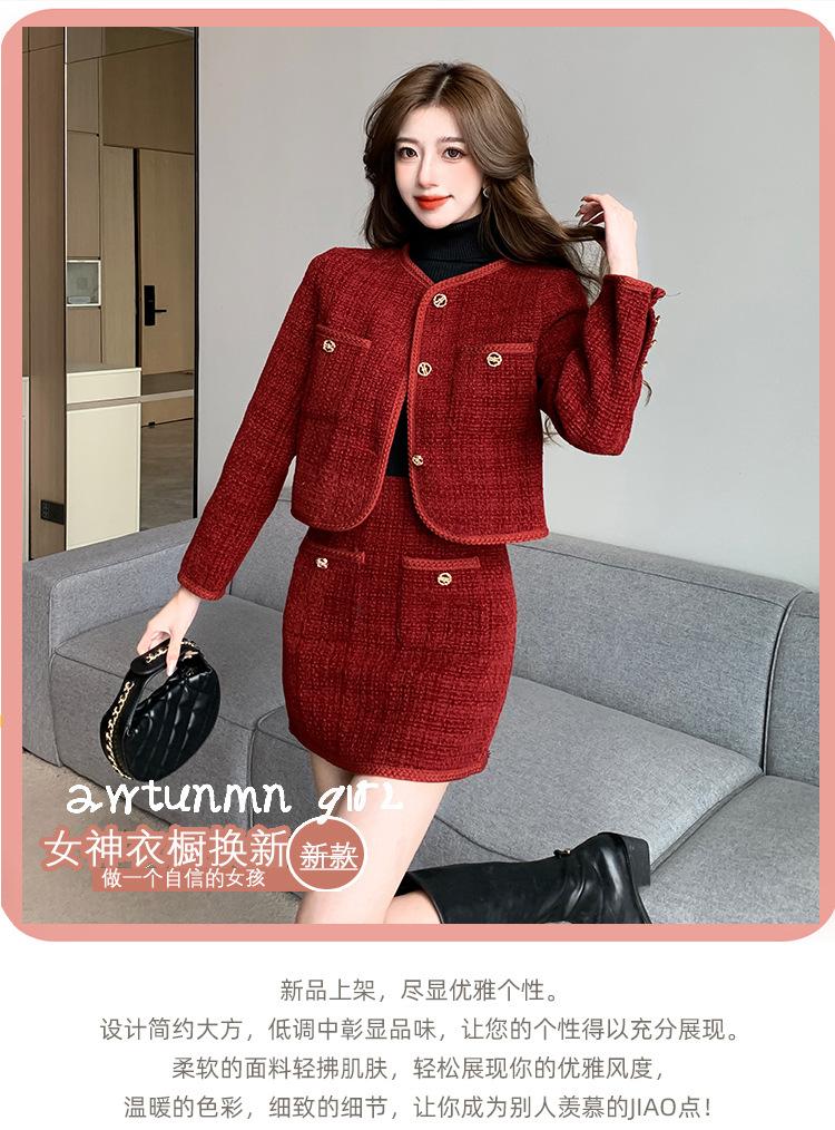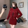 Traje de estilo rojo pequeño fragante de tiro real otoño e invierno 2025 nuevo pequeño temperamento estilo socialité falda de dos piezas