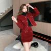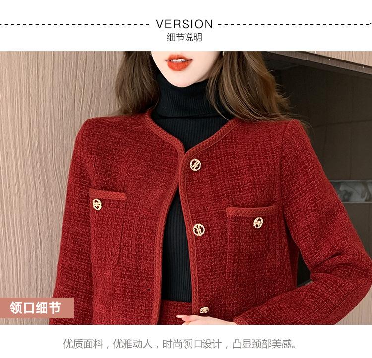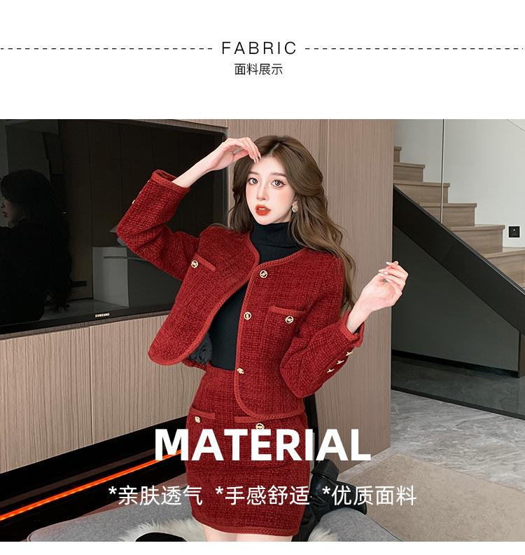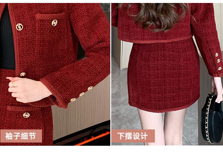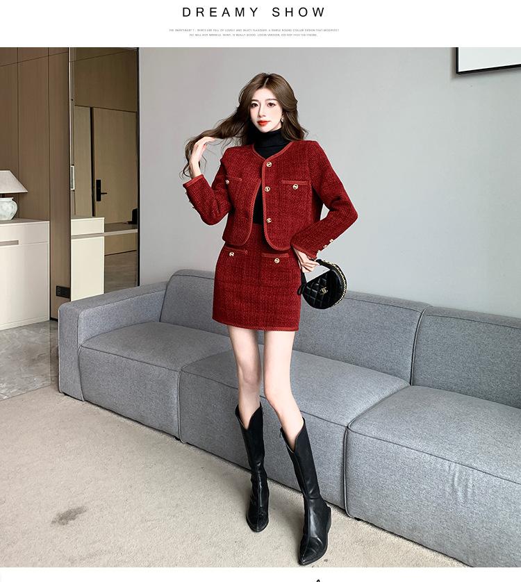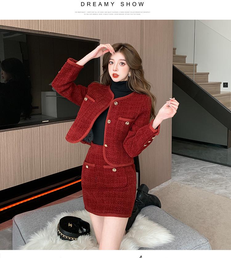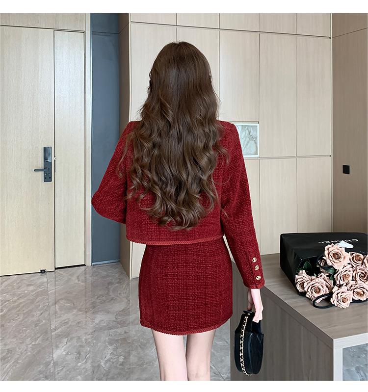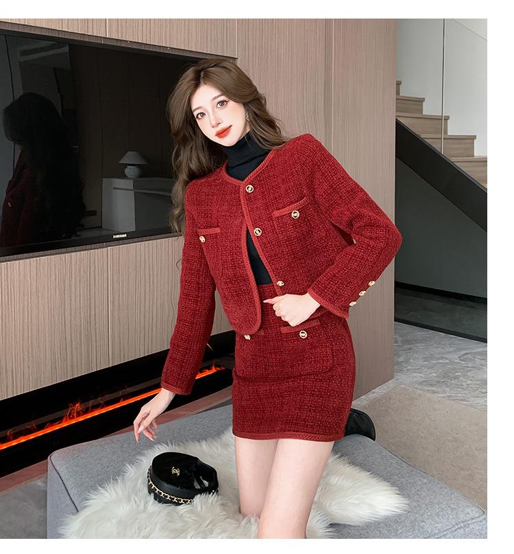 Traje de estilo rojo pequeño fragante de tiro real otoño e invierno 2025 nuevo pequeño temperamento estilo socialité falda de dos piezas