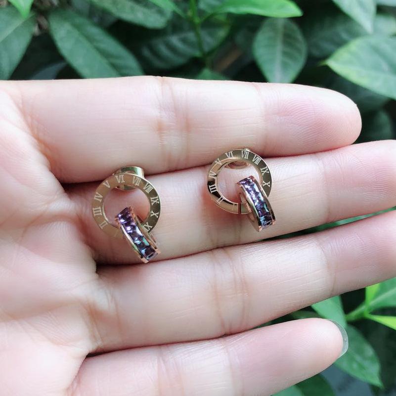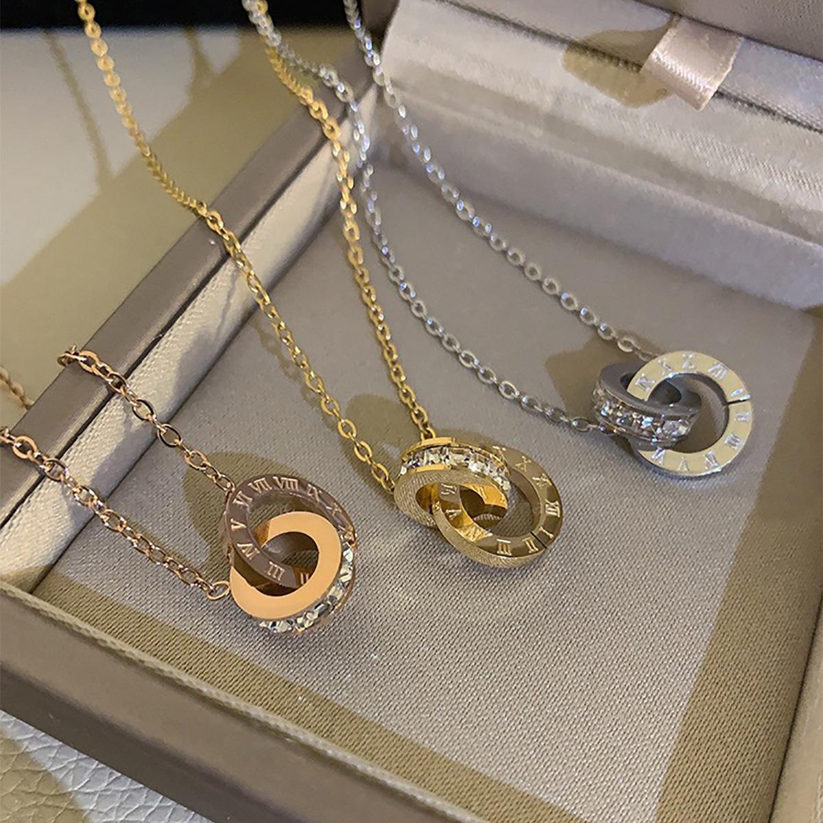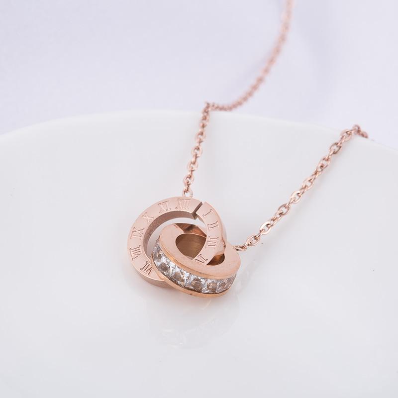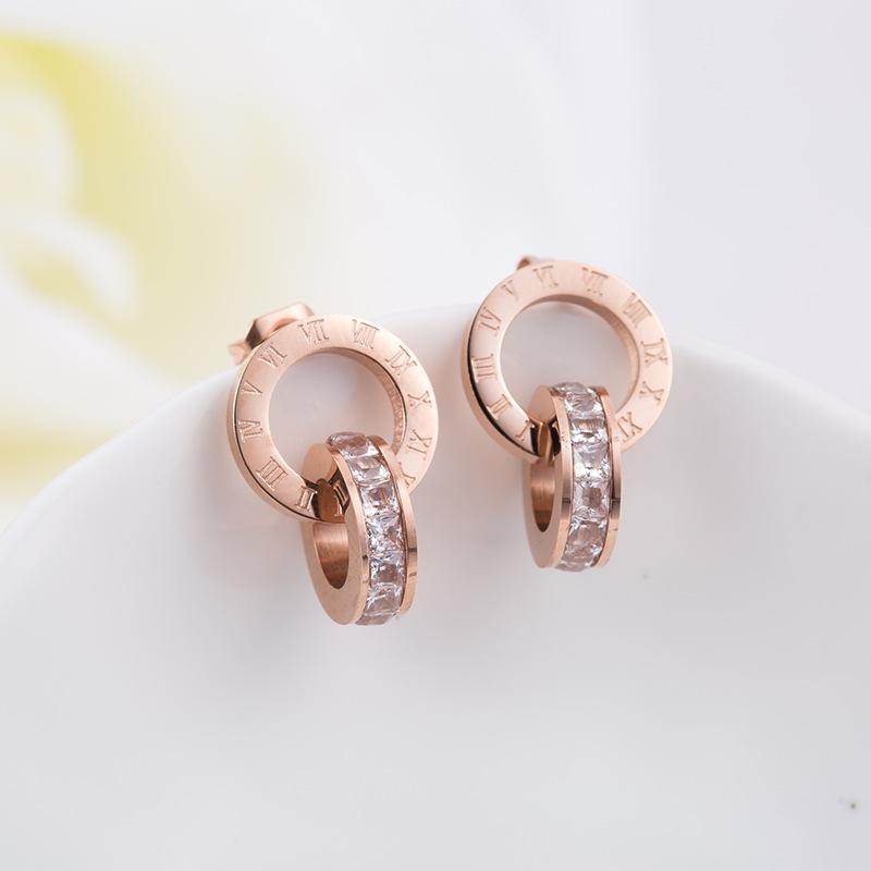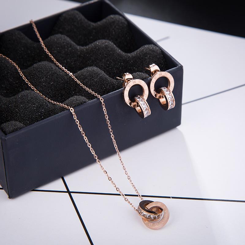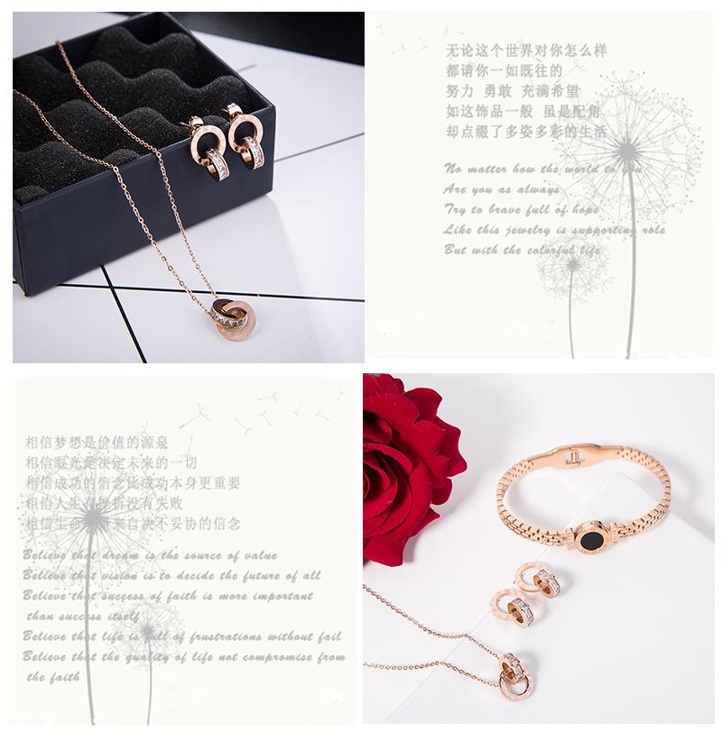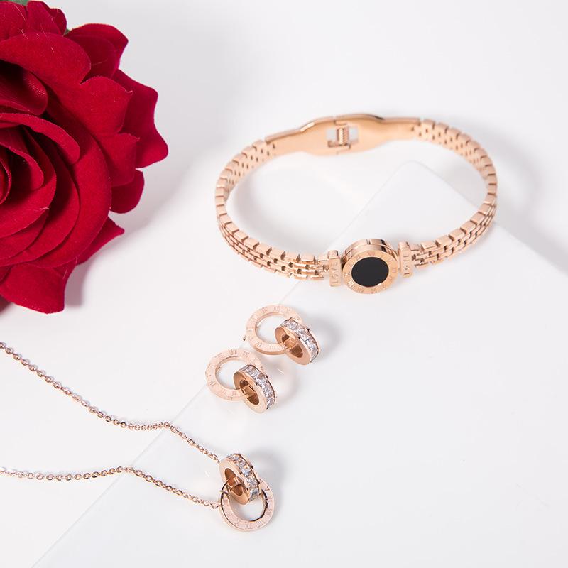 Nuevo collar europeo y americano de acero de titanio para mujer, aretes de botón de oro rosa, pulsera de moda, anillo doble romano, juego de joyas, entrega de una pieza