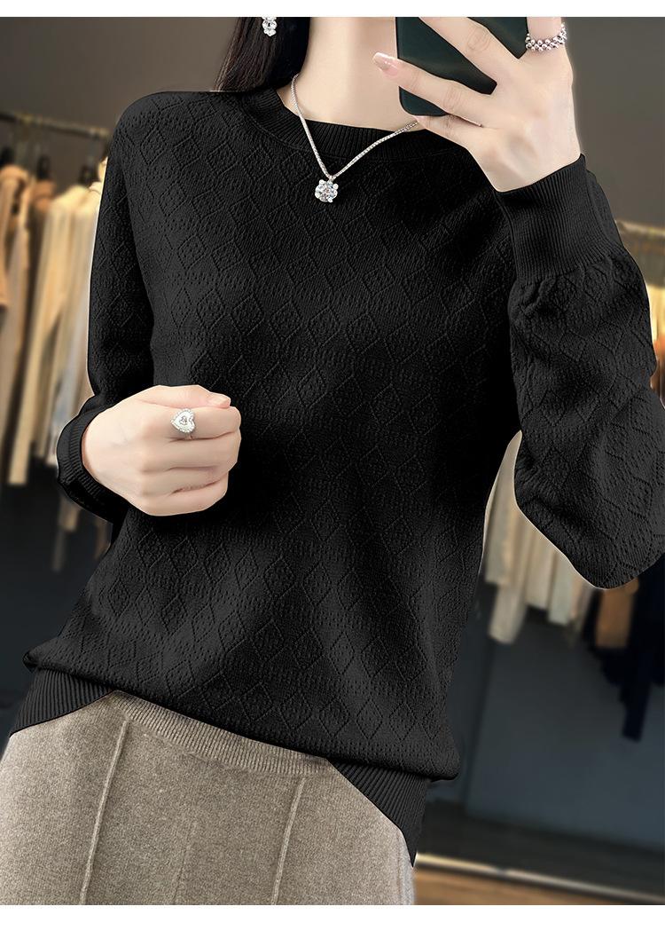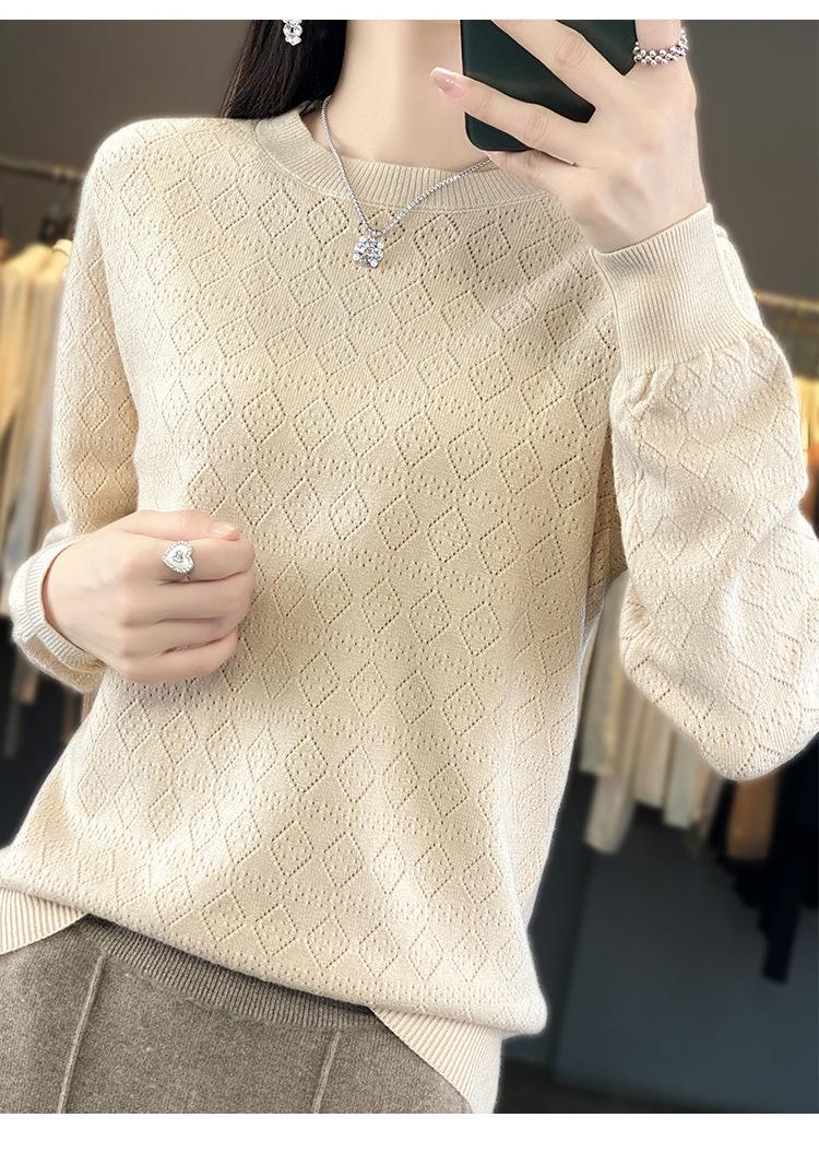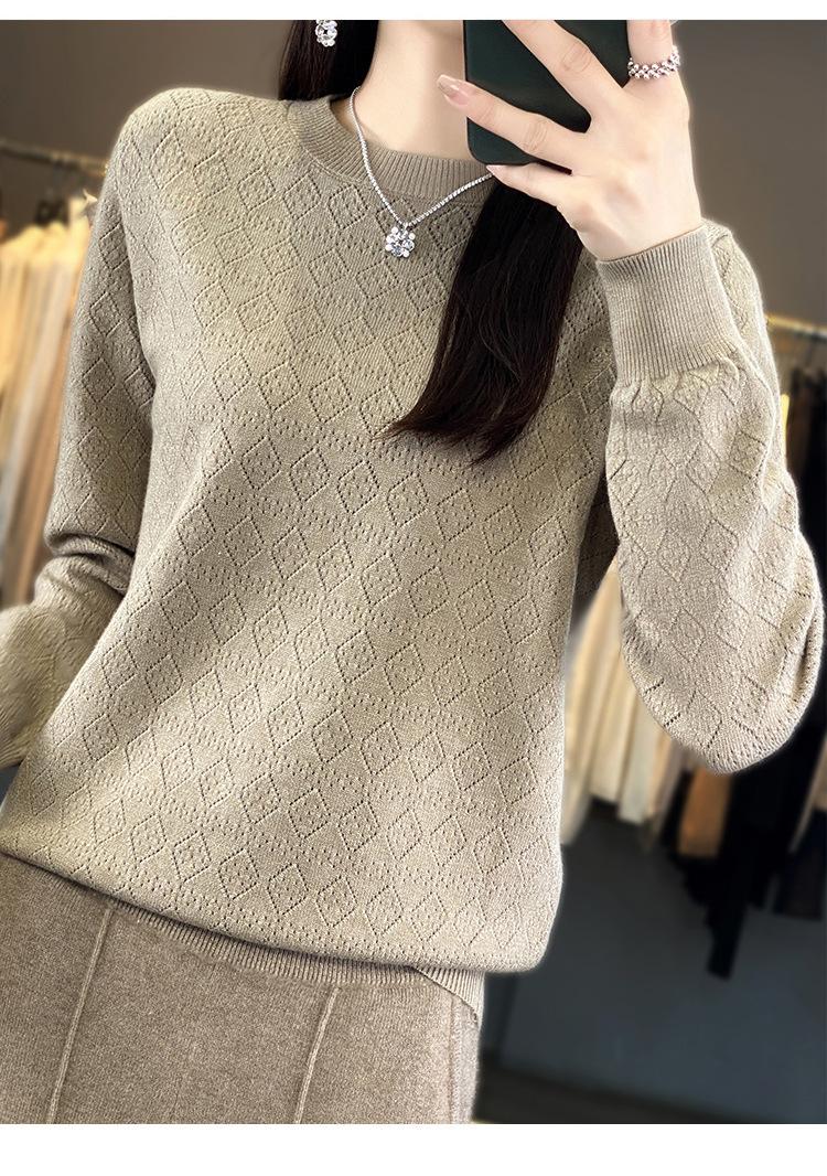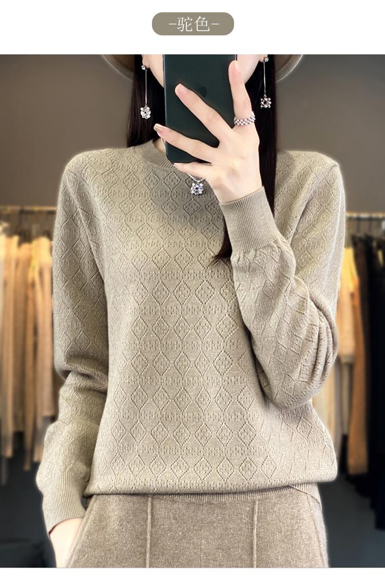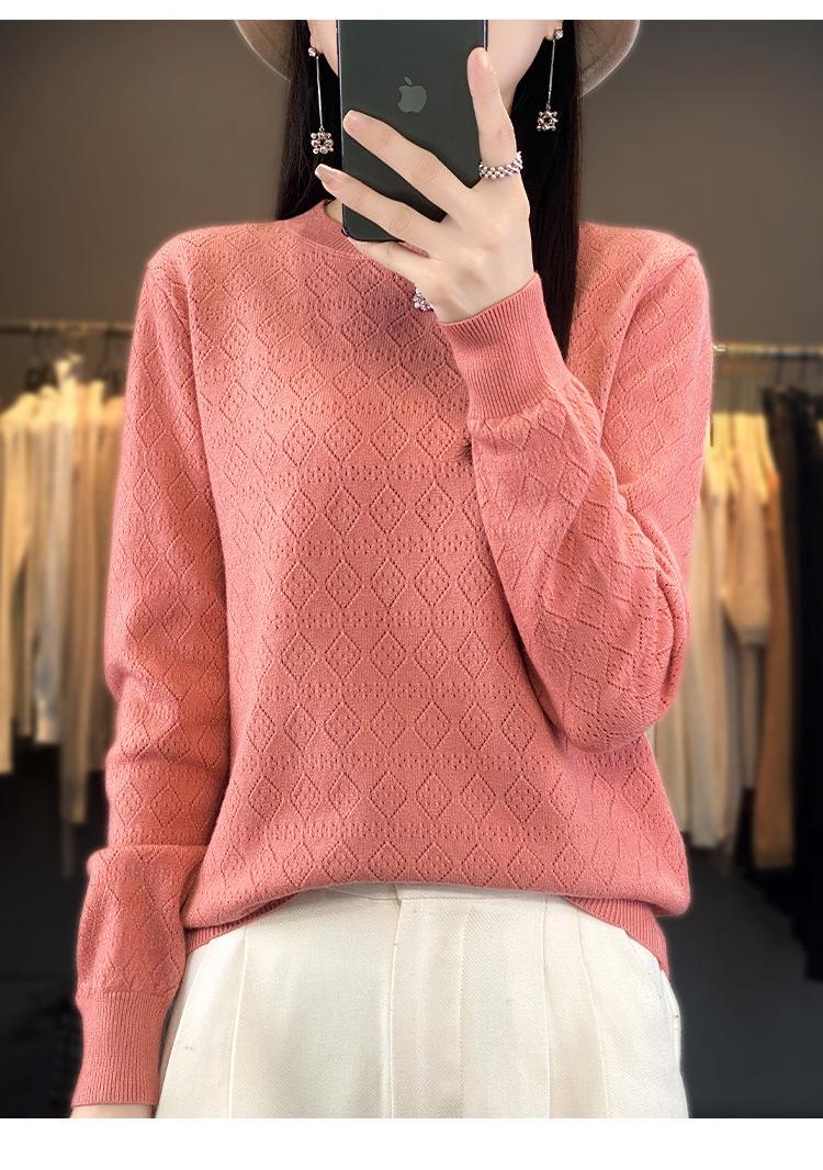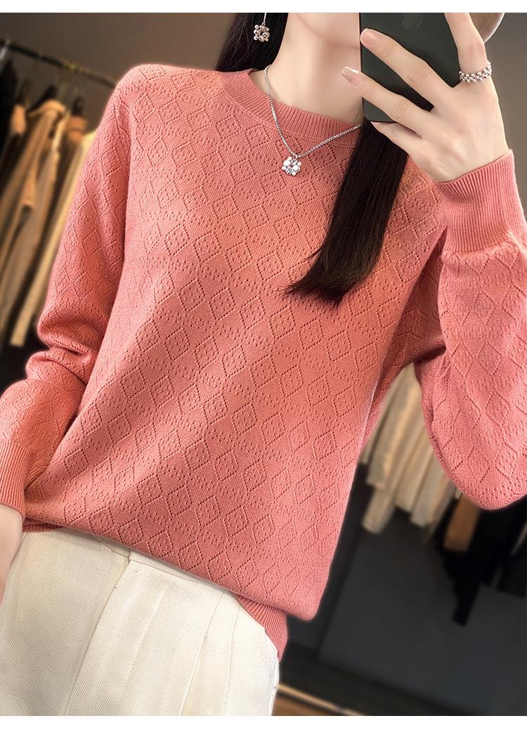 Suéter de cuello redondo hueco para mujer, suéter de manga larga, color sólido, camisa de base de terciopelo Andy, top de otoño 2023