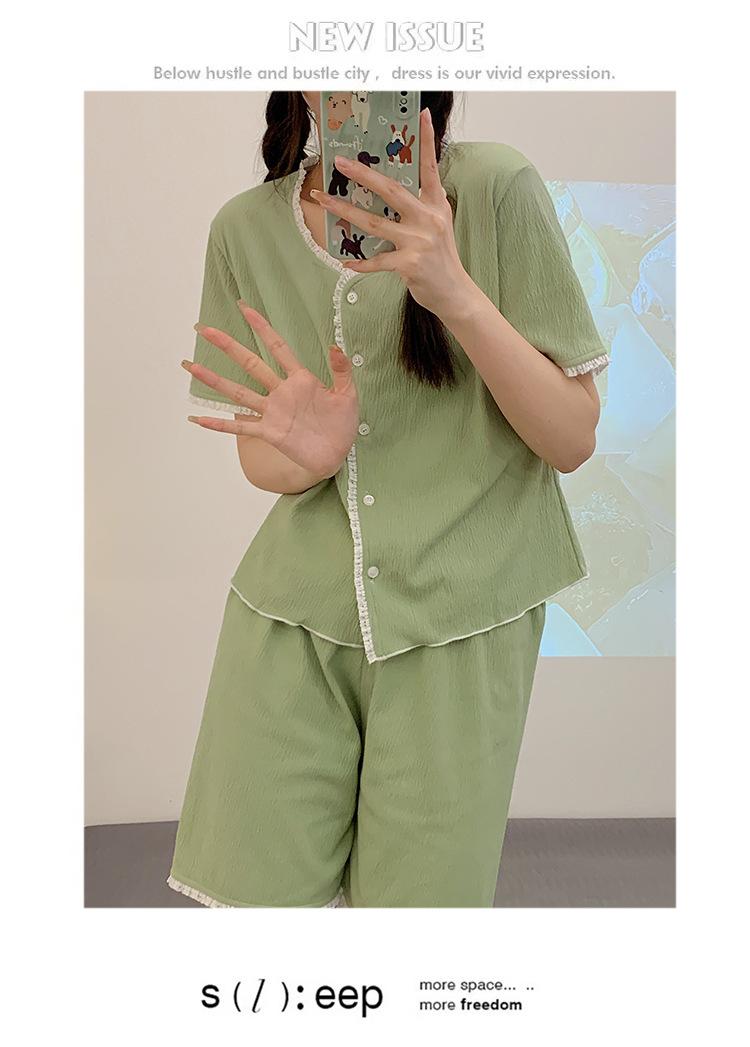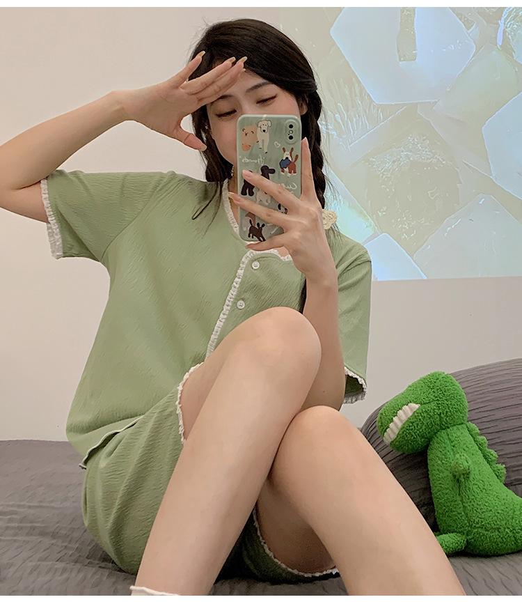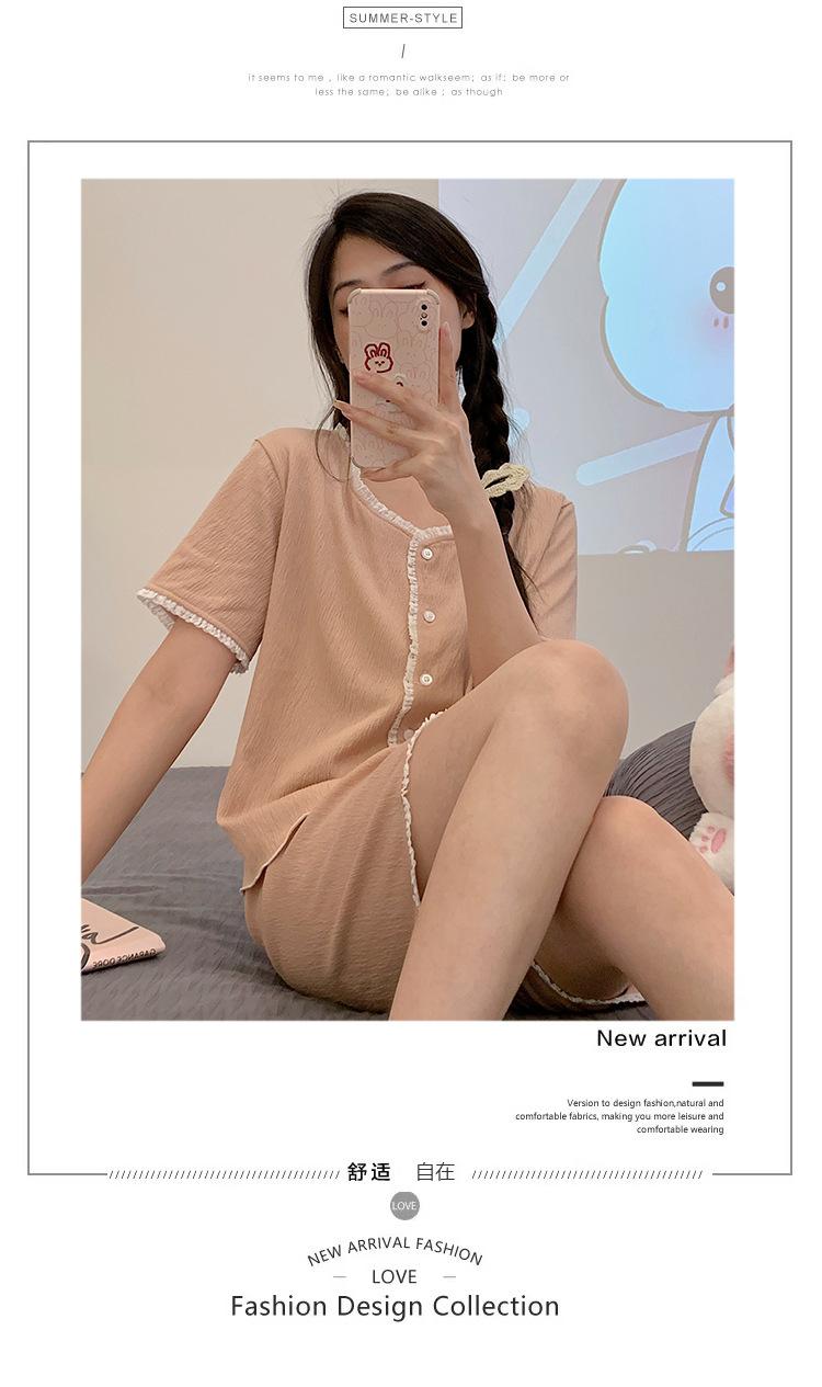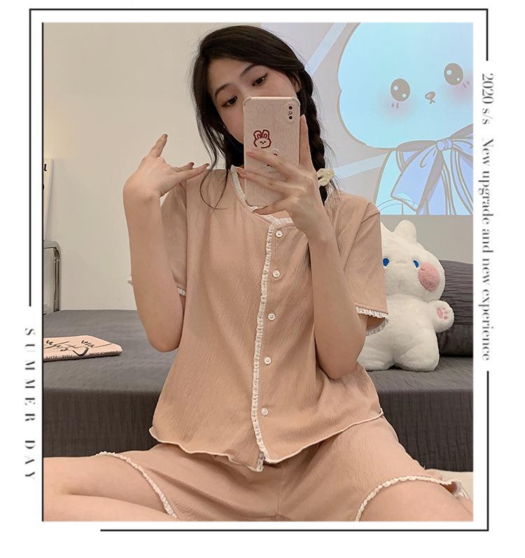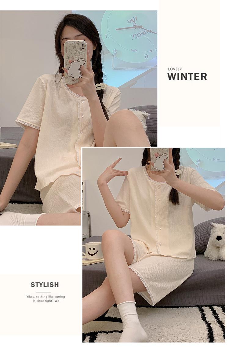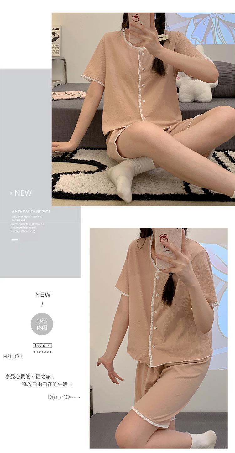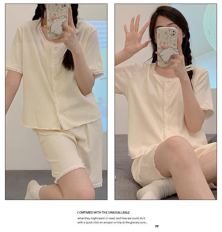 Pijama de algodón arrugado para mujer, bonito cárdigan de verano con estilo dulce, pantalones cortos holgados de manga corta, ropa de abrigo para el hogar
