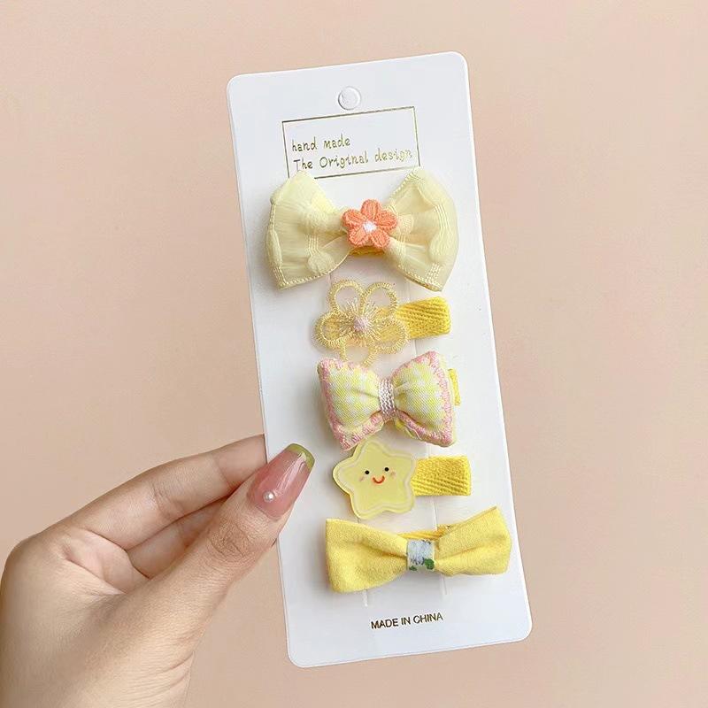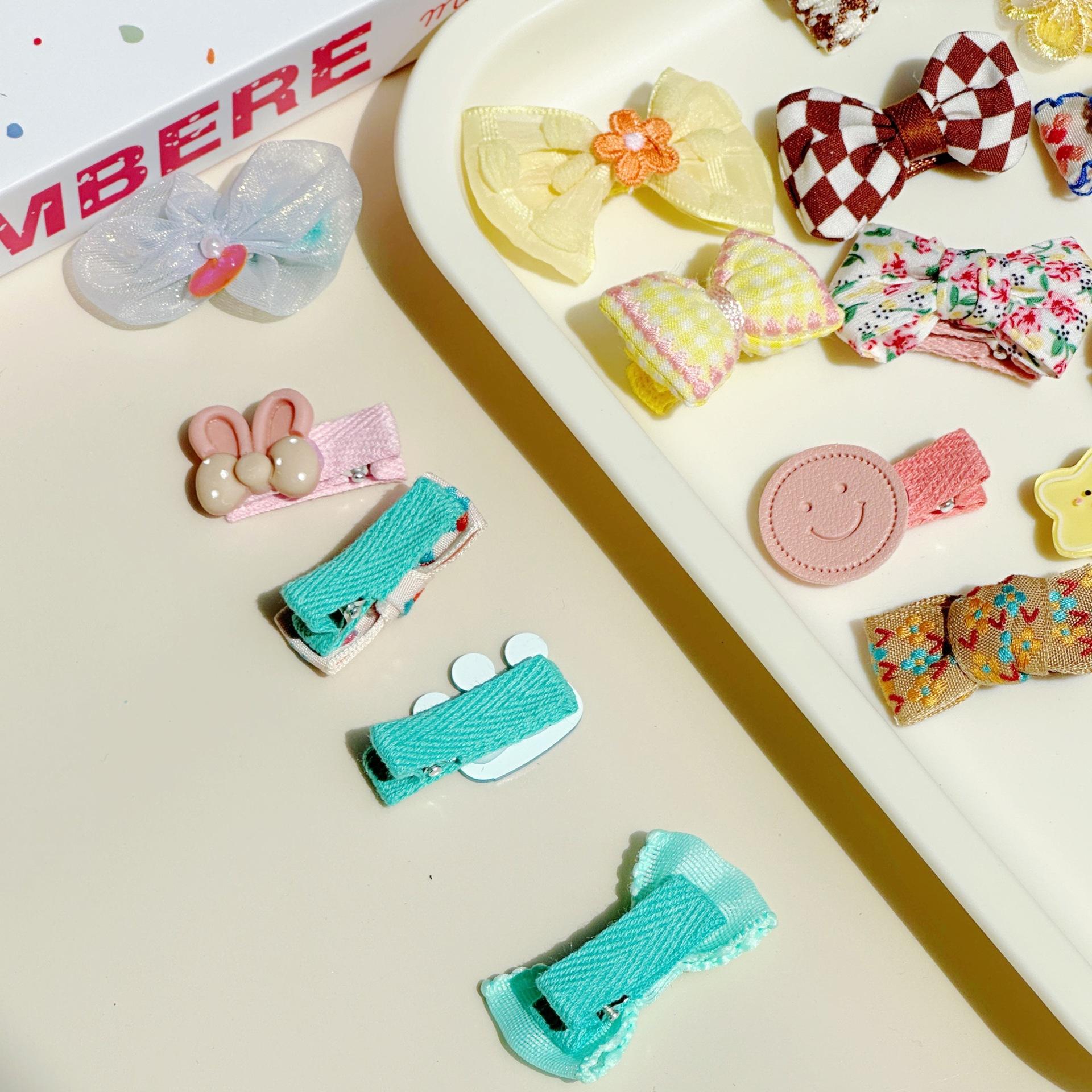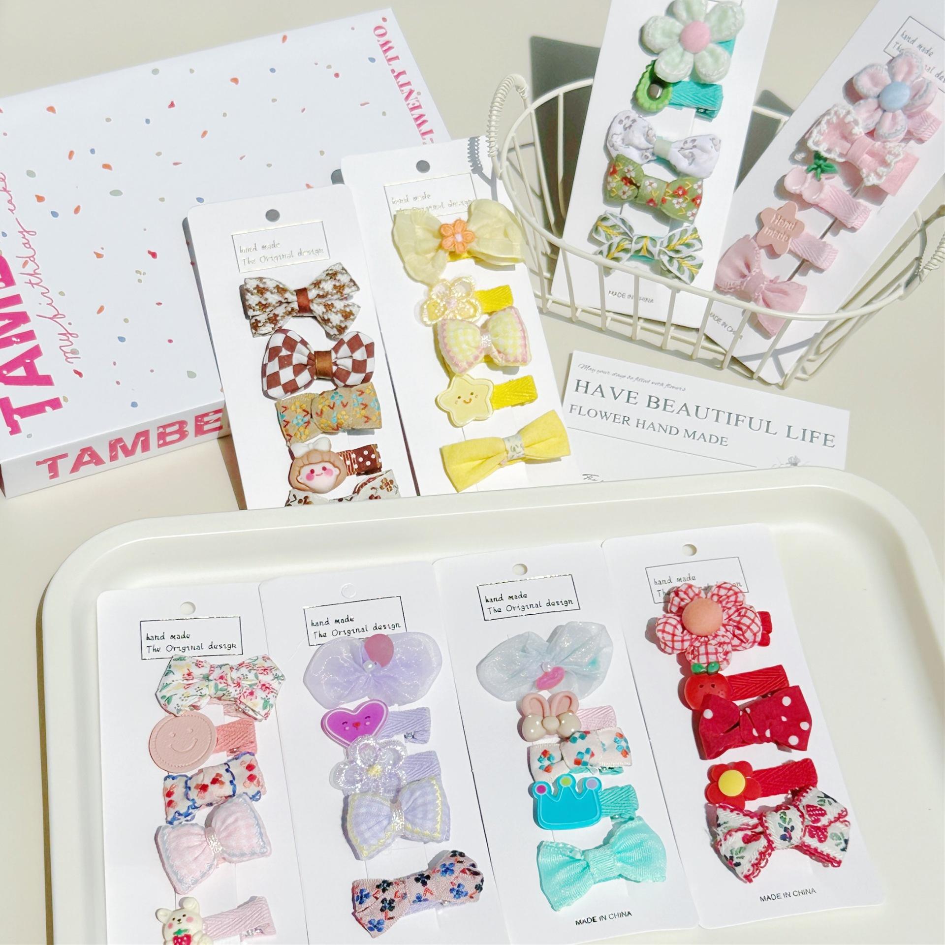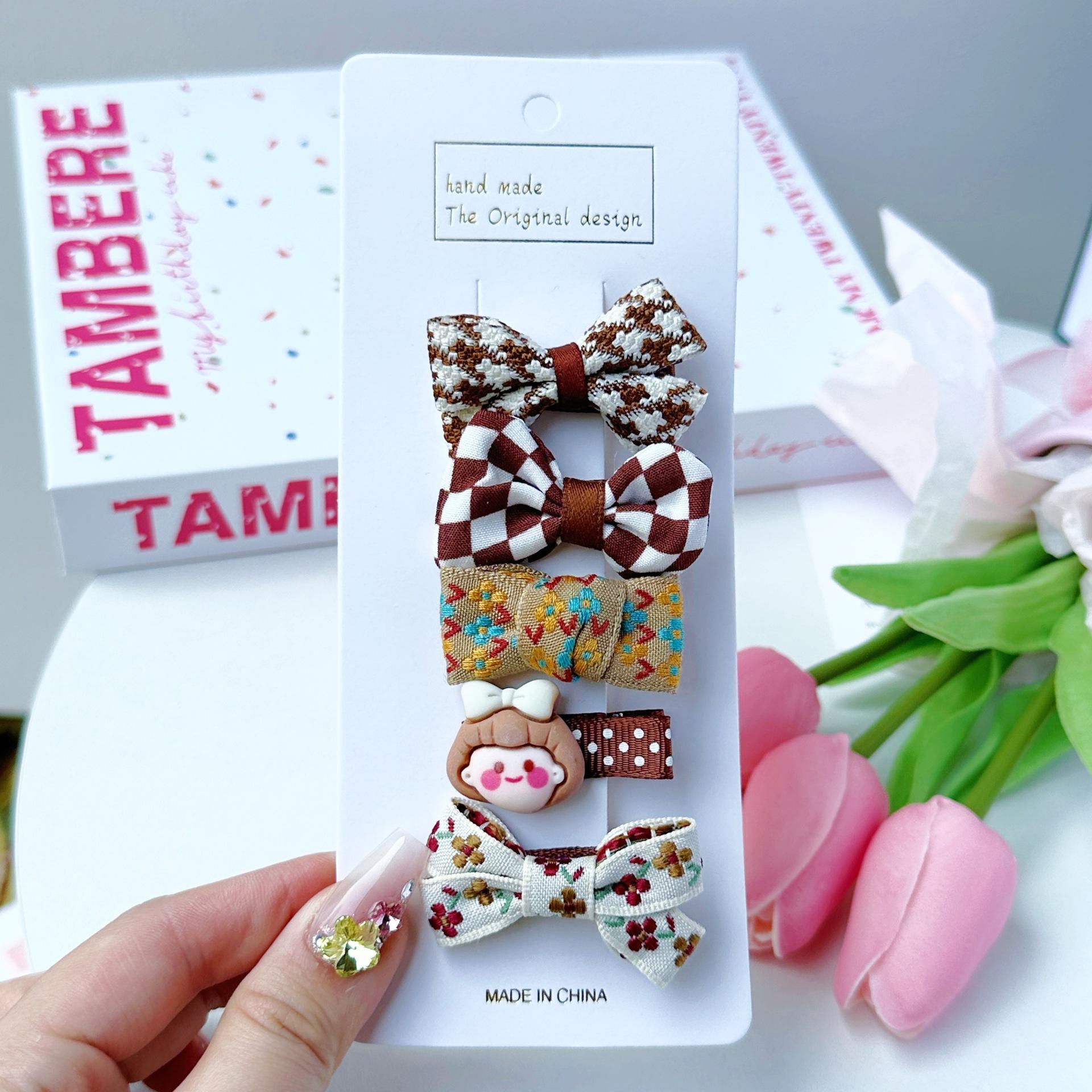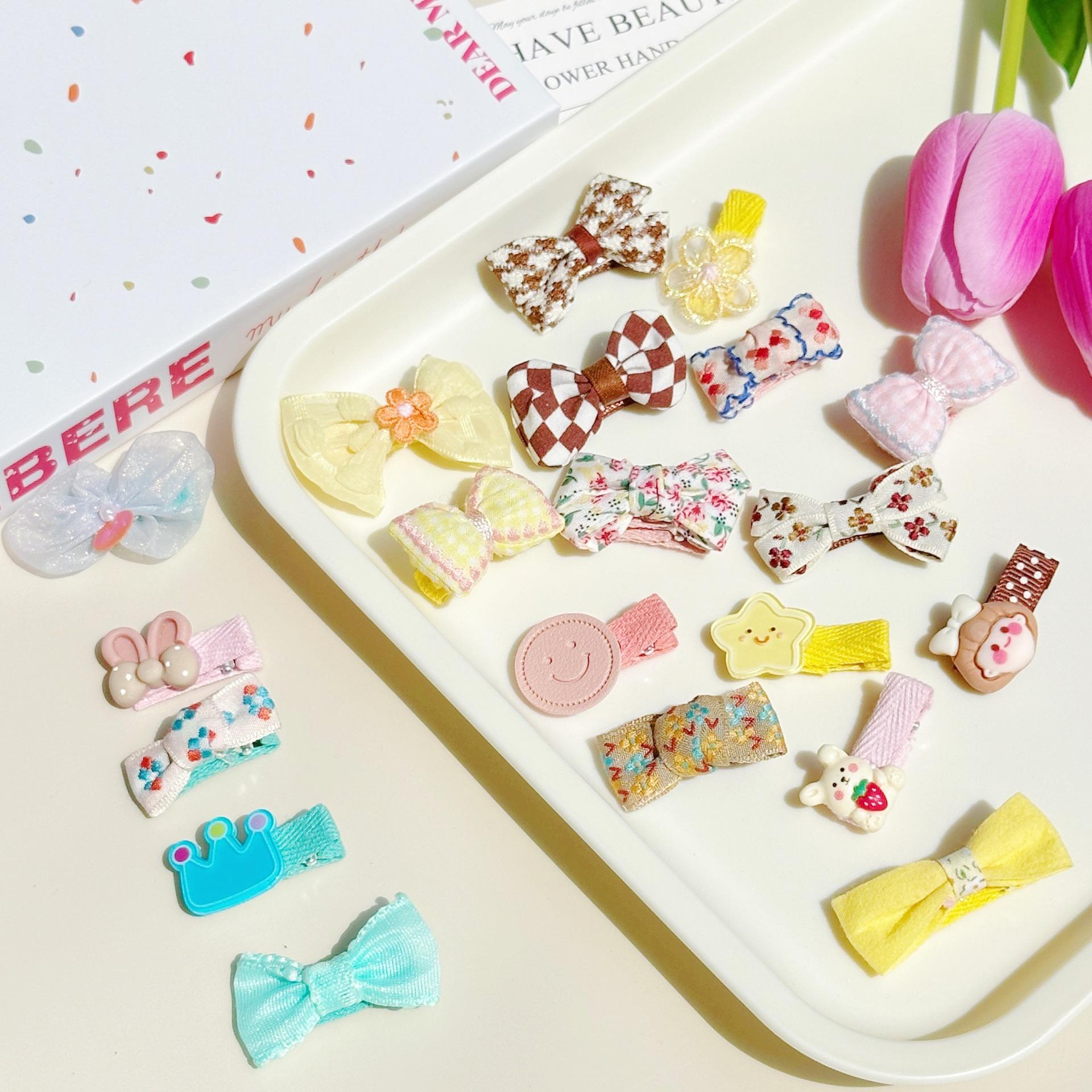 Pink floral bow, Light blue bow, Lavender bow, Light yellow bow, Coffee plaid bow, Light pink small flower, Li...