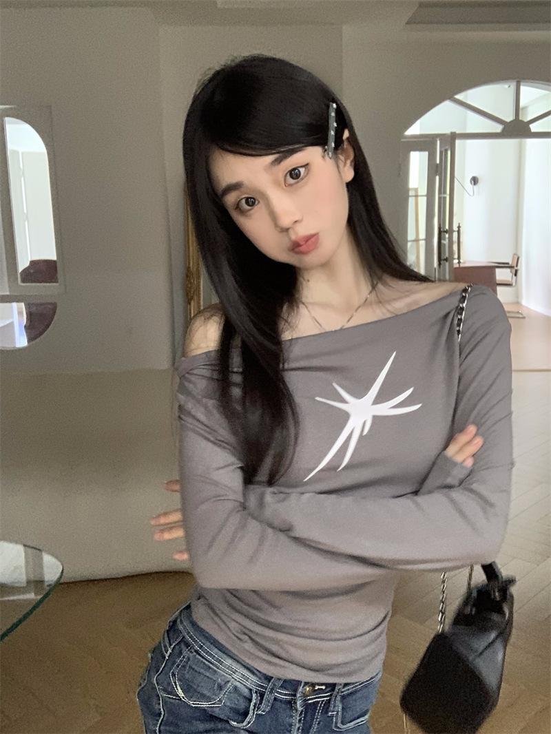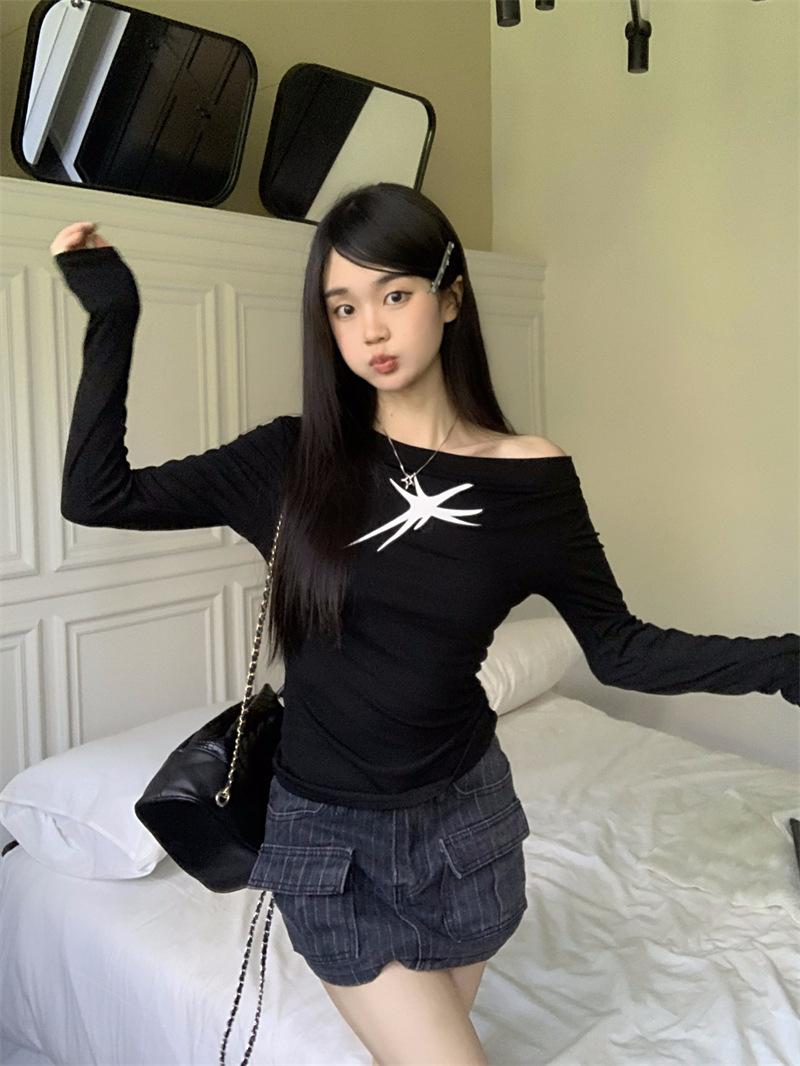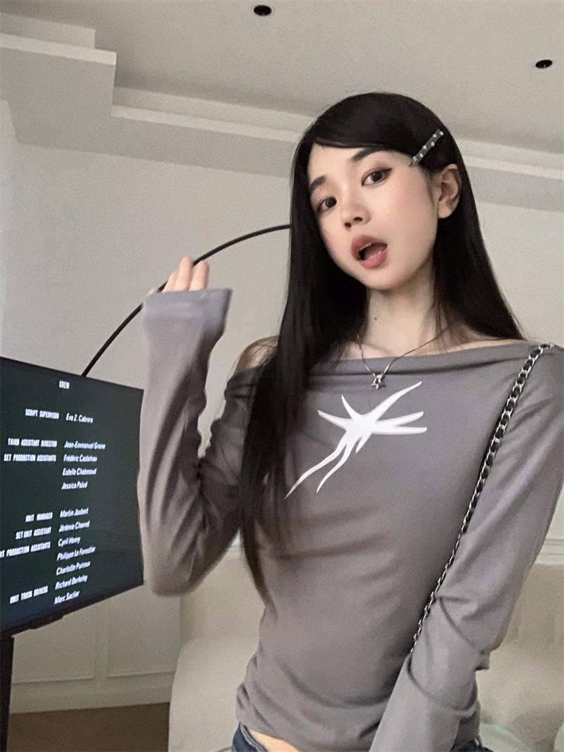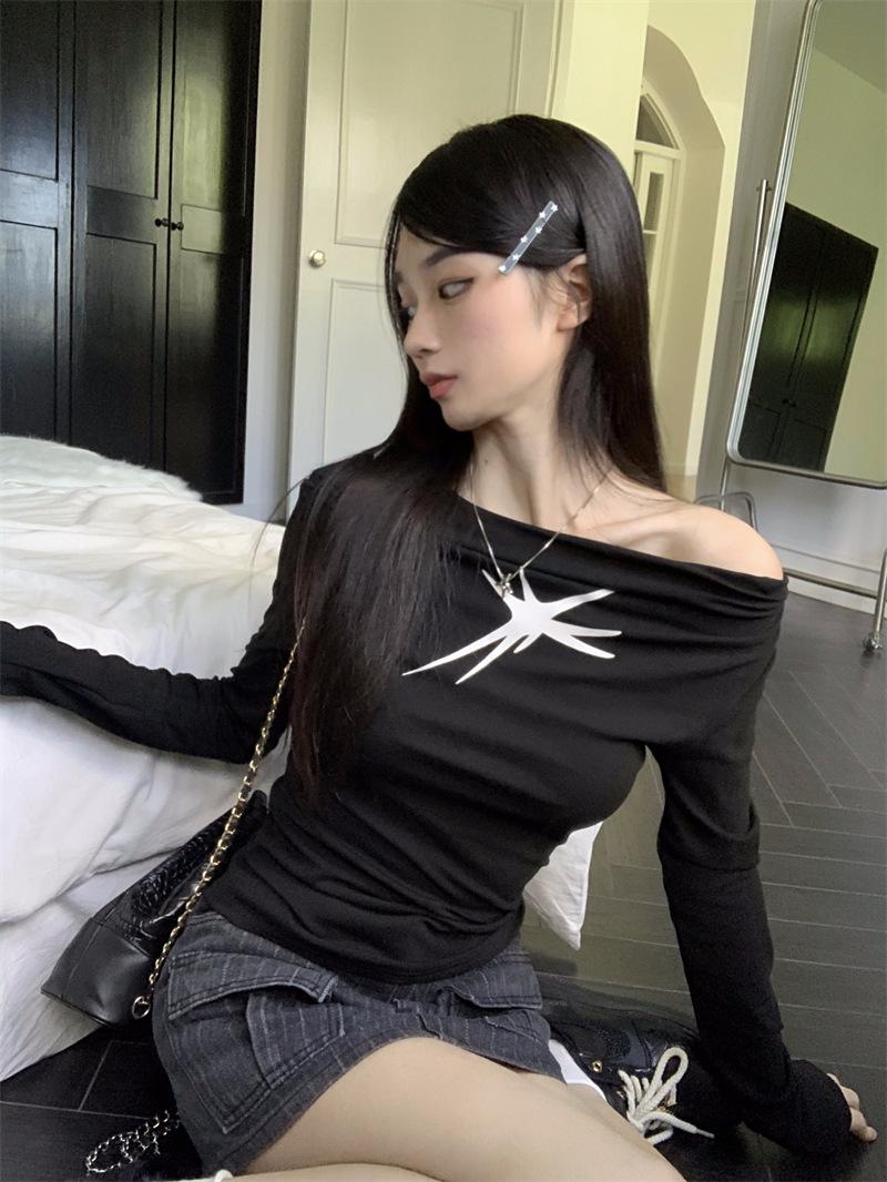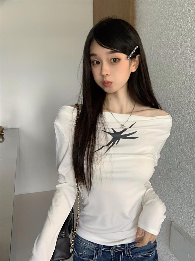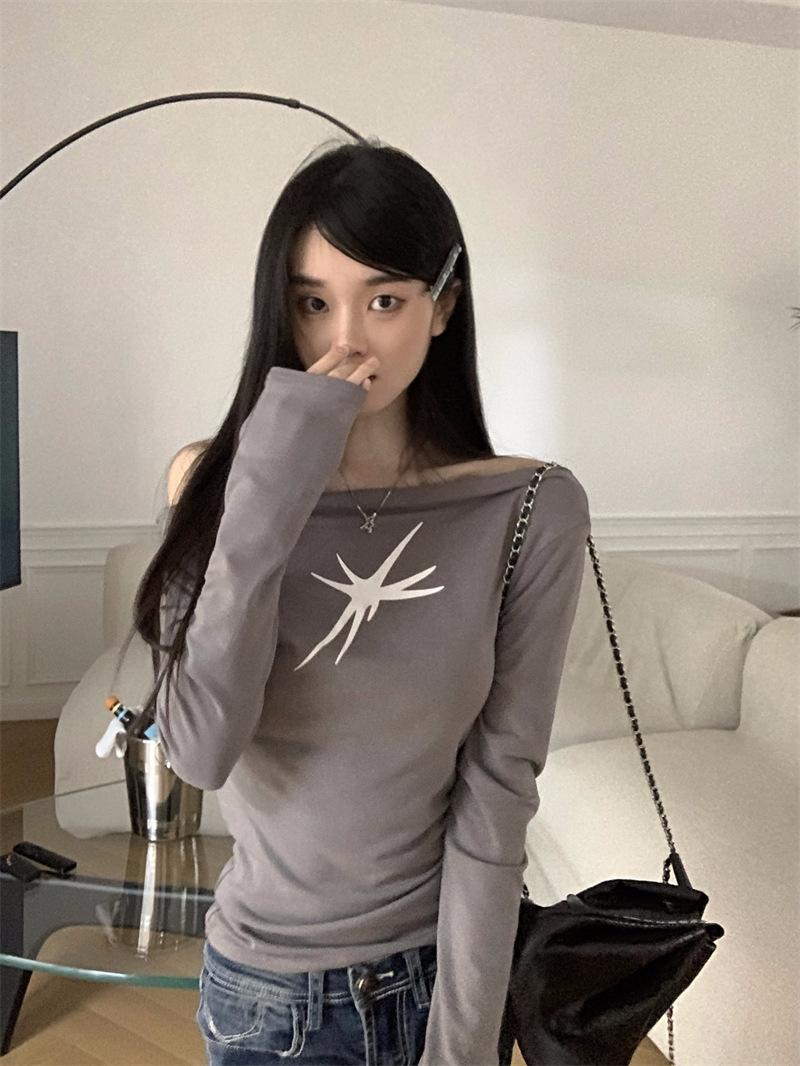 Camiseta de Manga Larga con Hombros Descubiertos para Mujer, Estilo Deseo Puro Otoñal, Corte Ajustado, Top de Diseño Elegante