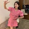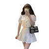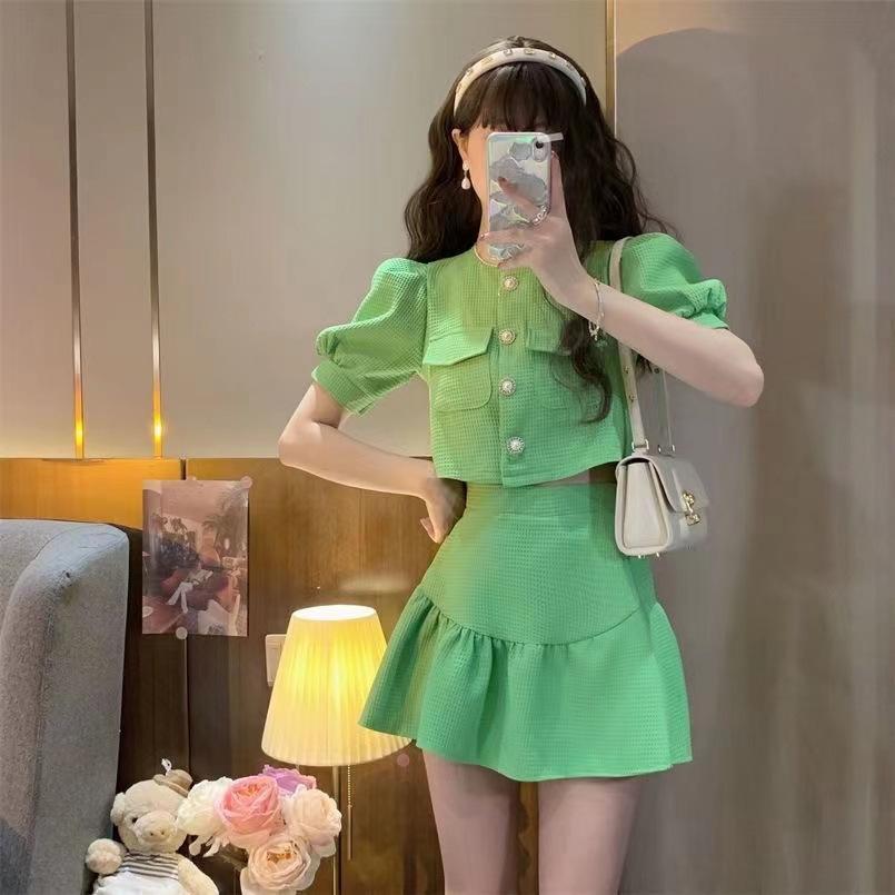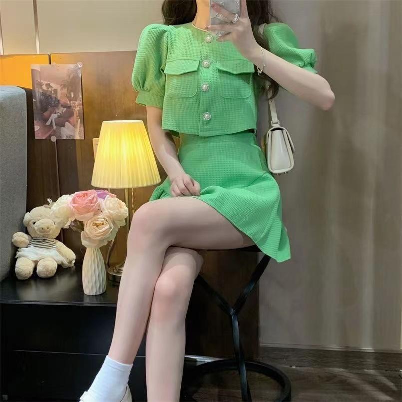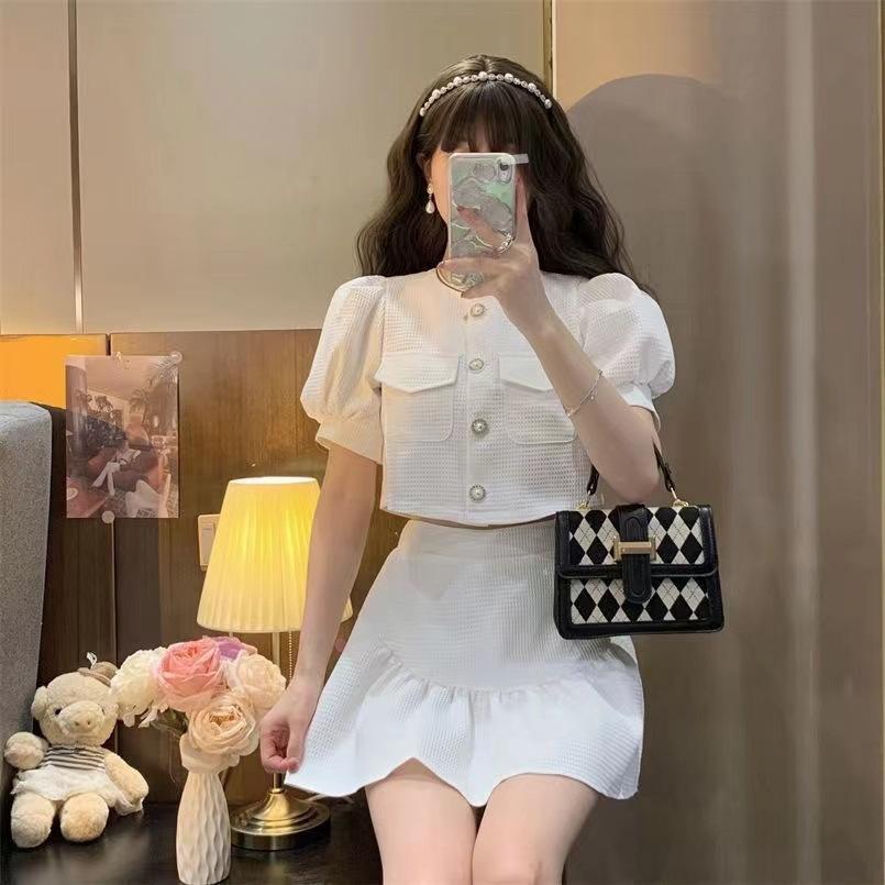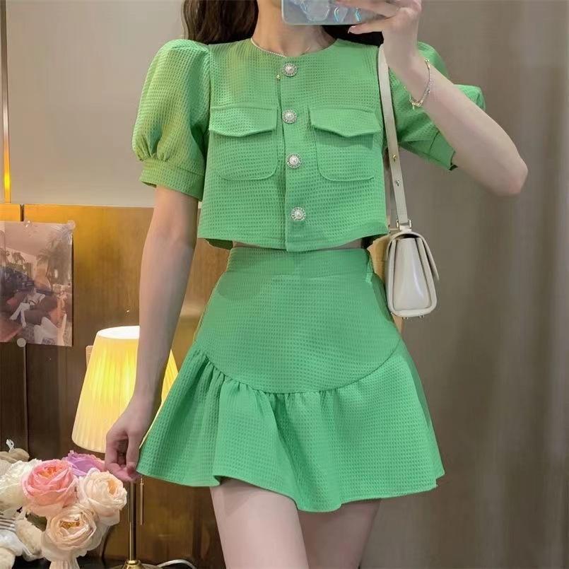 Elegante traje de dos piezas estilo Chanel de alta sociedad con blusa de manga abullonada con lazo y falda plisada de cintura alta para mujer Verano