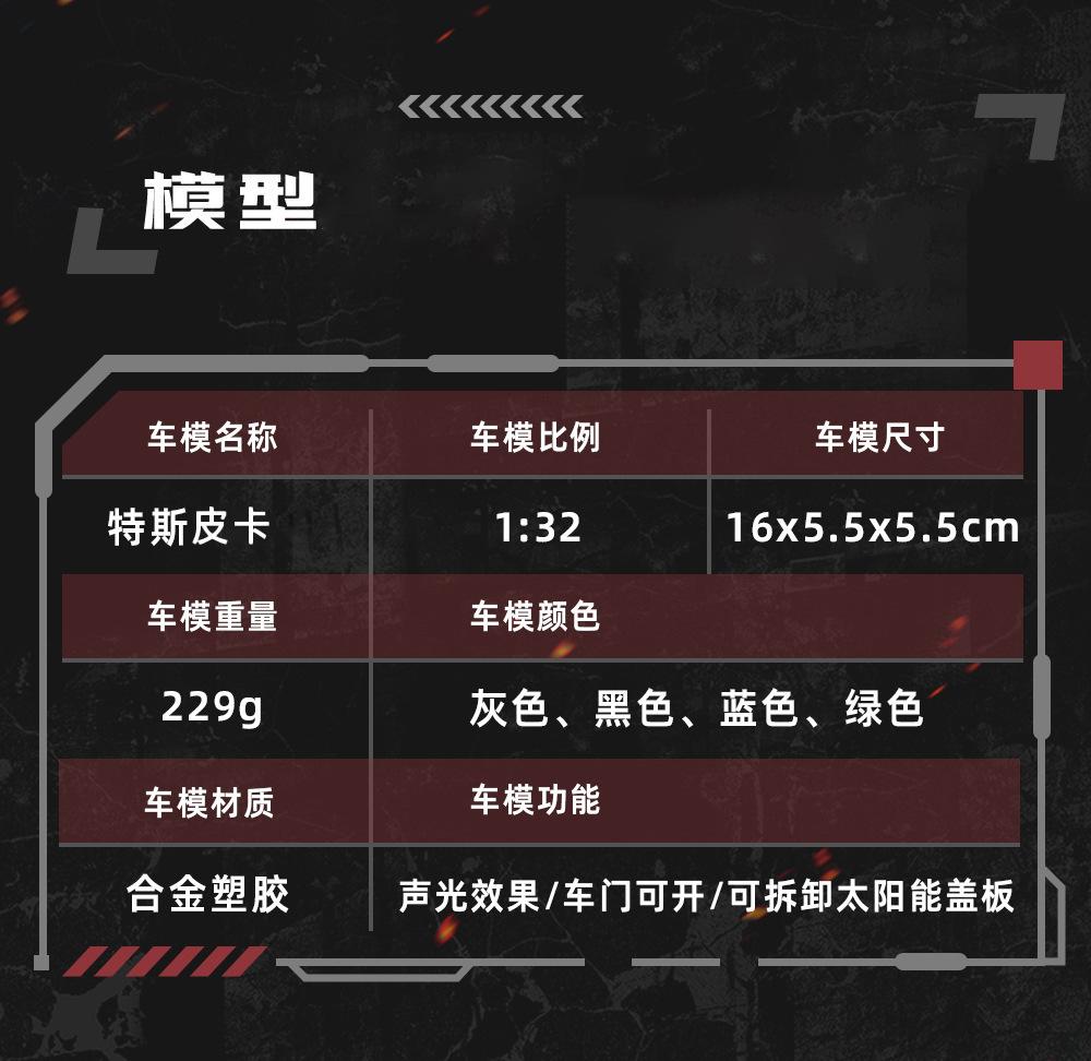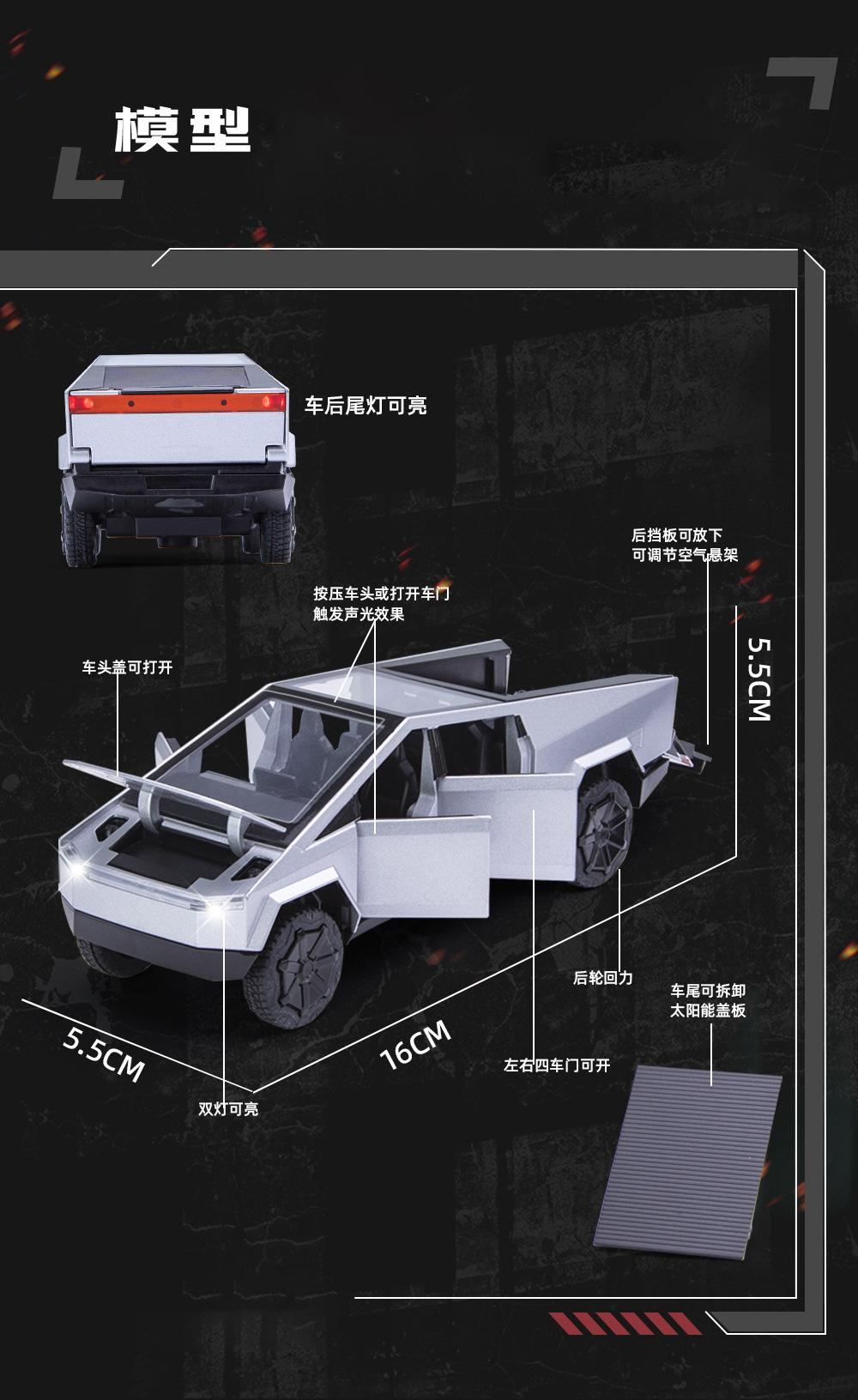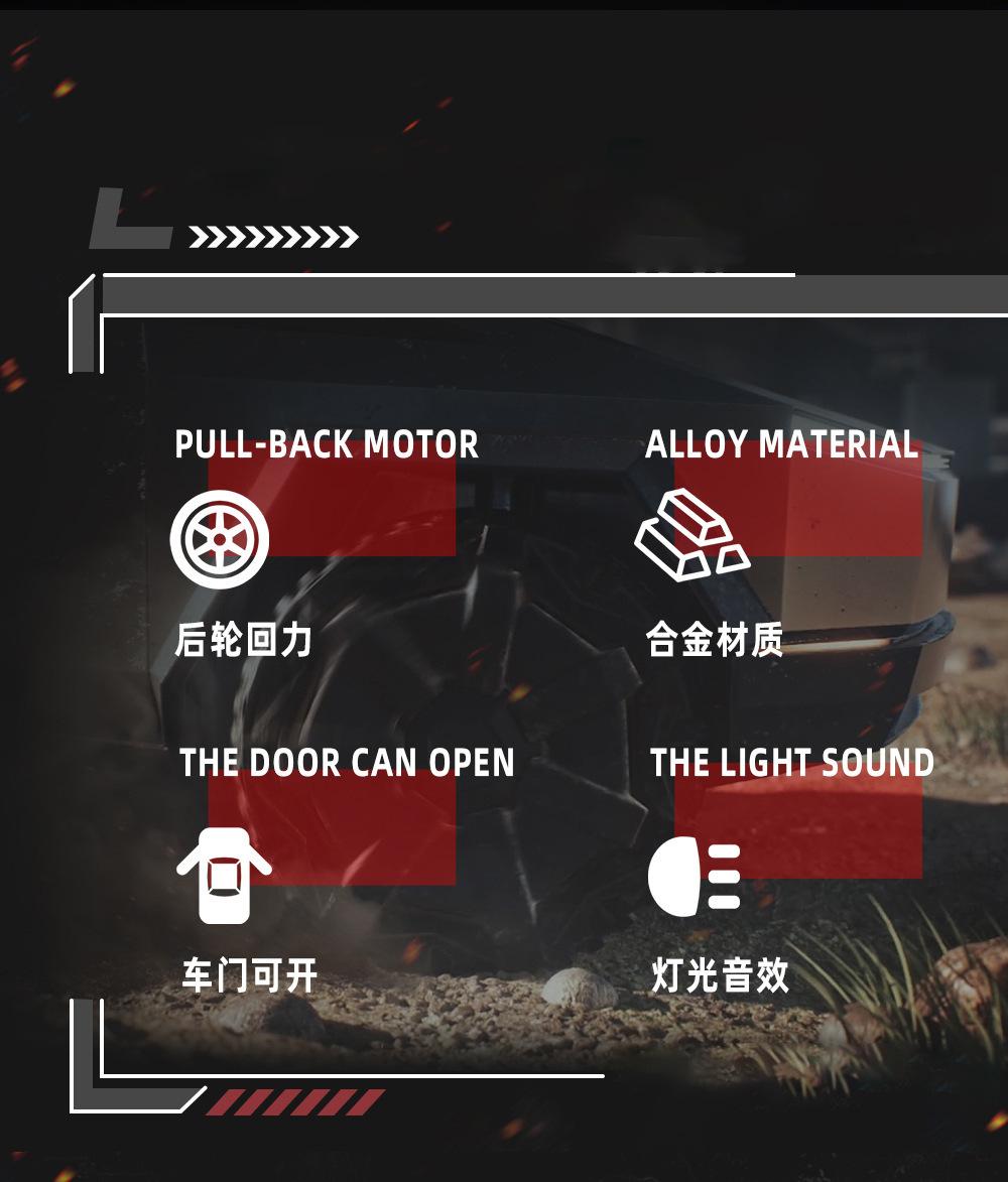 1. Material del producto: La parte delantera está hecha de material de aleación para crear los detalles y la textura del vehículo real. El compartimento trasero está hecho de plástico ABS, que es ligero y no se deforma fácilmente, manteniendo la belleza general del modelo.