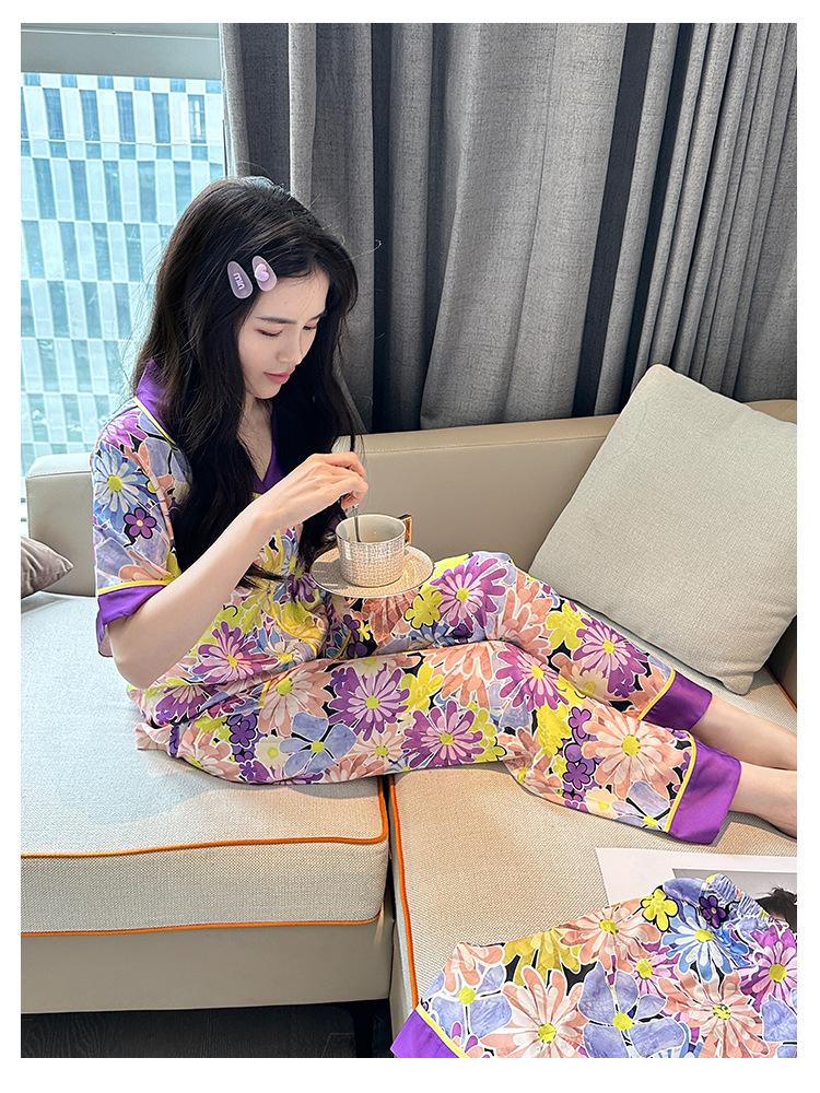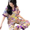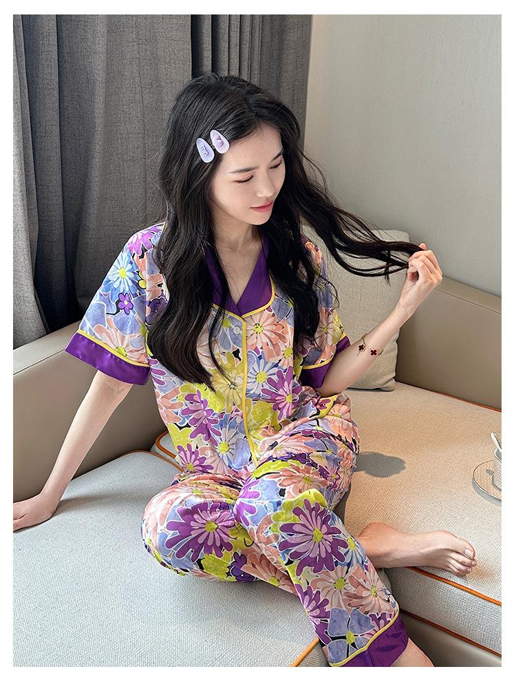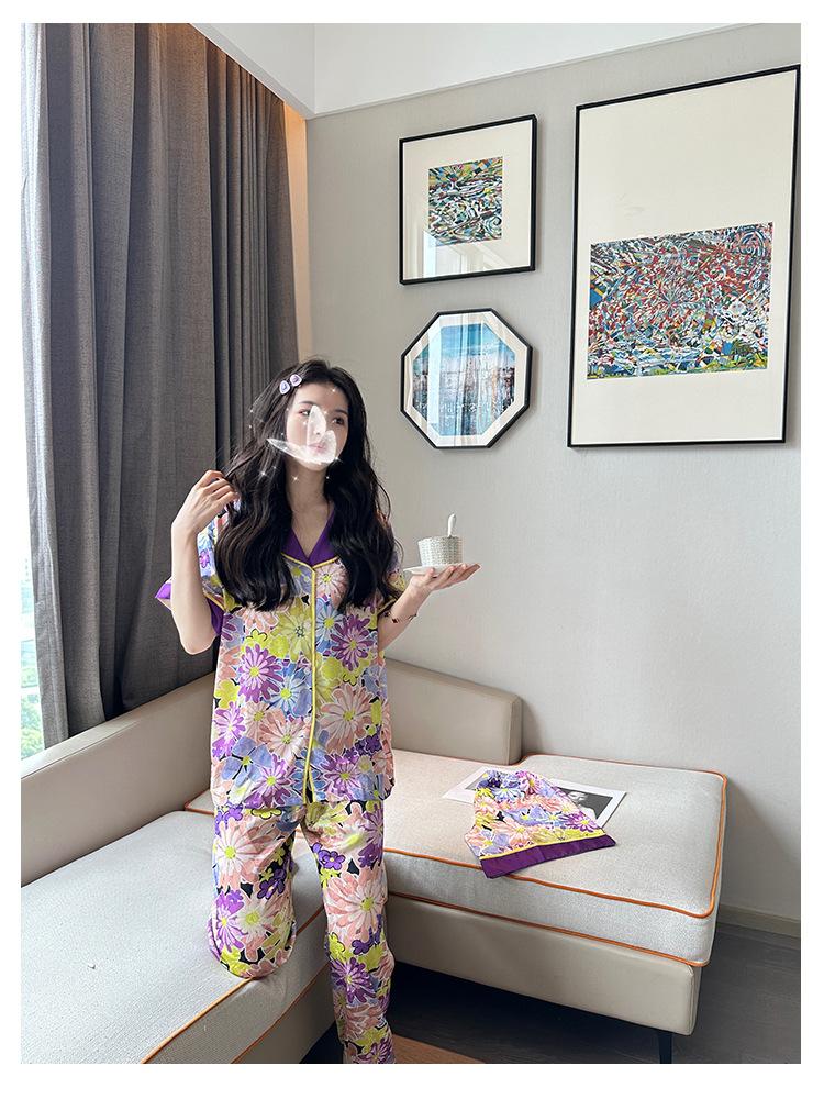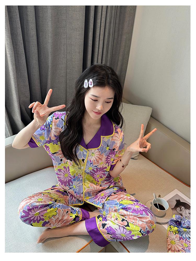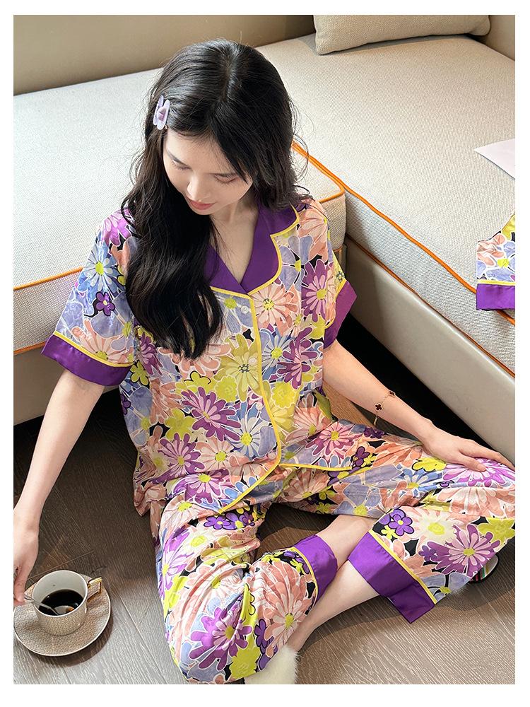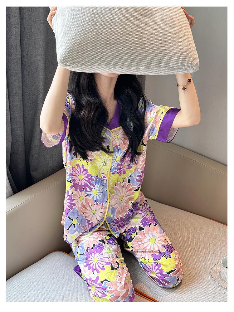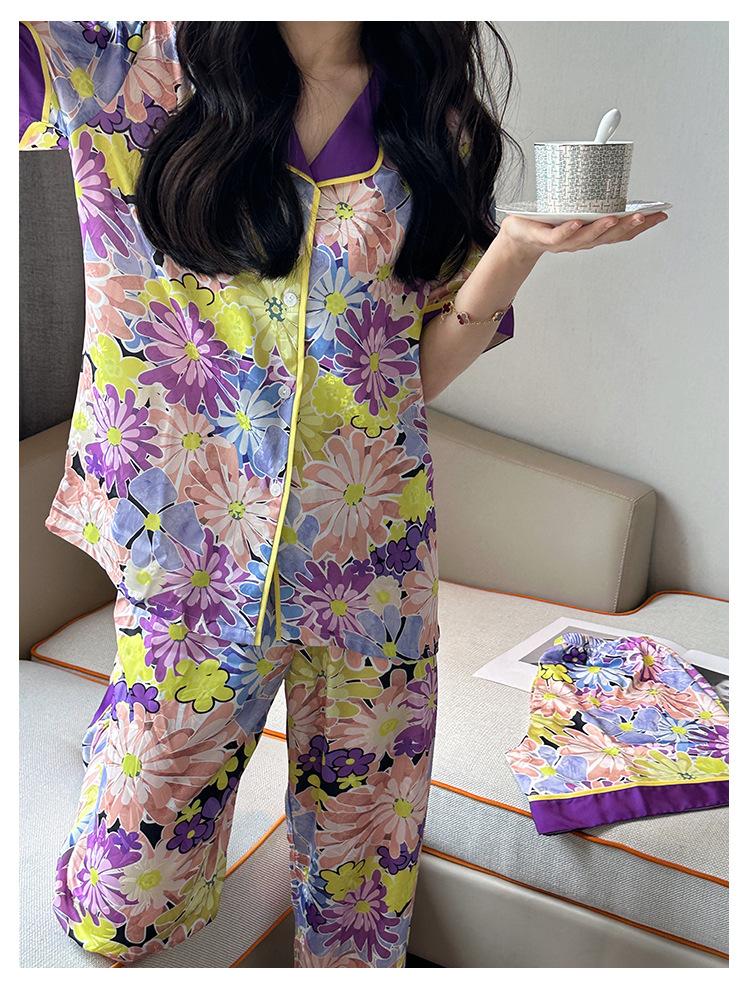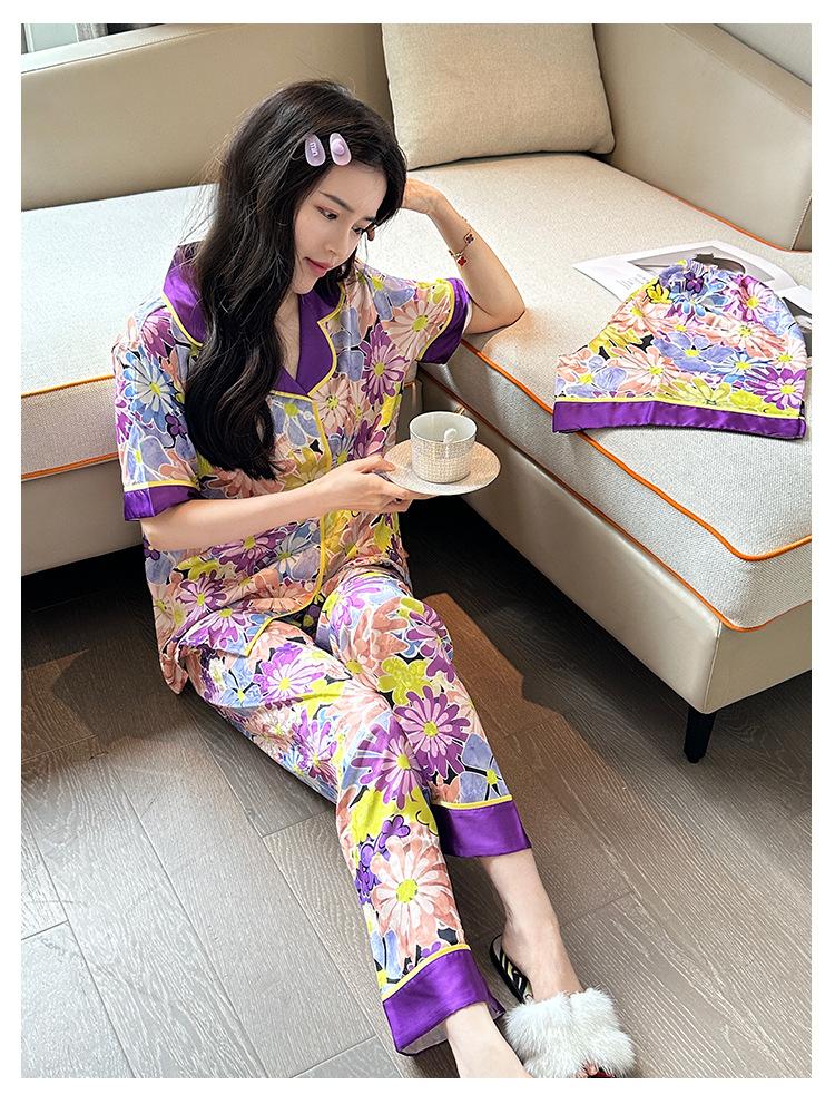 [Set de Tres Piezas de Regalo de Flores de Verano] Pijama Nuevo para Mujer de Verano de Manga Corta con Pantalón de Seda Helada Fino Ropa para el Hogar Set de Talla Grande