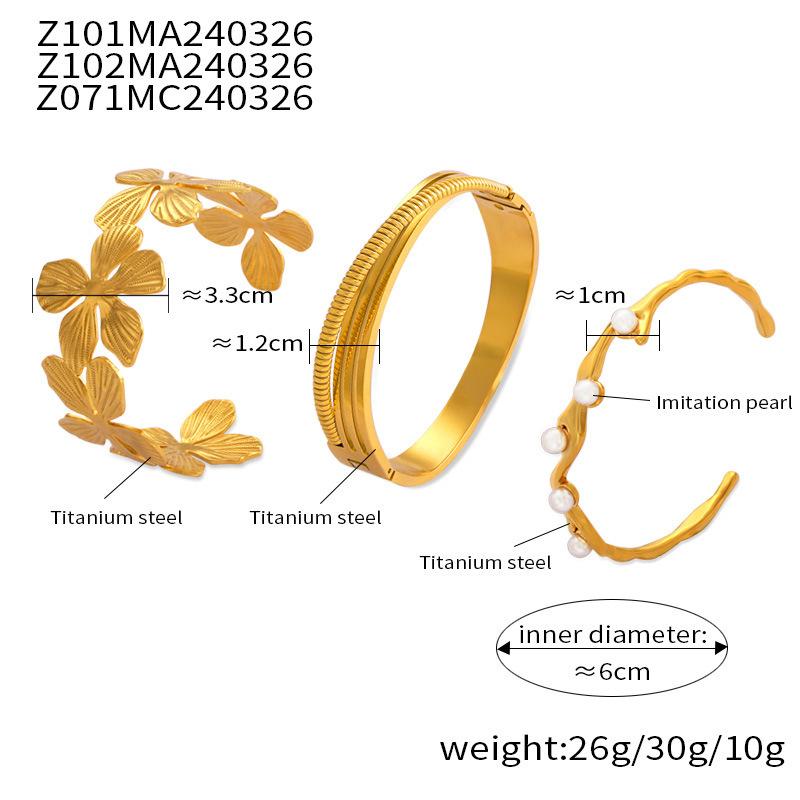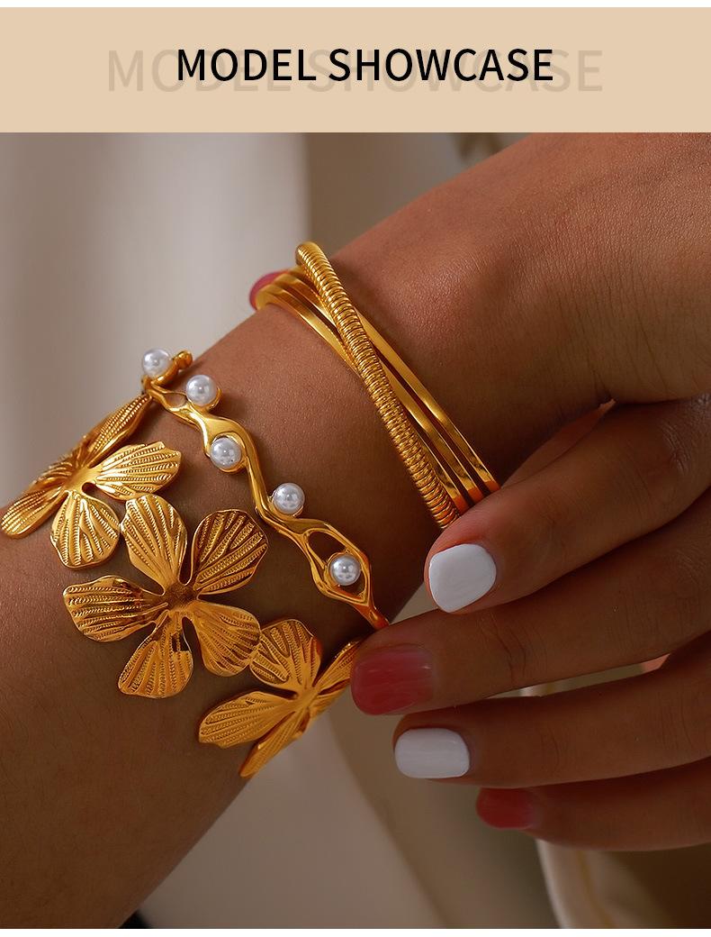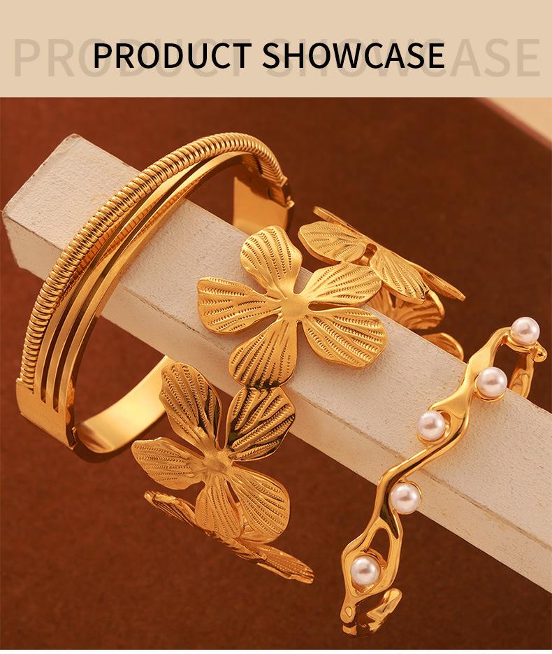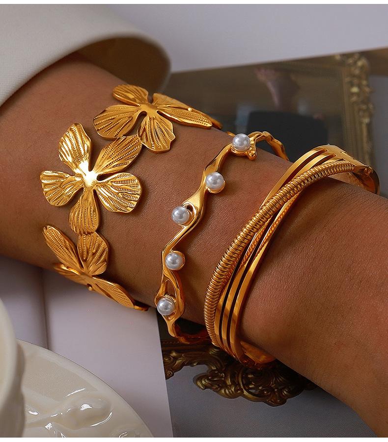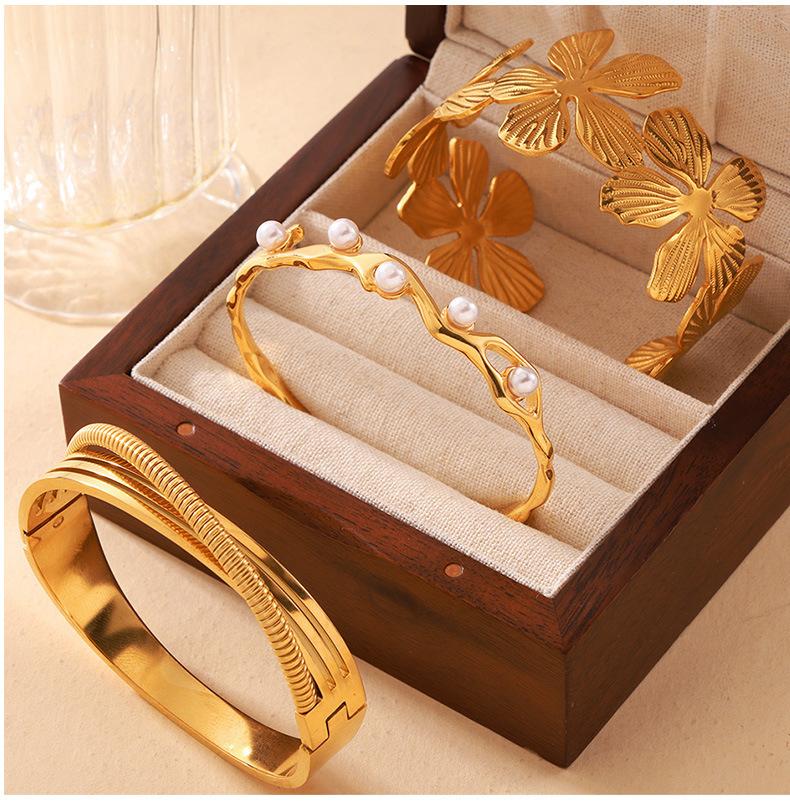 Pulsera nicho de concha incrustada de venta caliente transfronteriza, diseño geométrico plegado texturizado, joyería al por mayor, pulsera de acero de titanio chapada en oro