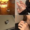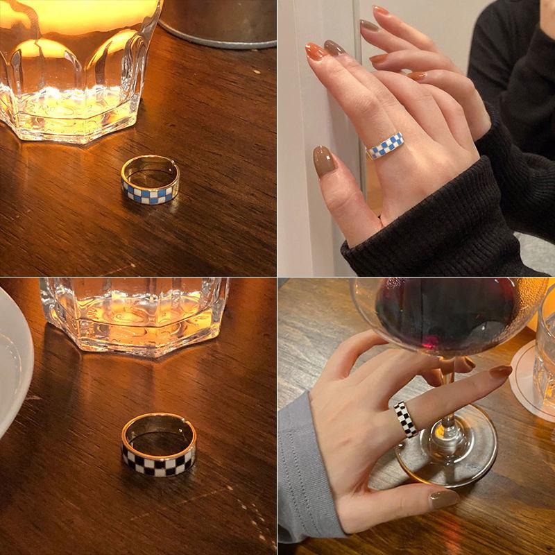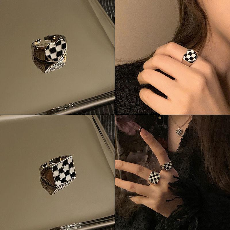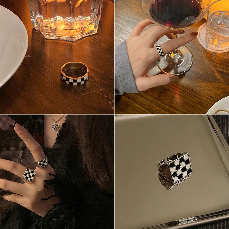 Anillo de cuadros escoceses con diseño de tablero de ajedrez en blanco y negro de buen nicho, anillo de dedo de comida retro para mujer, anillo de amor simple.
