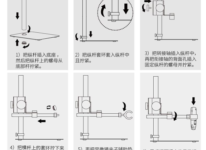 Panel de carga, tope de aluminio x2, perilla de ajuste fino arriba y abajo, herramienta de fijación x2, herramienta de fijación del cuerpo del microscopio