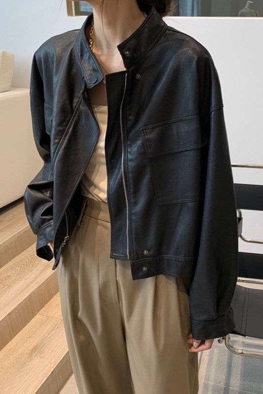 Chaqueta de Cuero Vintage Primavera y Otoño 2024 Petite Biker Chaqueta Corta Top Comercio Exterior Venta al por Mayor Estilo Urbano Único