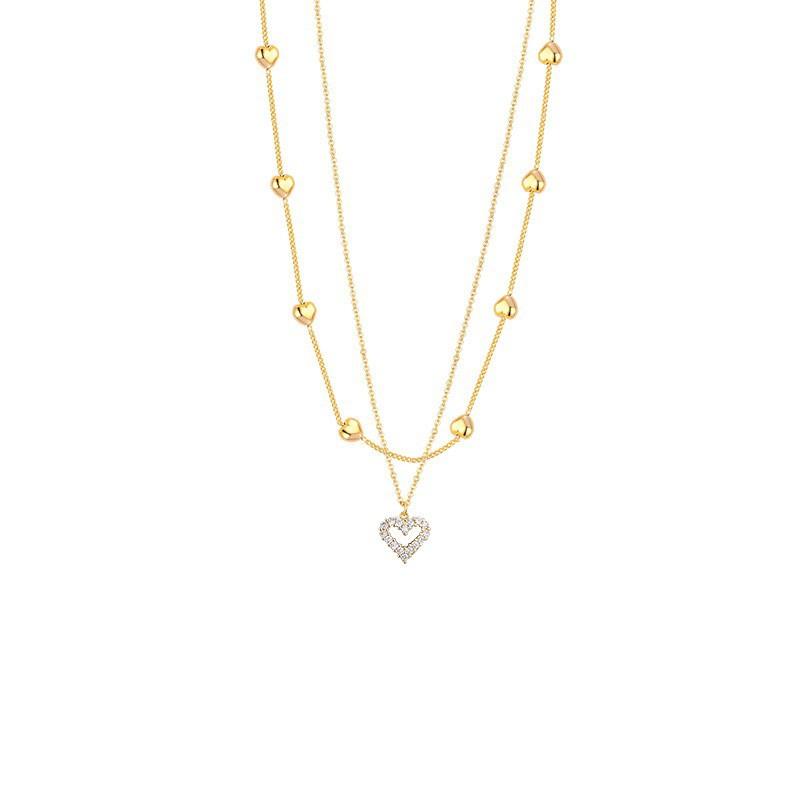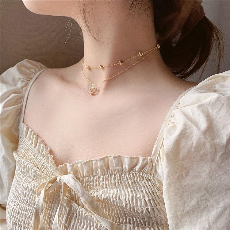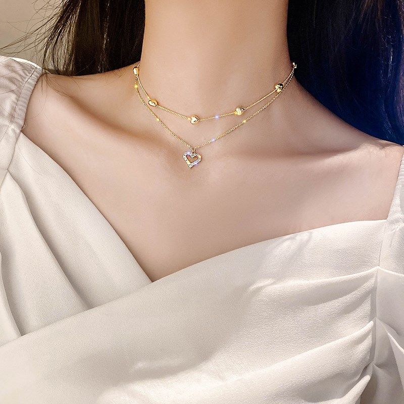 Collar Coreano Estilo Corazón Calado con Diamantes Completos Doble Capa Simple Elegante Versátil Nicho de Alta Gama Cadena para Clavícula en Forma de Corazón