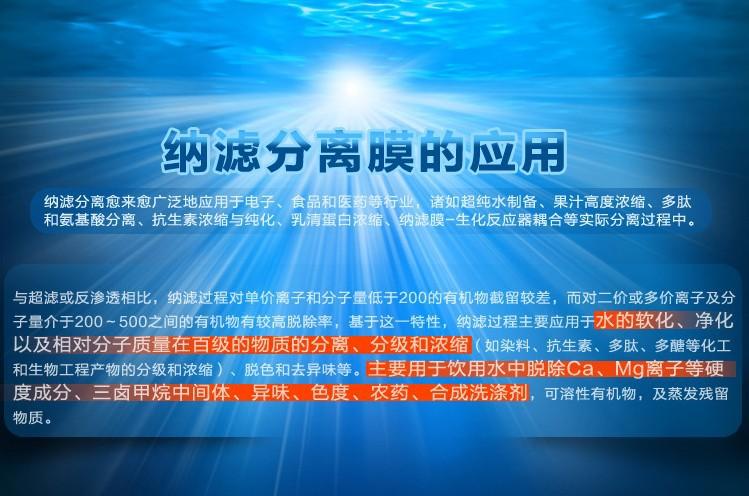 El límite de peso molecular de las membranas de nanofiltración patentadas de la serie D es de 150 a 300 Daltons. Presenta una retención limitada de aniones divalentes y multivalentes, y la tasa de retención de iones monovalentes está relacionada con la concentración y la composición de la solución de alimentación. Dado que los iones monovalentes pueden atravesar la membrana y no generan presión osmótica, el sistema de membranas de nanofiltración de la serie D puede operar a una presión de operación menor que el sistema de ósmosis inversa. Por lo tanto, en el tratamiento de agua, las membranas de nanofiltración de GE se utilizan ampliamente en los campos de la purificación por concentración de agua potable, el ablandamiento del agua, la desalinización y concentración de materia orgánica y sustancias bioactivas, la eliminación de precursores de trihalógenos en el agua, la clasificación y concentración de materia orgánica de diferentes pesos moleculares y la decoloración de aguas residuales. También se pueden utilizar para tratar aguas residuales de galvanoplastia y lixiviados de vertederos. También se puede utilizar para la eliminación o concentración de colorantes, la eliminación de metales pesados, la purificación de ácidos, la diafiltración de cloruro de sodio, la concentración y separación de soluciones de azúcar, la concentración y desalinización de proteínas de suero y la concentración y desalinización de péptidos.