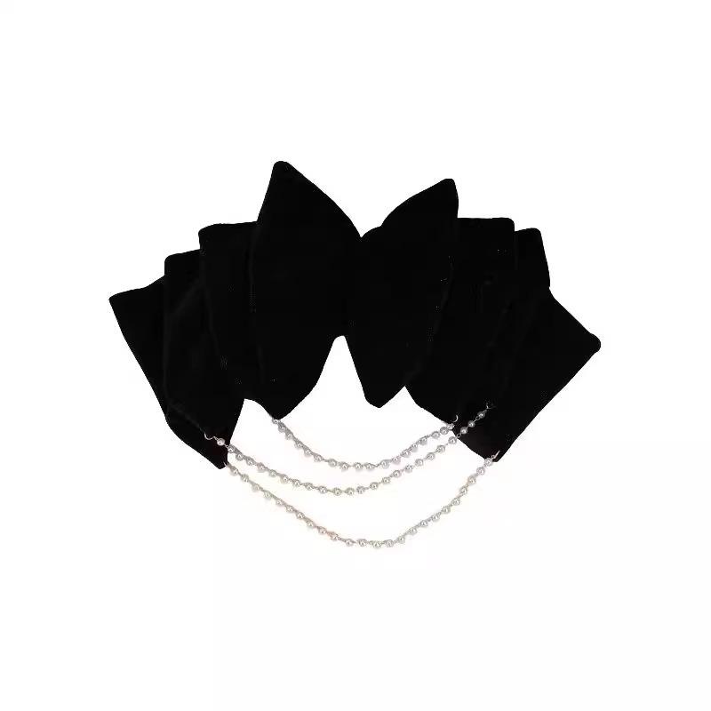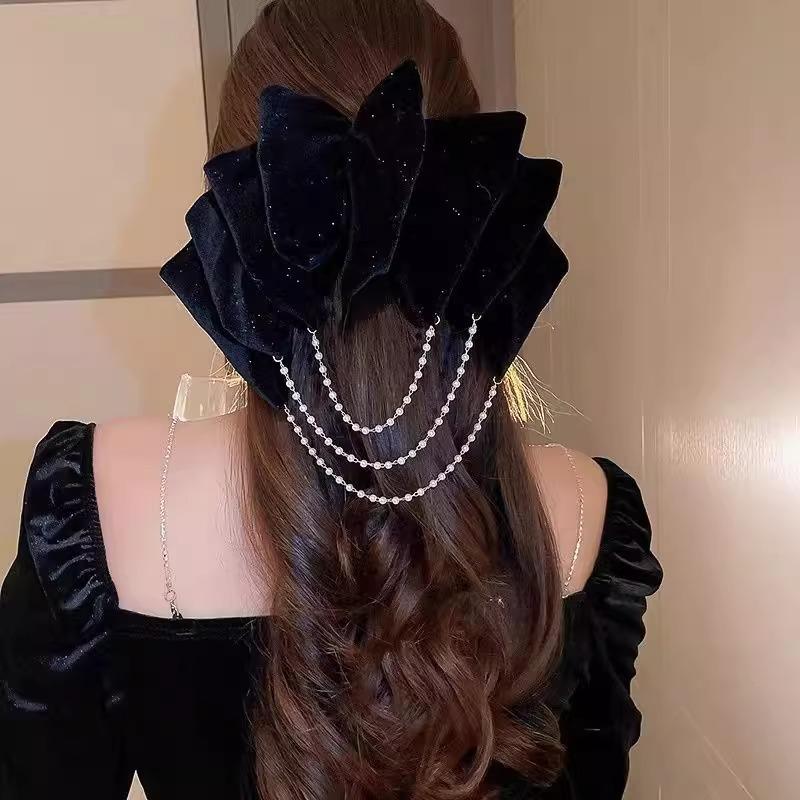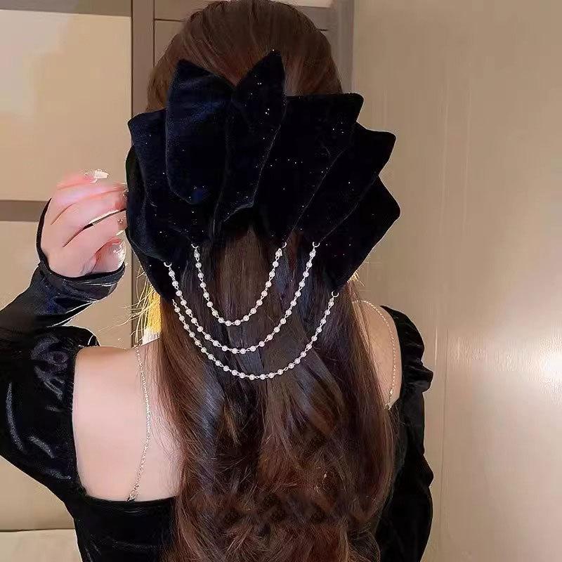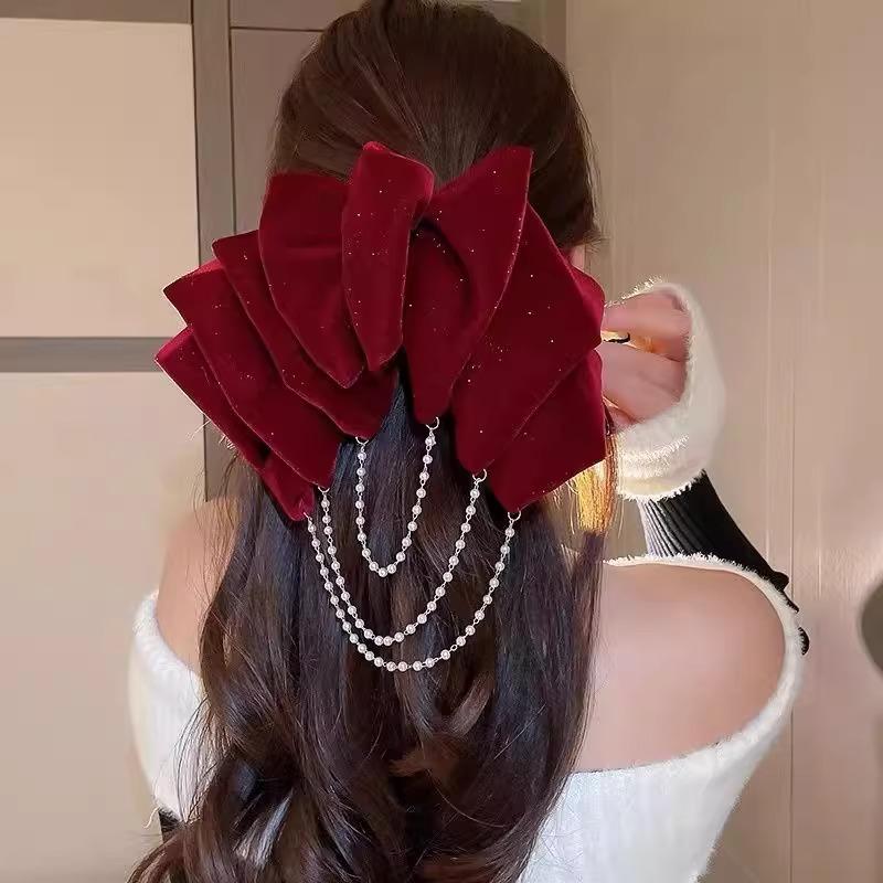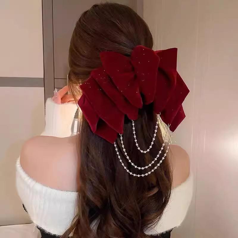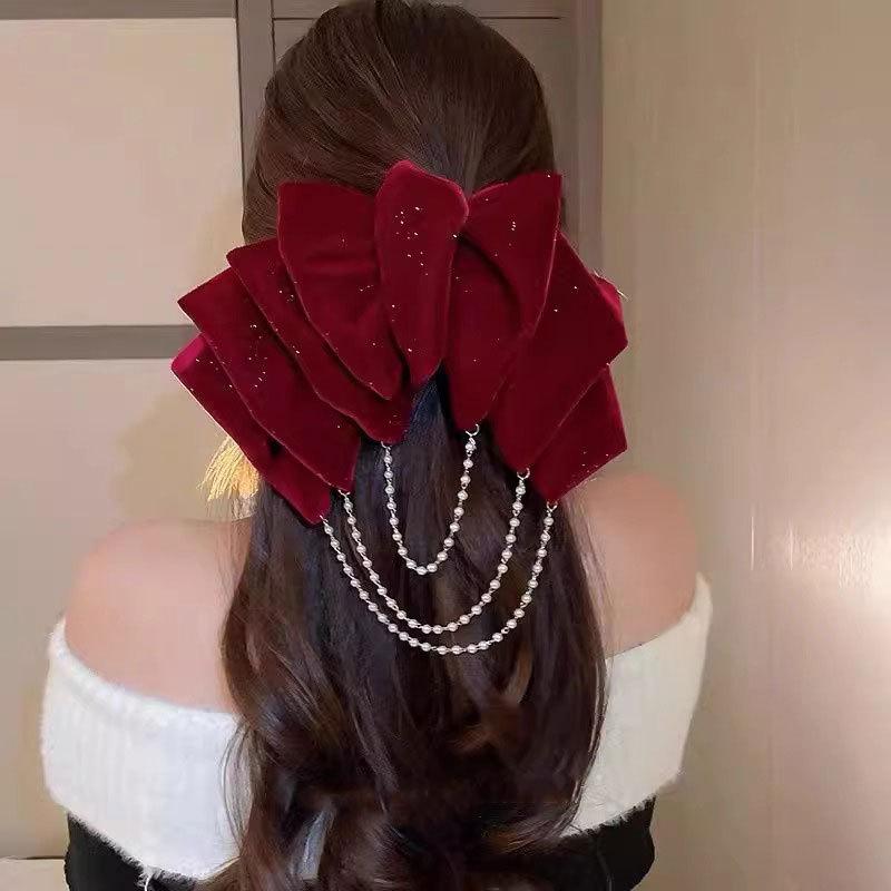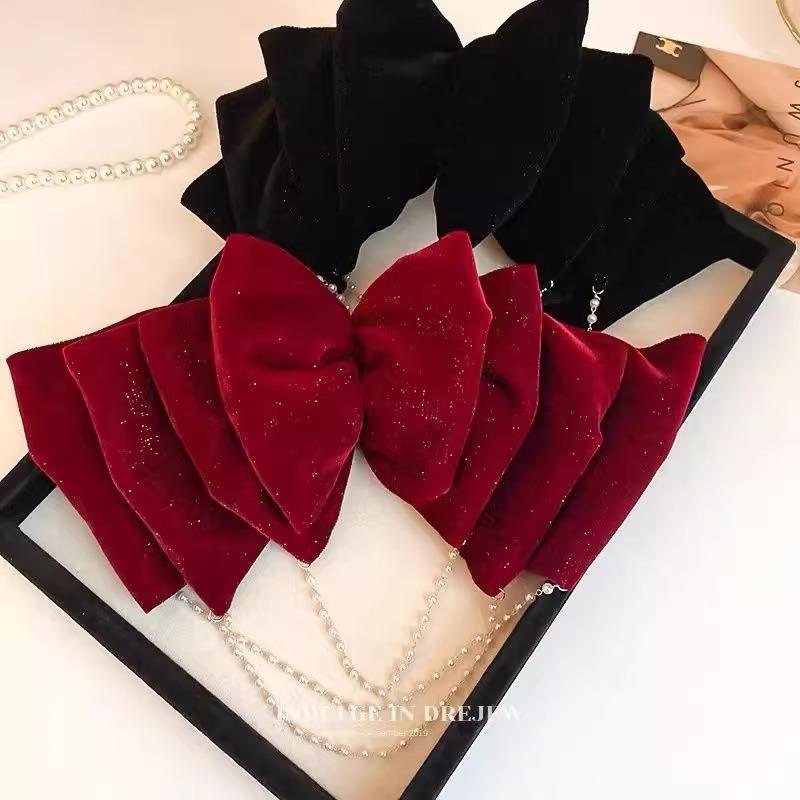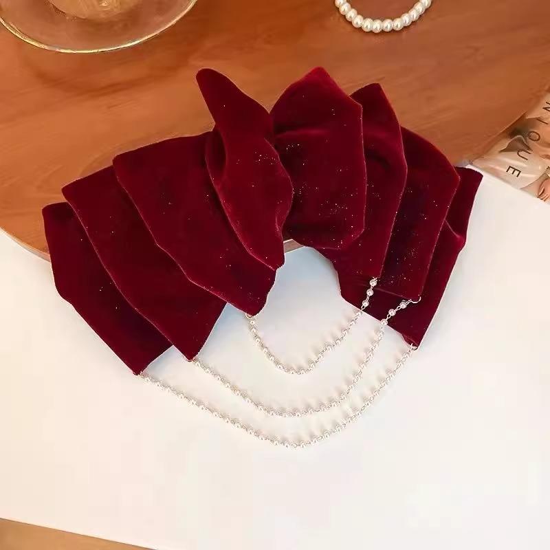 Horquilla de lazo de terciopelo grande súper hada rojo francés trasero clip de resorte de perlas alto sentido accesorios para el cabello celebridad de Internet