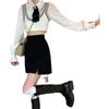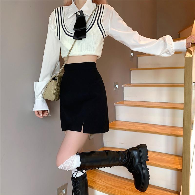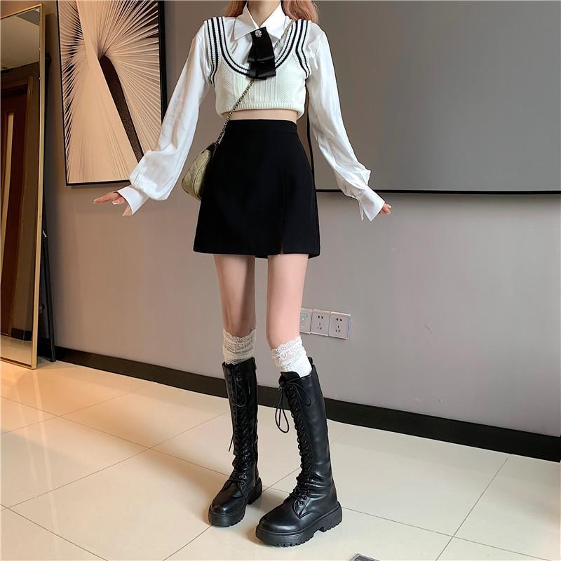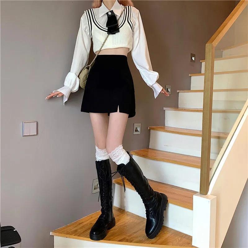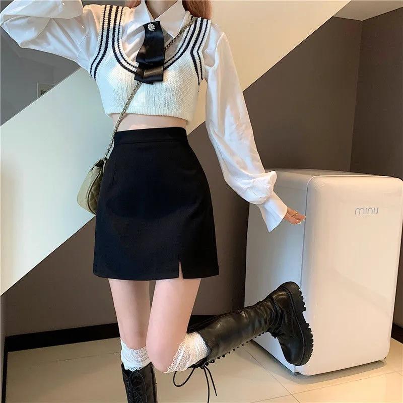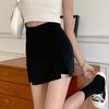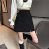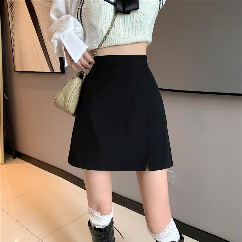 Falda para estudiantes femeninas de otoño, falda corta antideslumbrante, cintura alta, talla grande, adelgazante, falda de línea A dividida, falda negra de cadera, moda