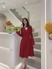 Vestido tipo suéter de mujer de otoño e invierno con cuello en V y tirantes rojos de punto elegante que adelgaza la cintura y el temperamento delgado