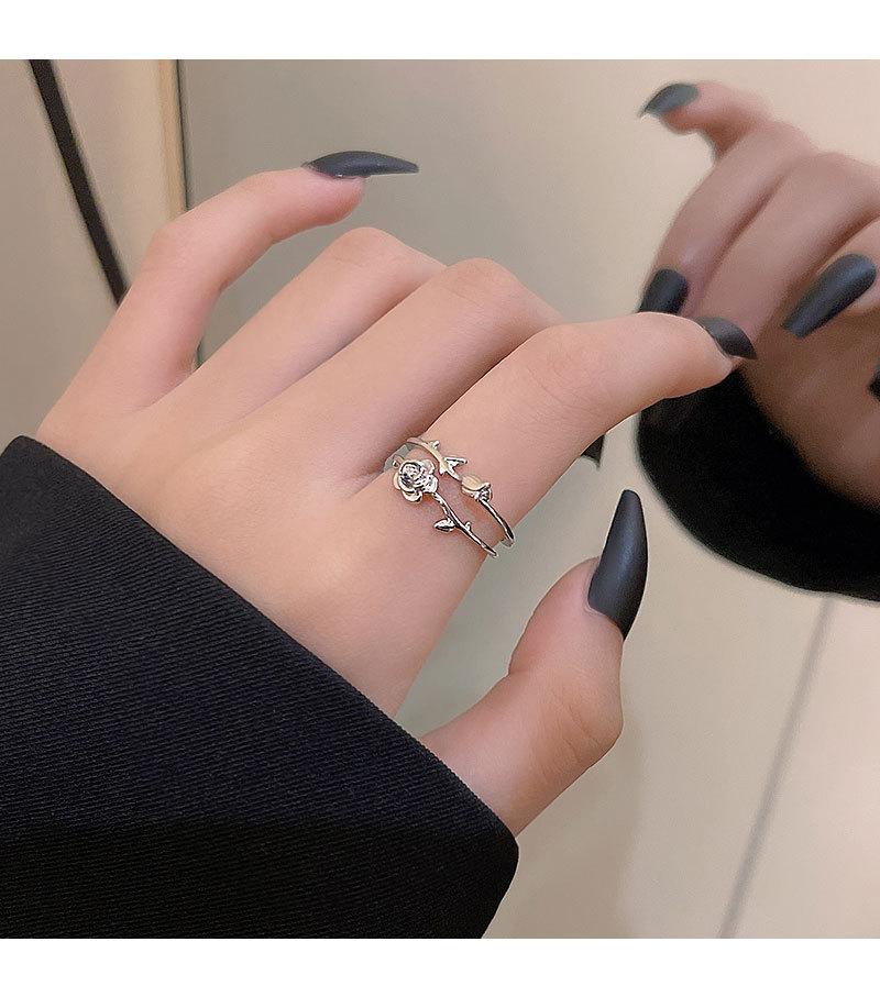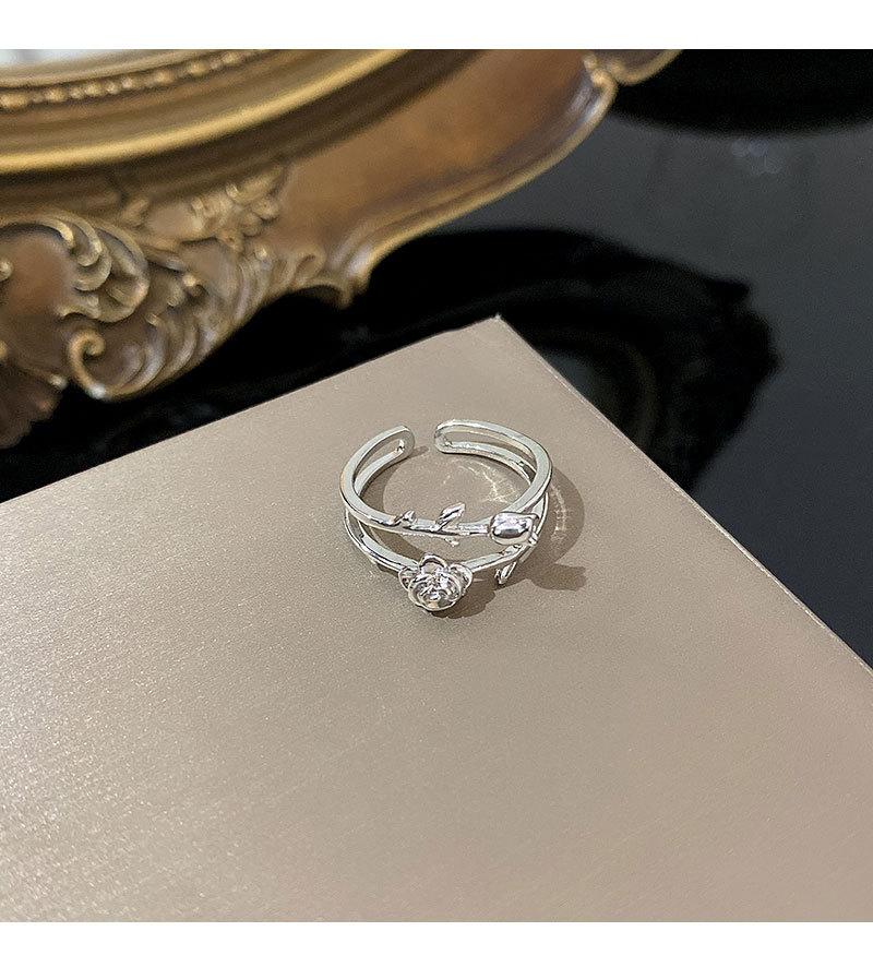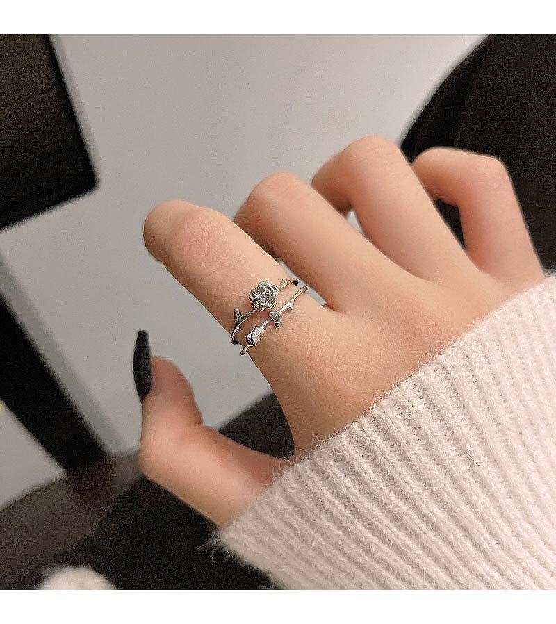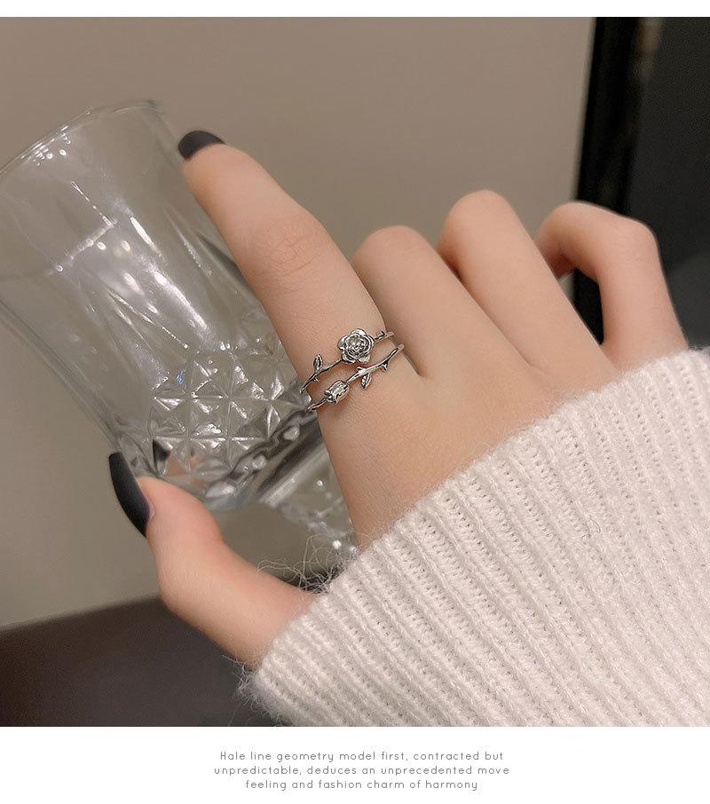 Anillo abierto de doble capa de flor rosa plateada para mujer, estilo frío, diseño nicho, anillo para el dedo índice, joyería retro de alta gama