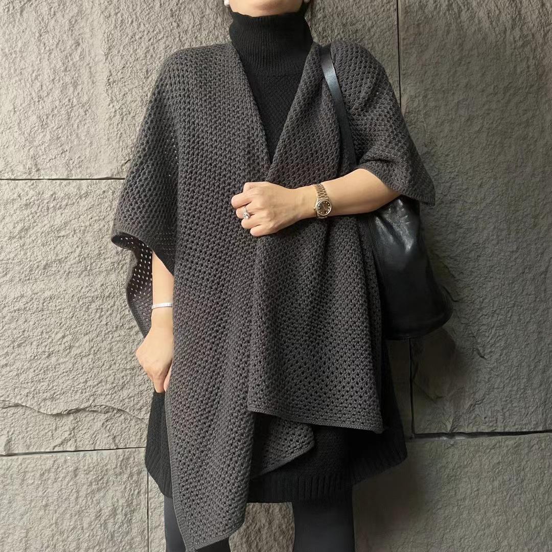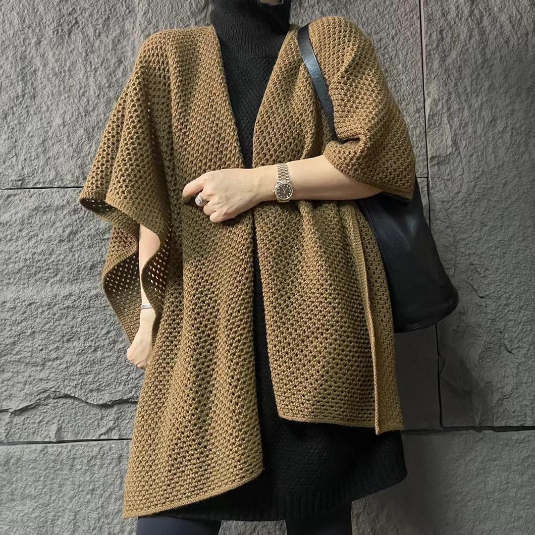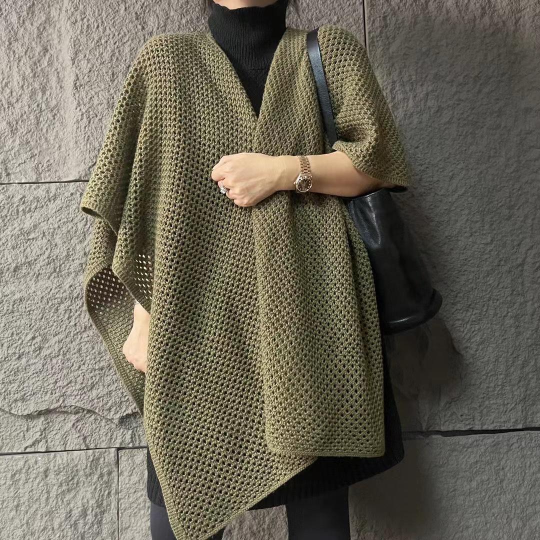 Nuevo Suéter de Punto Calado Holgado Vago de Color Sólido con Cuello en V Otoño e Invierno 2024 Nueva Moda Chaqueta Chal que Combina con Todo