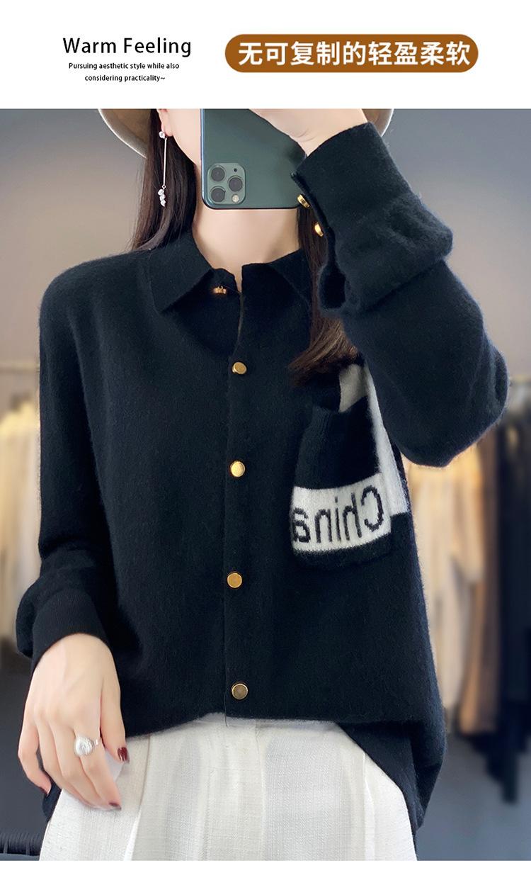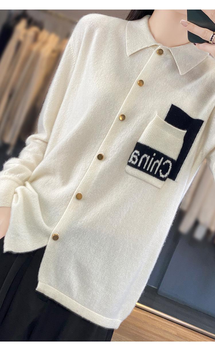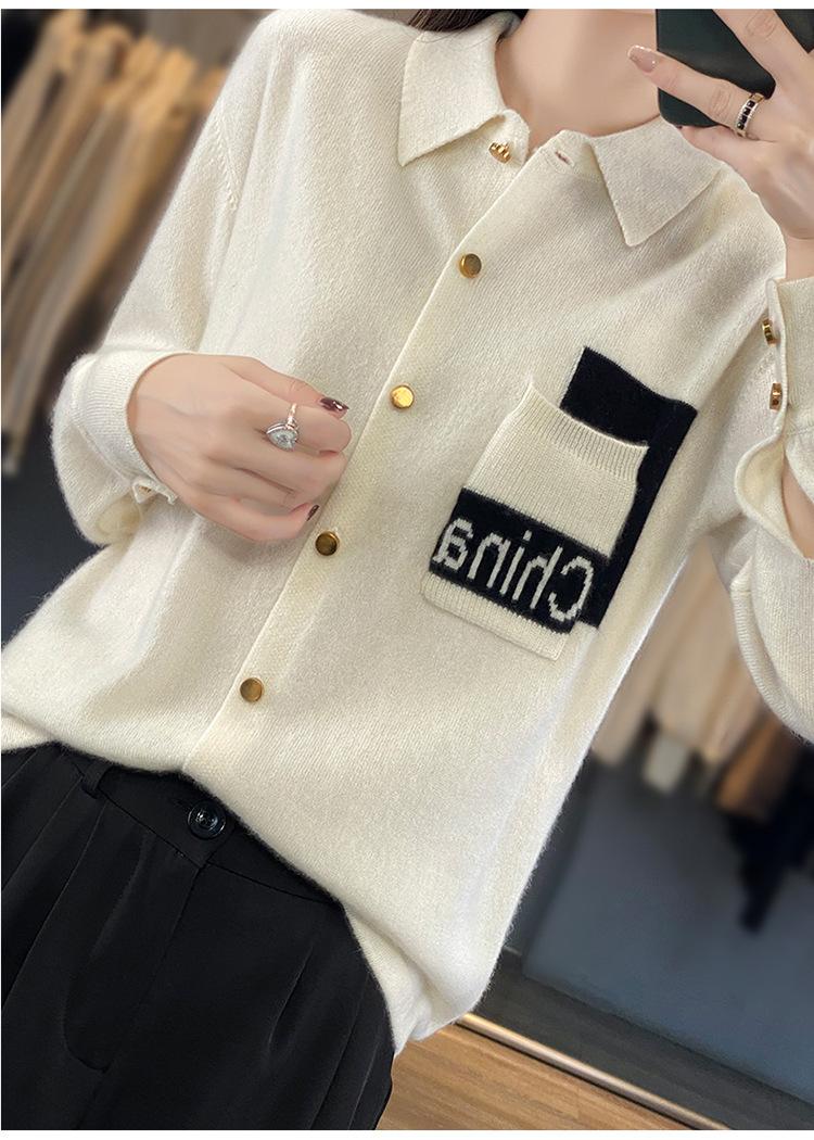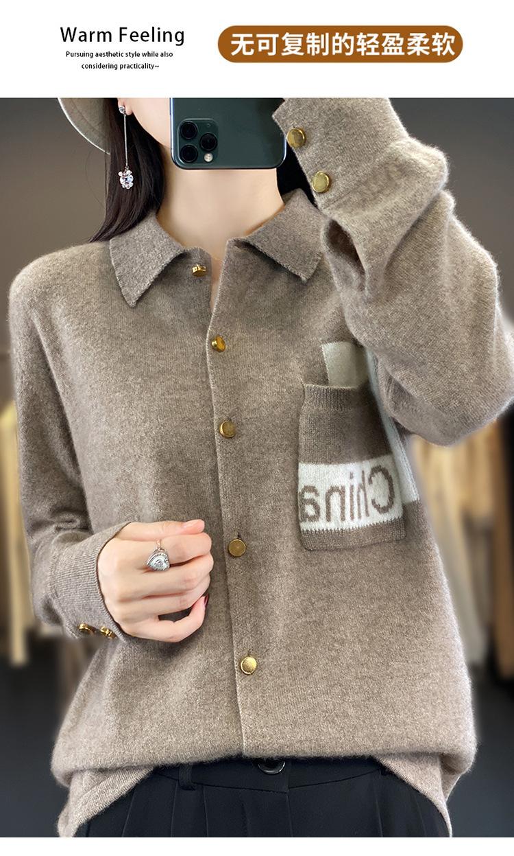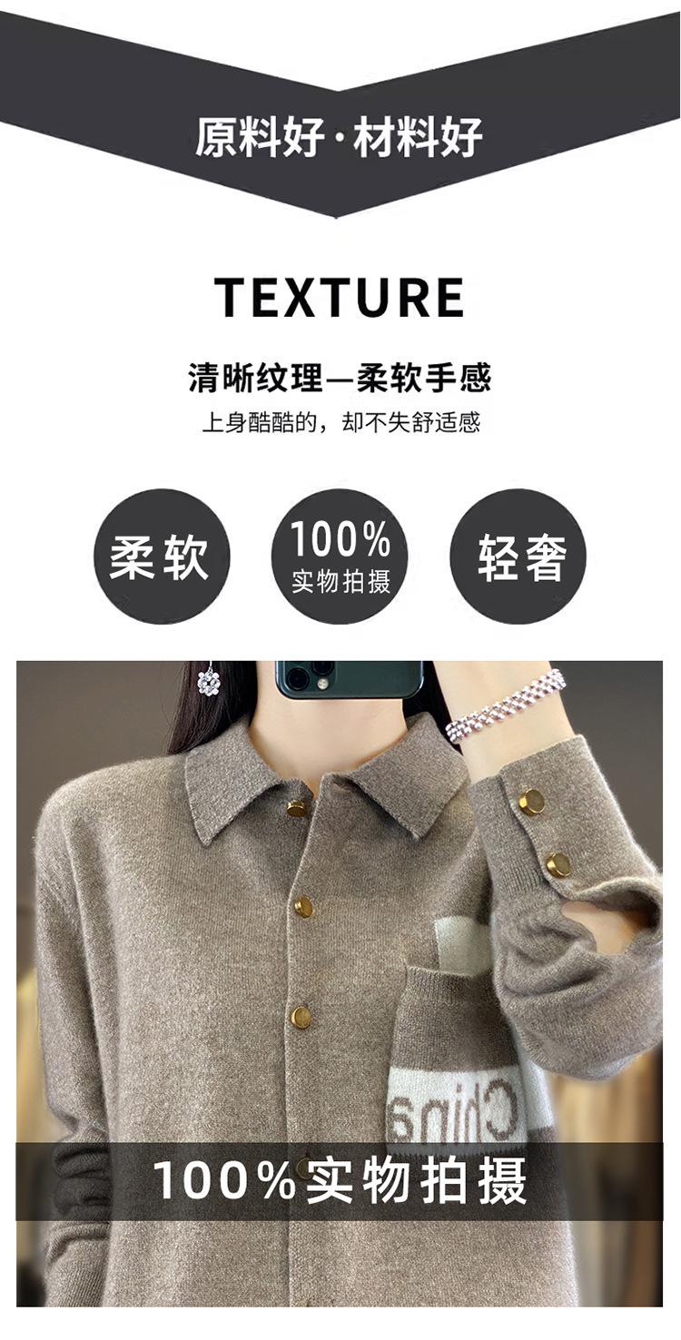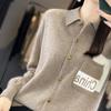Suéter de Lana Nuevo Otoño e Invierno 2023 para Mujer Cuello POLO Corto Suelto Casual Bolsillo Cárdigan de Punto Top