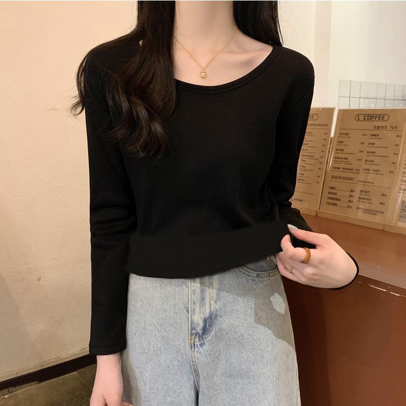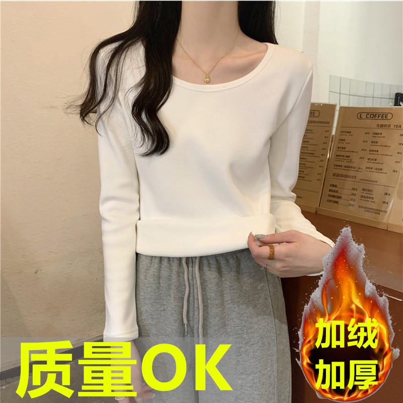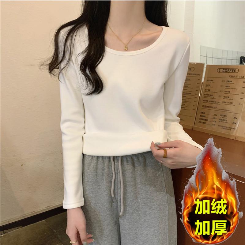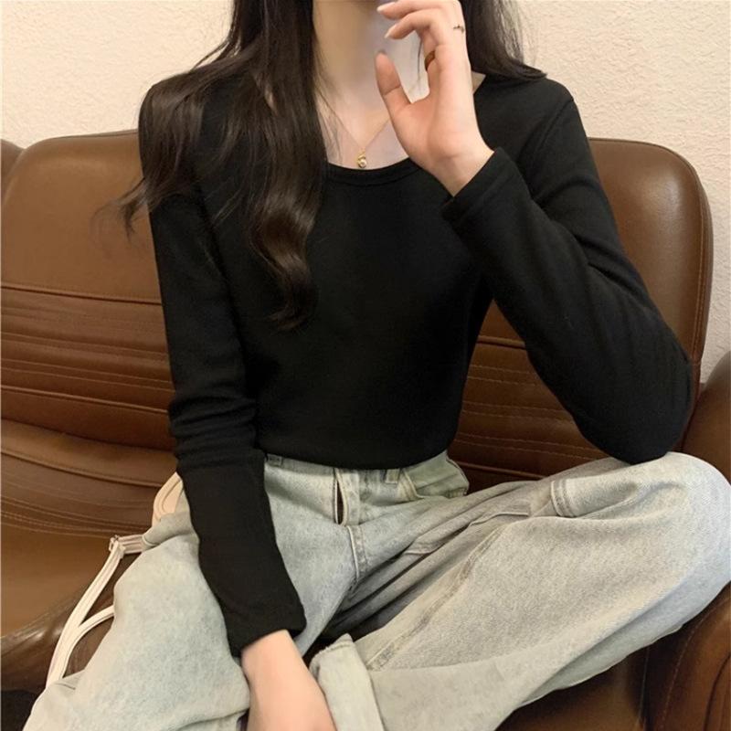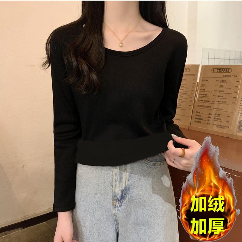 Otoño e Invierno Nuevo Estilo Terciopelo Engrosado Negro Camiseta Básica para Mujer Versátil Cuello Redondo a Prueba de Frío y Cálida Tops Camisetas para Mujer Venta al por Mayor