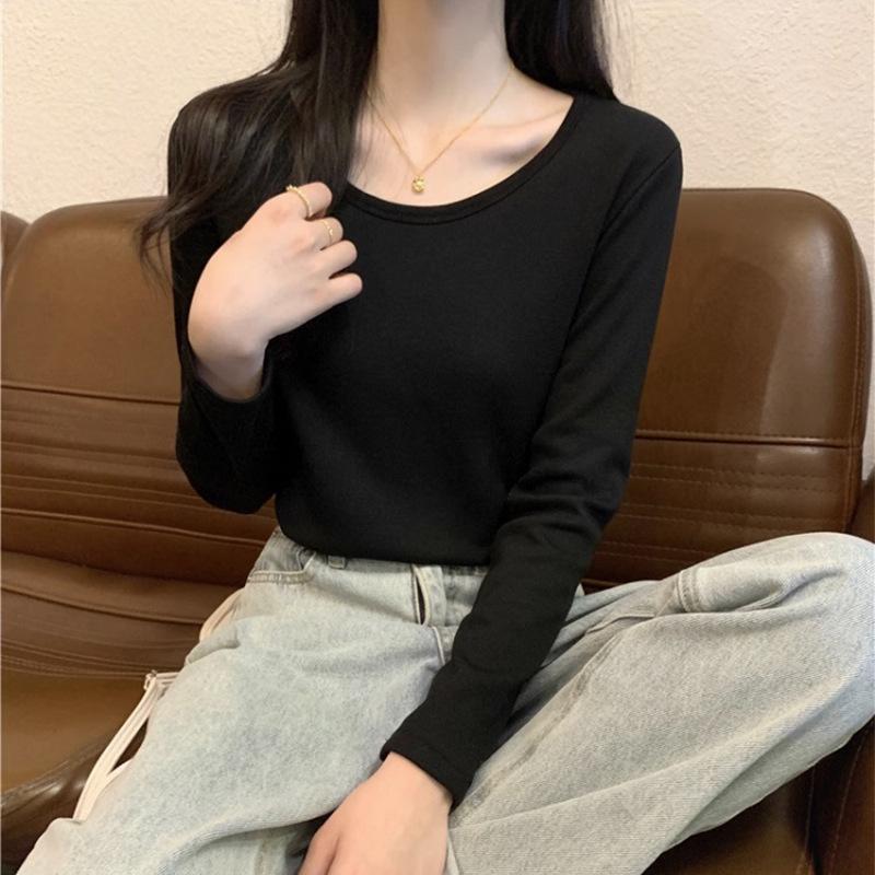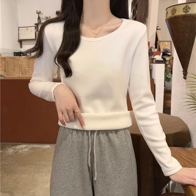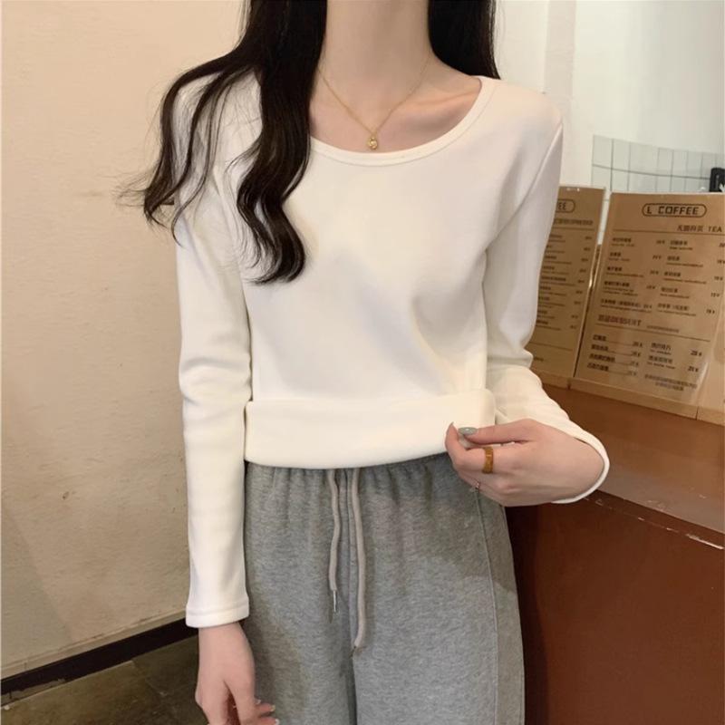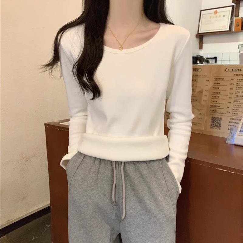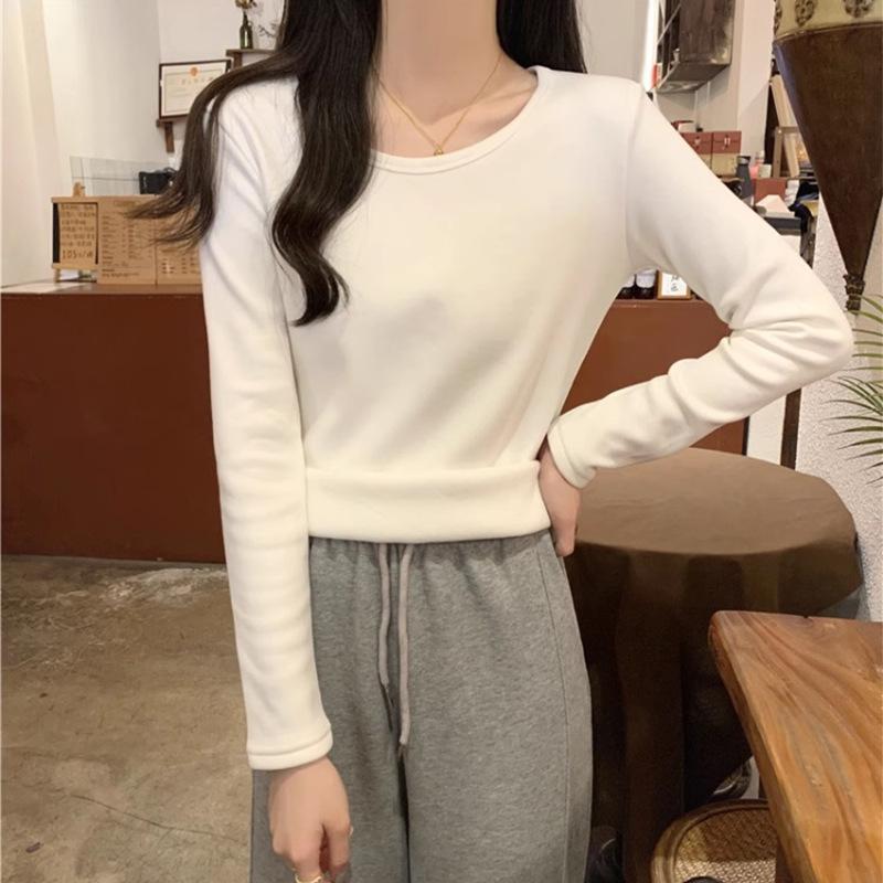 Otoño e Invierno Nuevo Estilo Terciopelo Engrosado Negro Camiseta Básica para Mujer Versátil Cuello Redondo a Prueba de Frío y Cálida Tops Camisetas para Mujer Venta al por Mayor