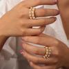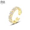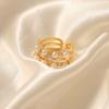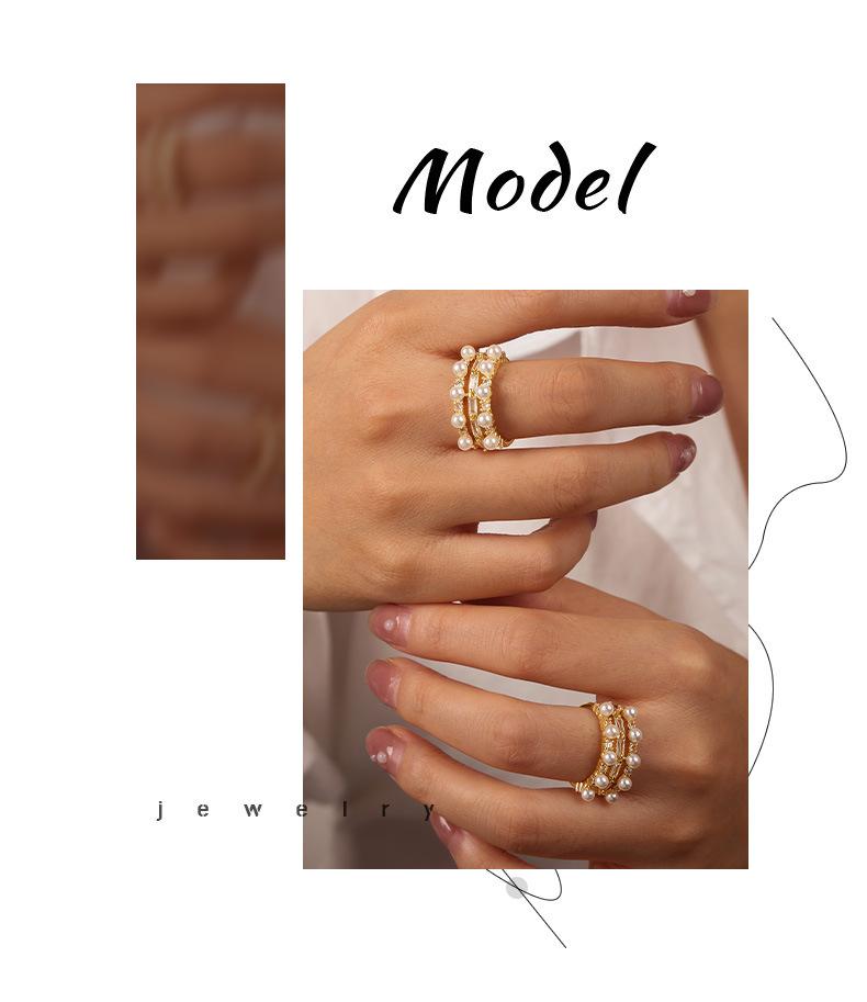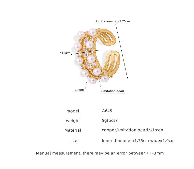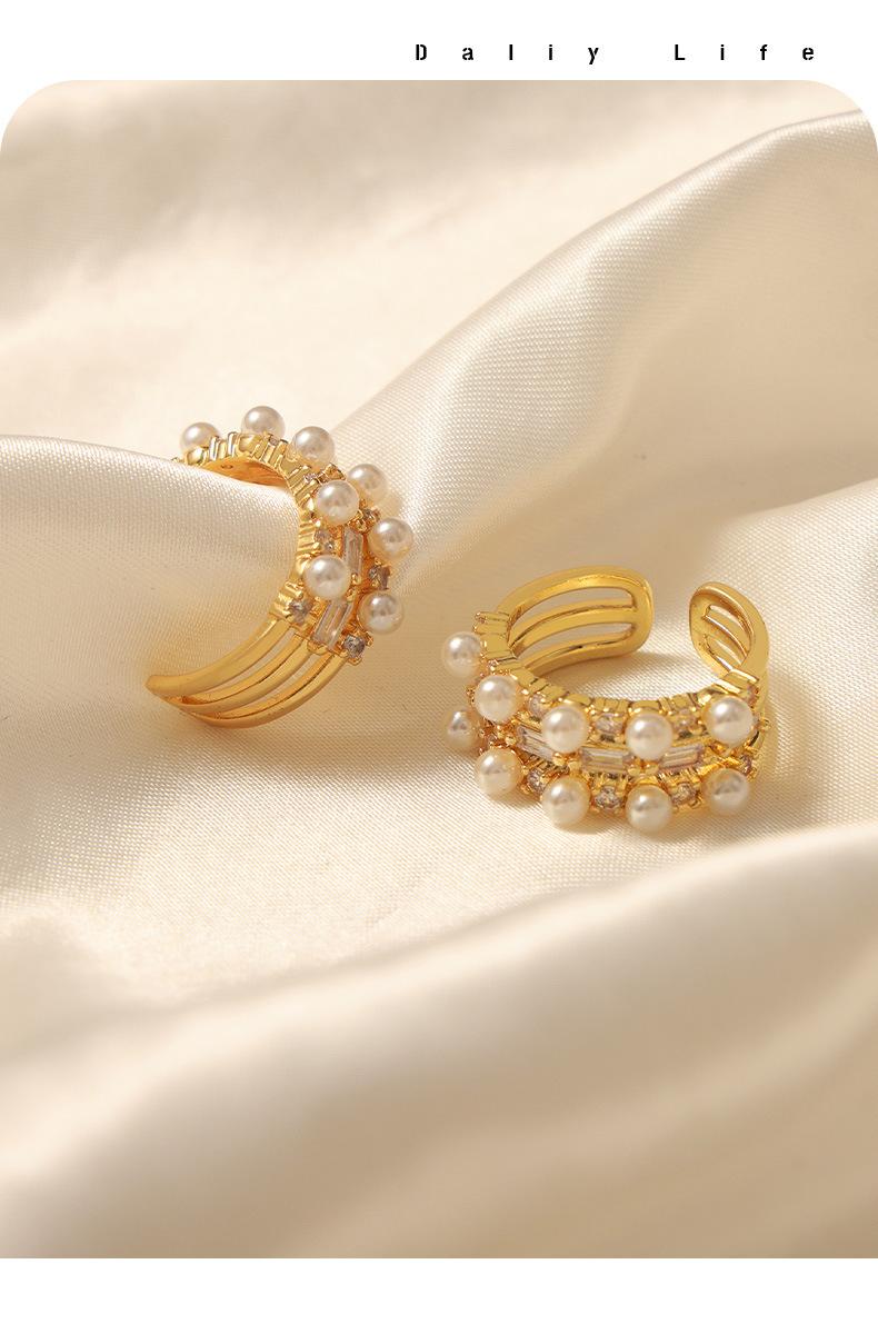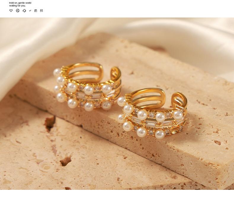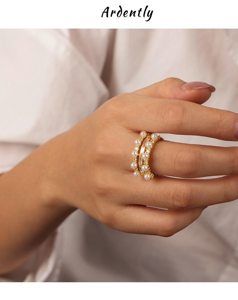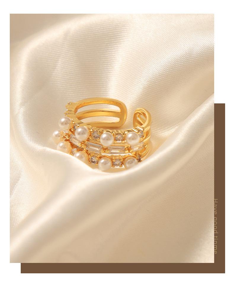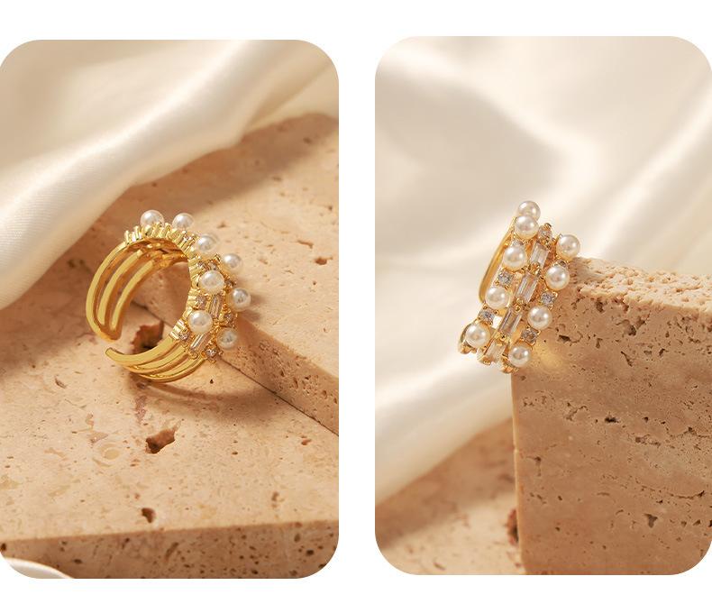 Anillo europeo y americano de lujo ligero vintage de material de cobre, anillo con circonita y perla de imitación, joyería geométrica de personalidad, anillo abierto para mujer