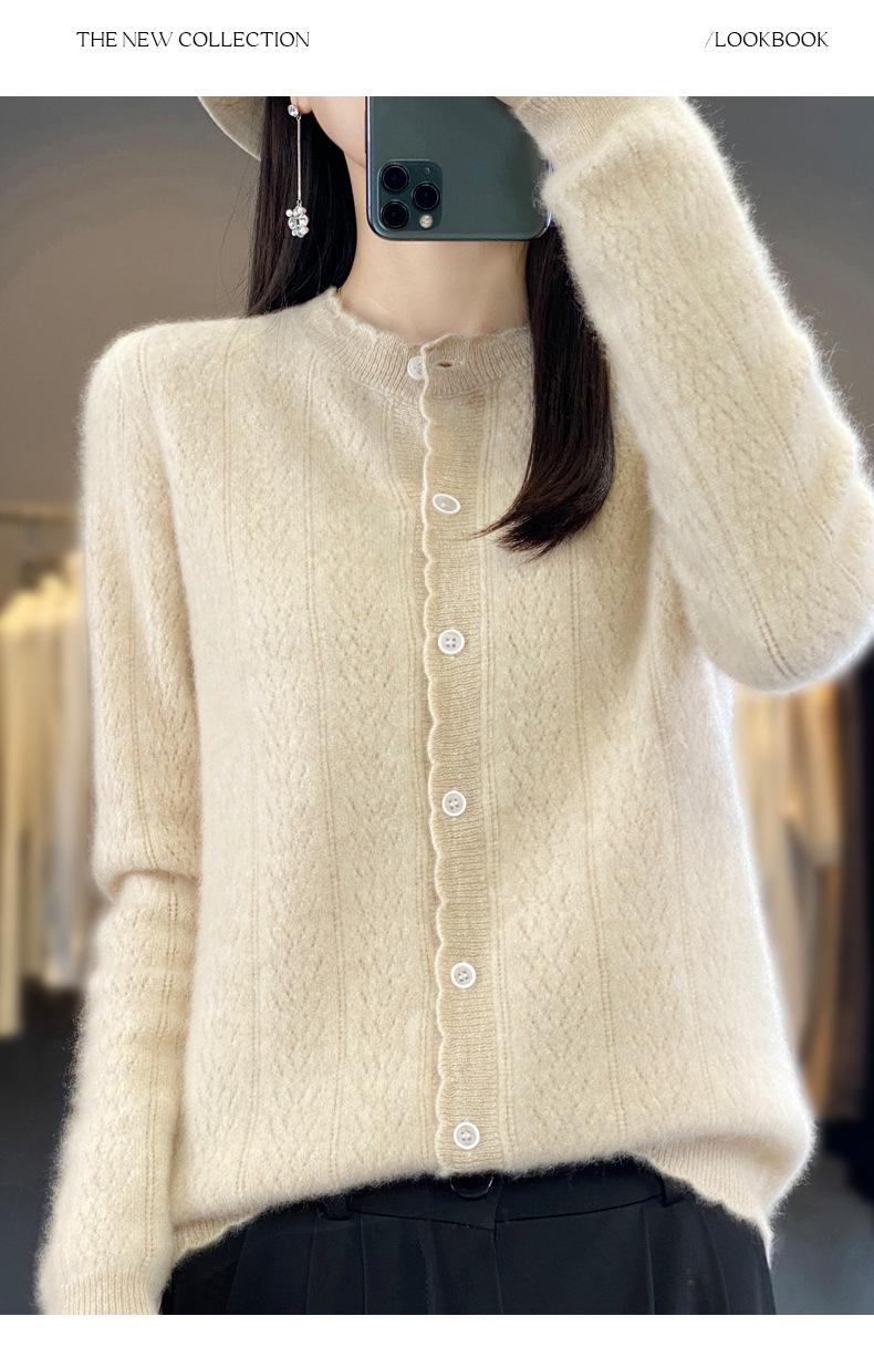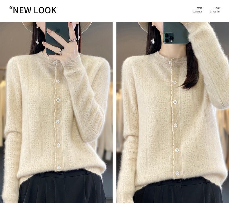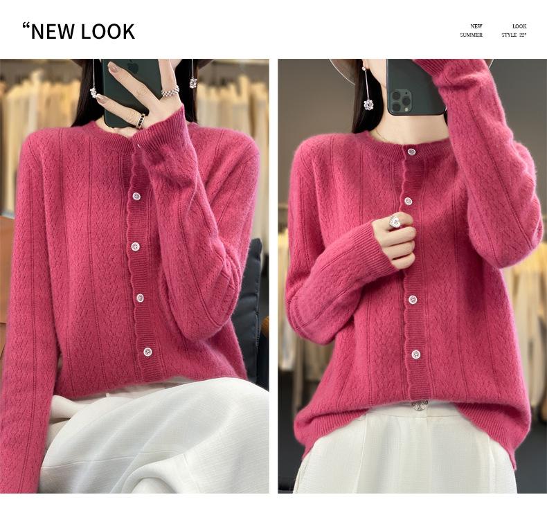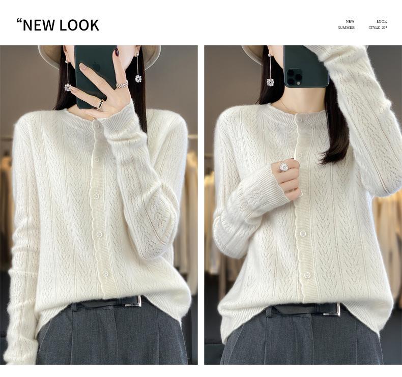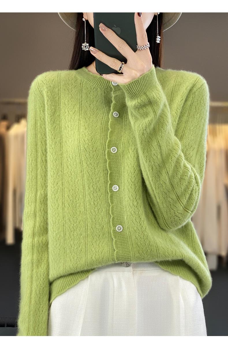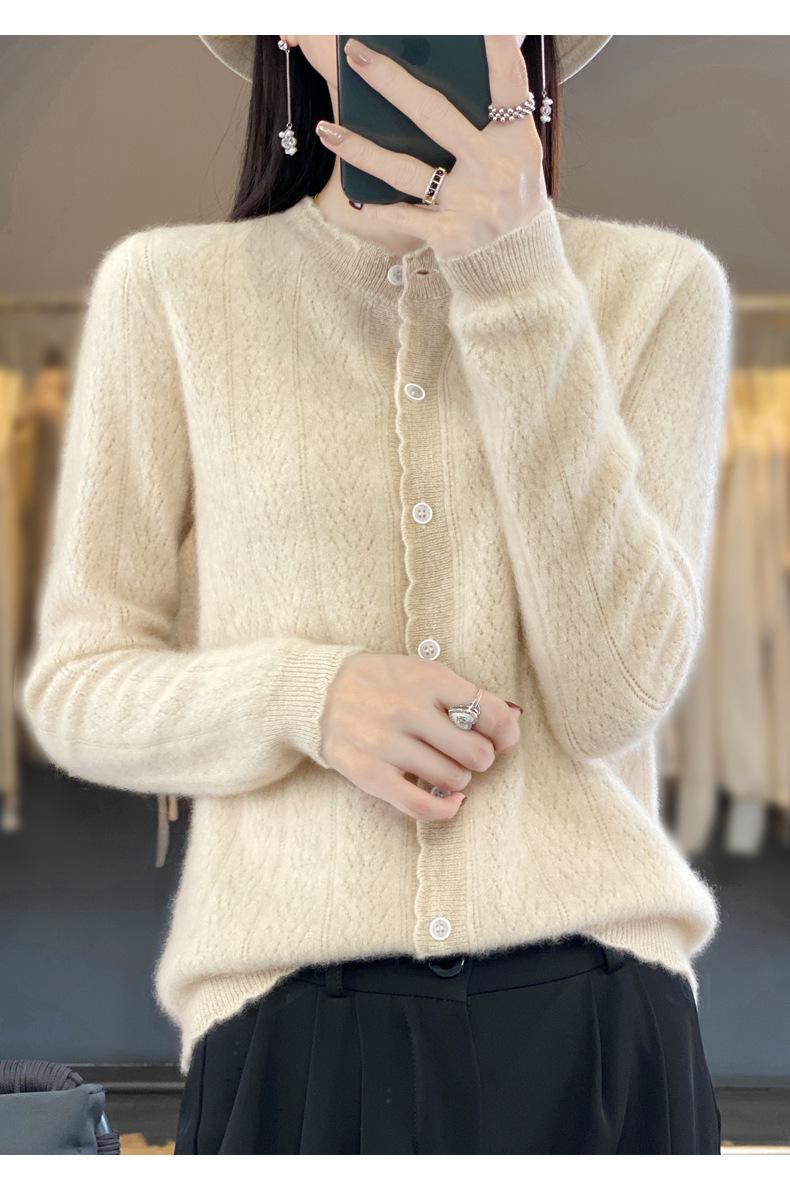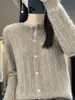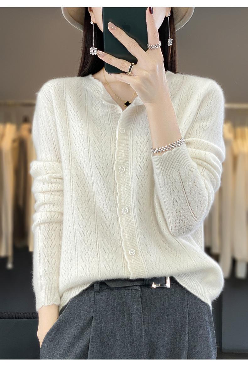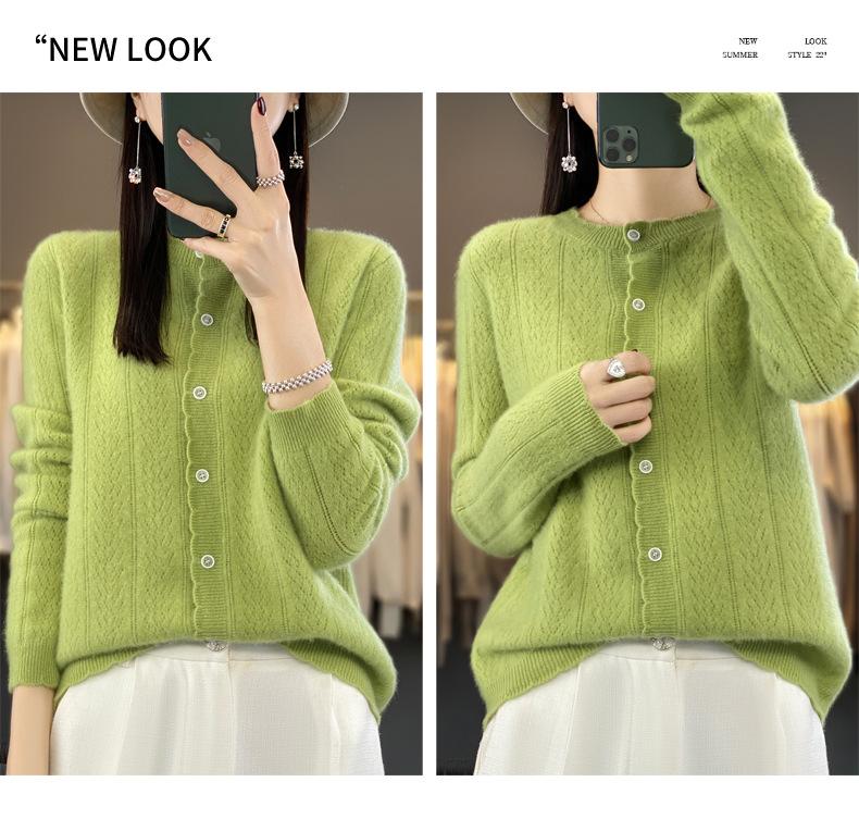 Suéter calado de punto de lana 100 pura, abrigo de moda, nuevo cárdigan, otoño e invierno, cuello redondo, manga larga, de alta calidad, suave