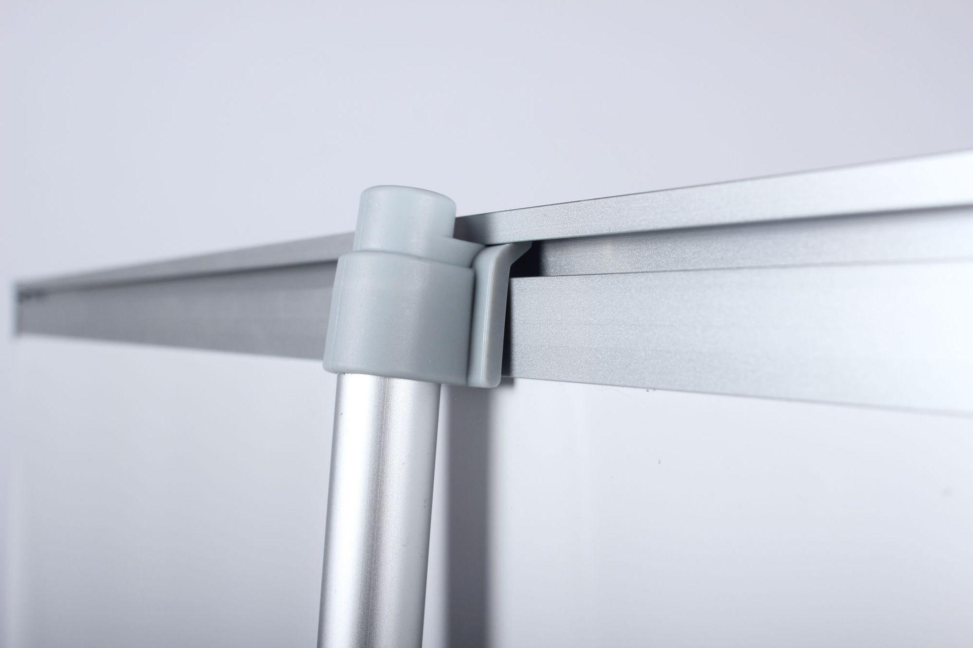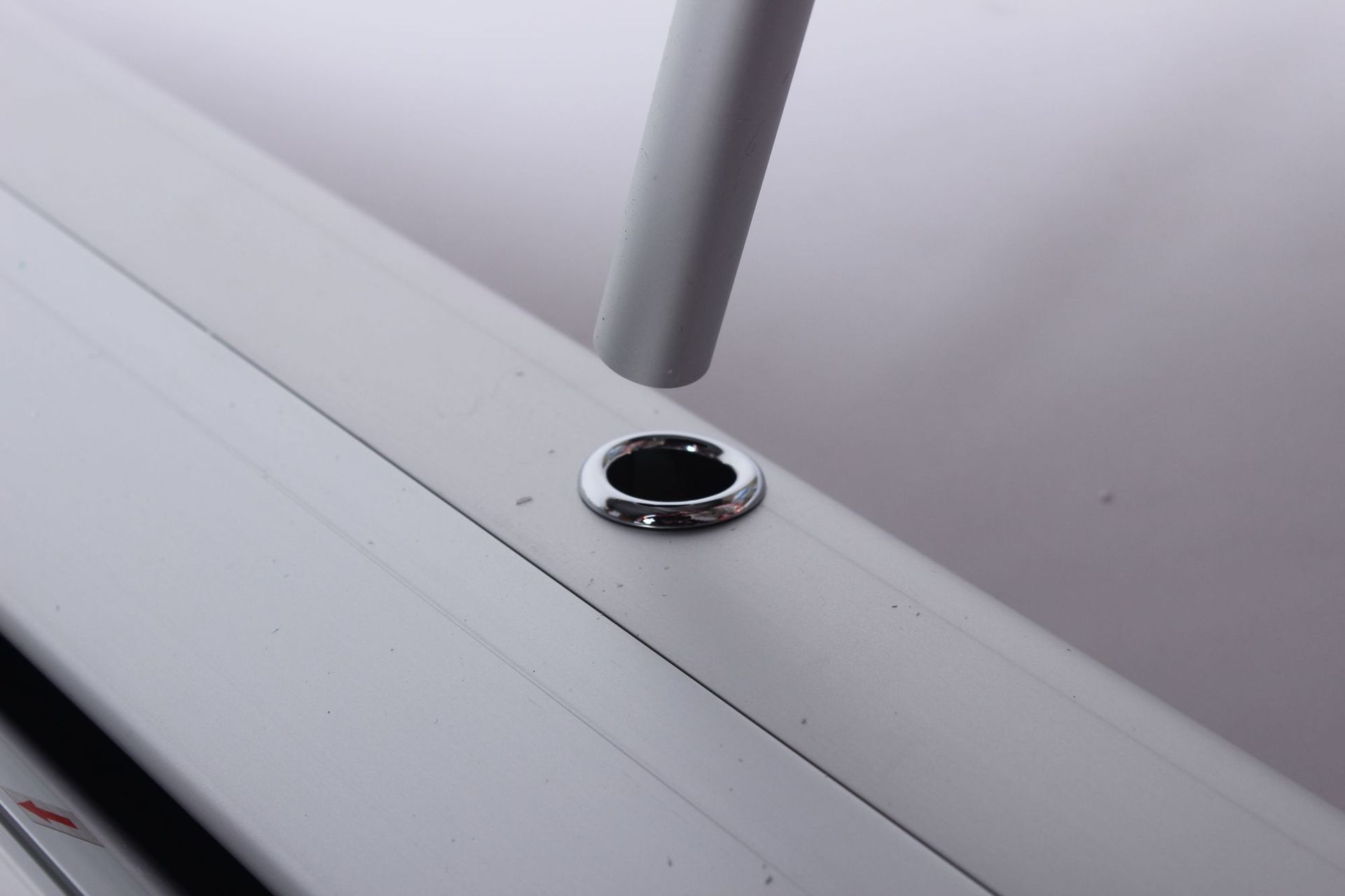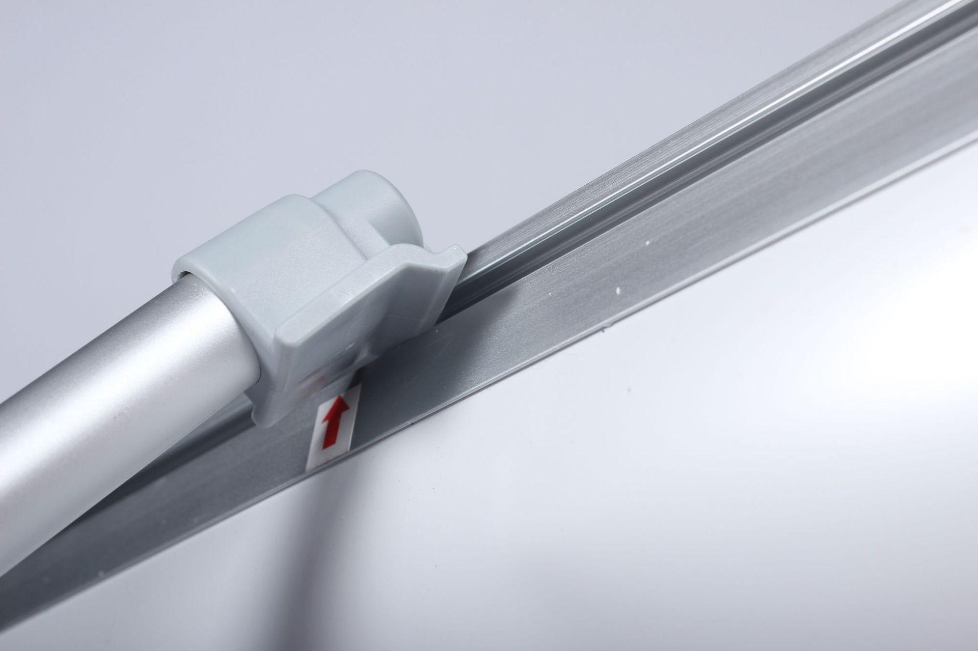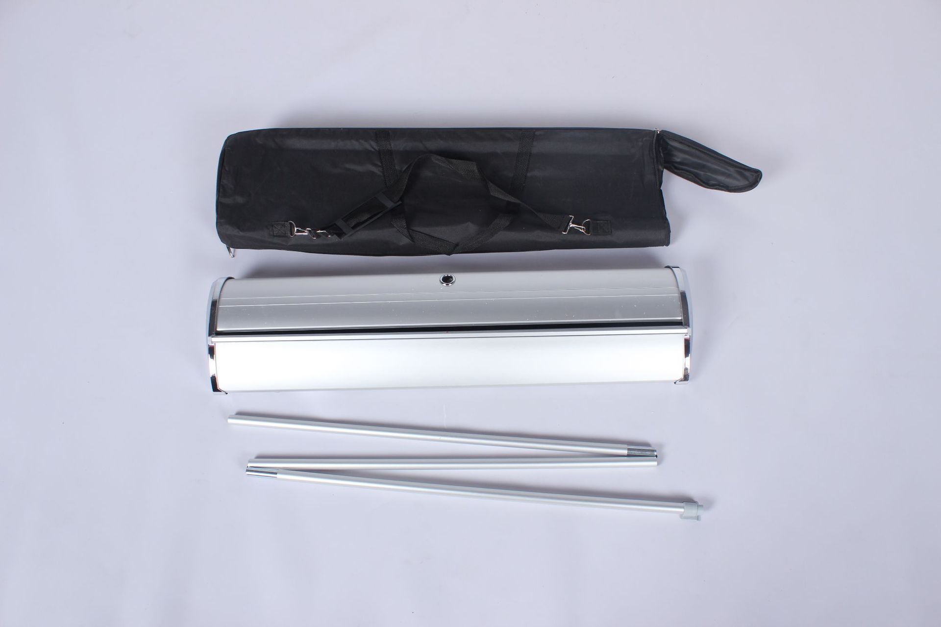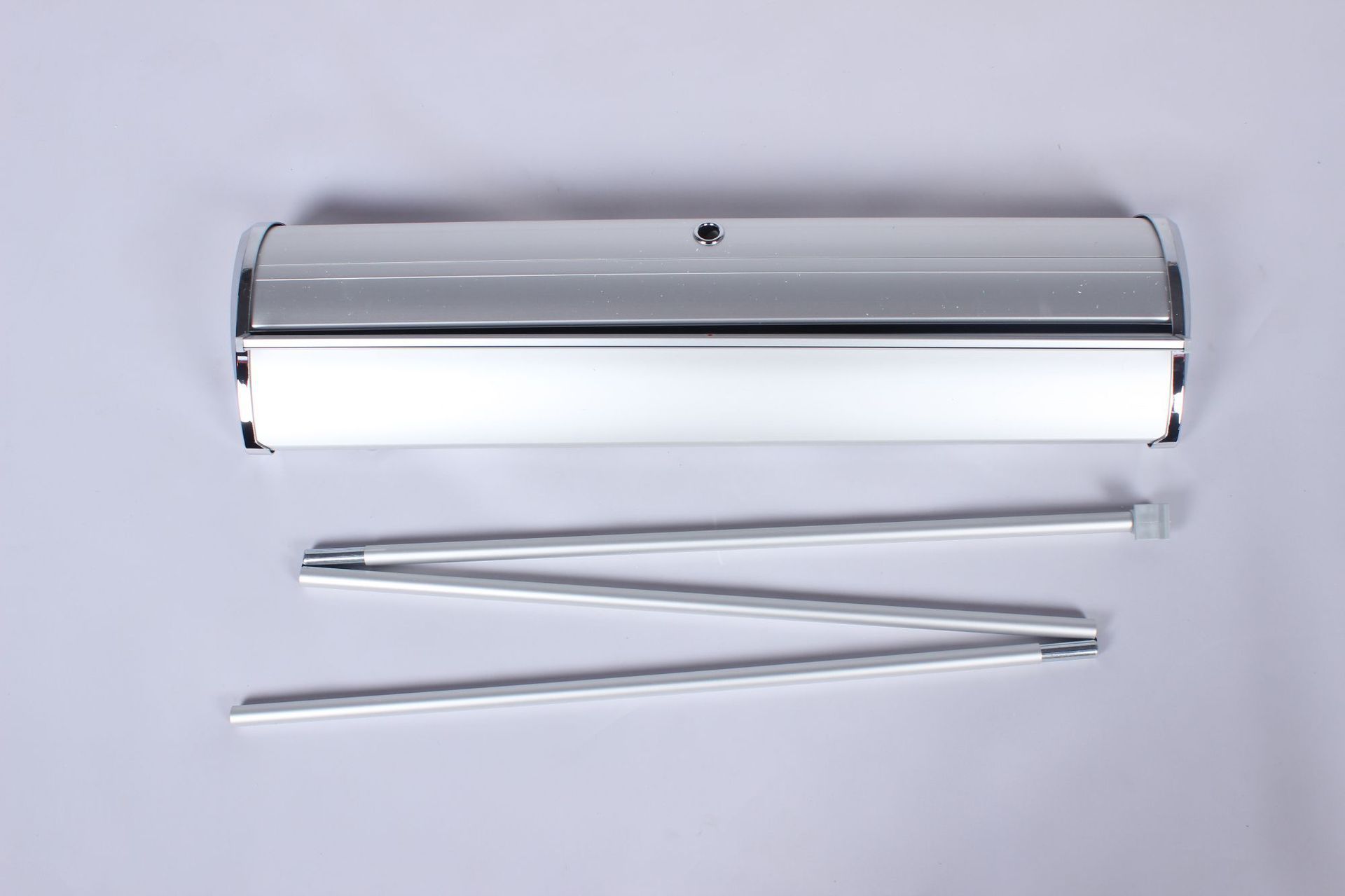 E. Al usarlo, saque la varilla metálica triple colocada en el "banner enrollable" y conéctela. Inserte un extremo de la varilla metálica en la abertura triangular de plástico del "banner enrollable", luego extraiga lentamente la imagen y enganche la tira para colgar la imagen.