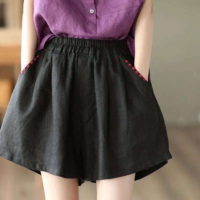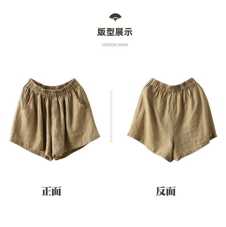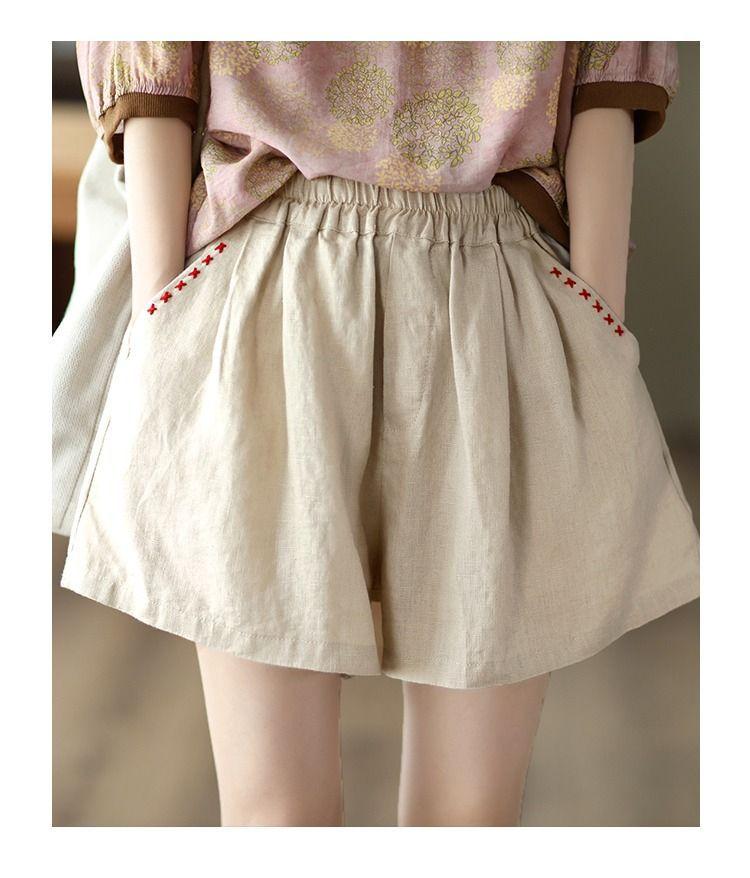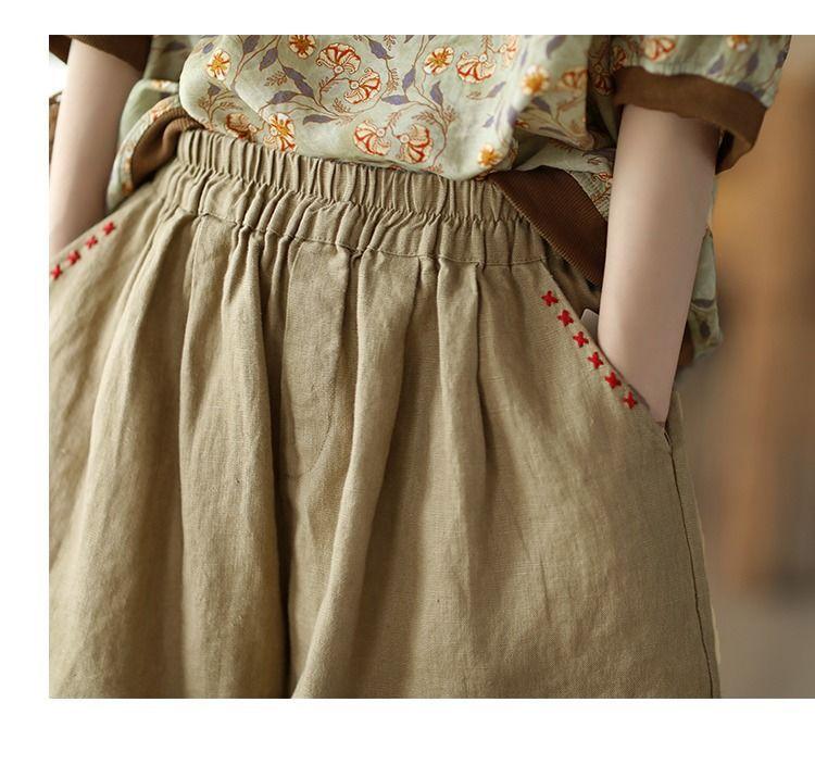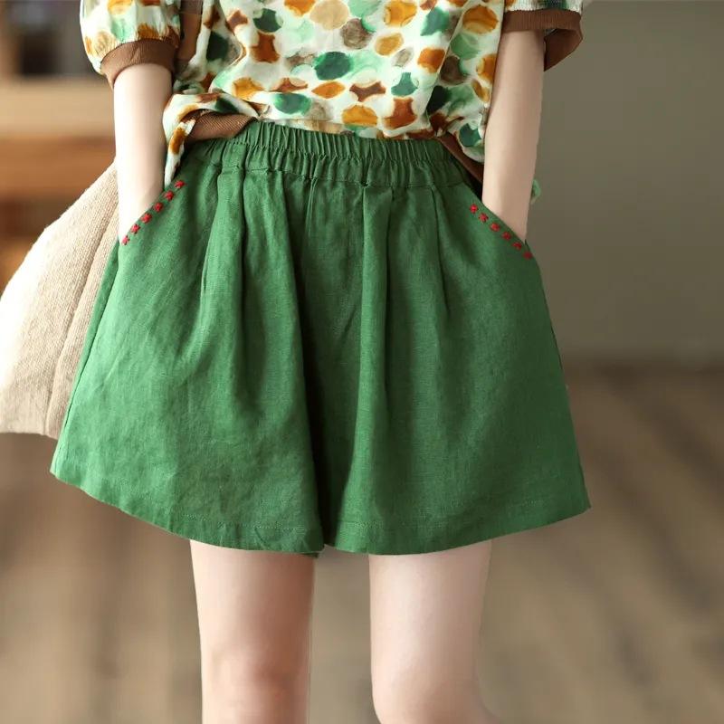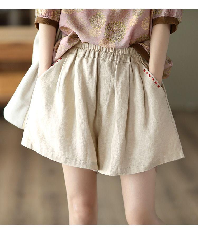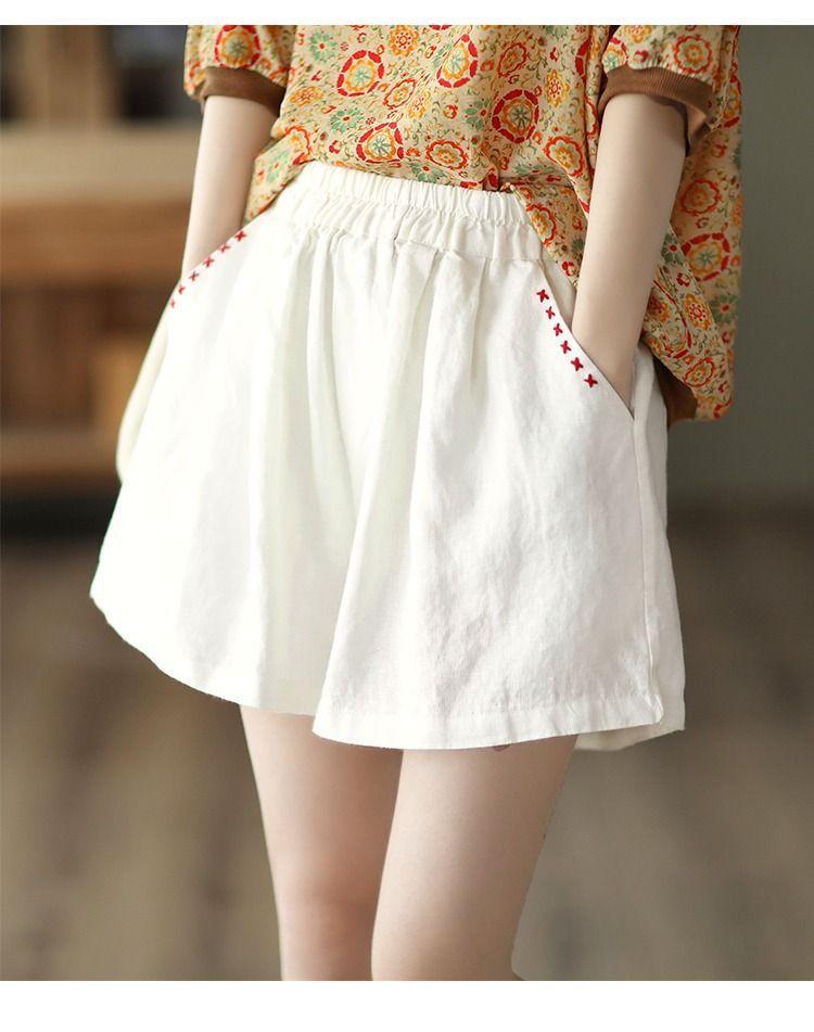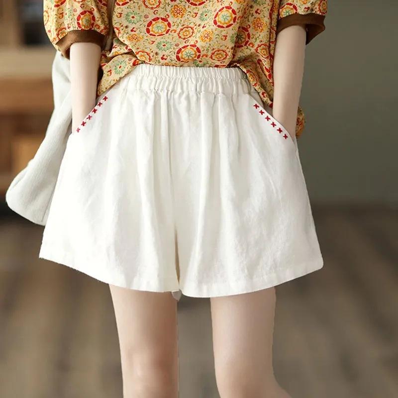 Shorts de Algodón y Lino para Mujer 2024 Verano Artístico Vintage Bordado Color Sólido Combinación Total Estilo Étnico Pantalones de Pierna Ancha