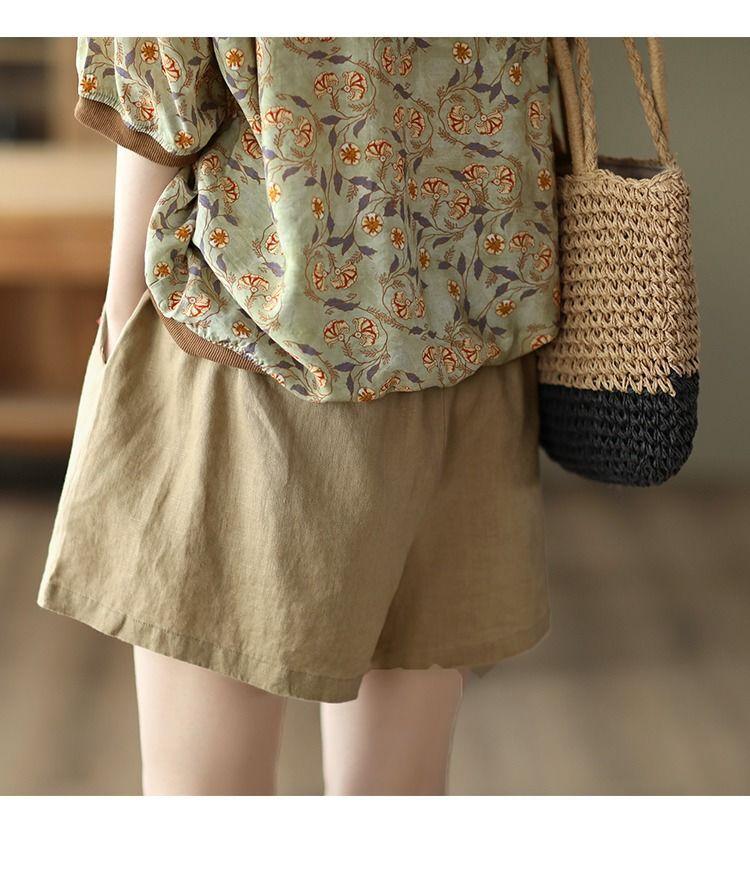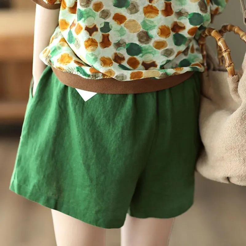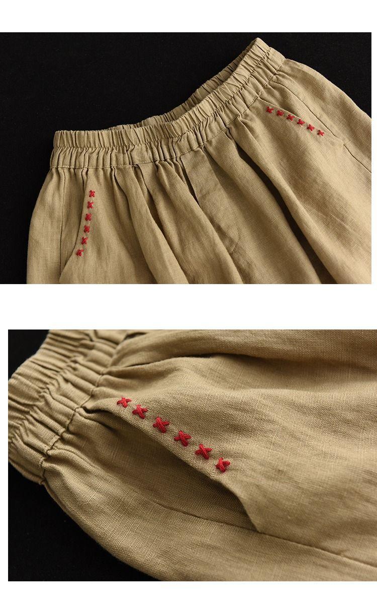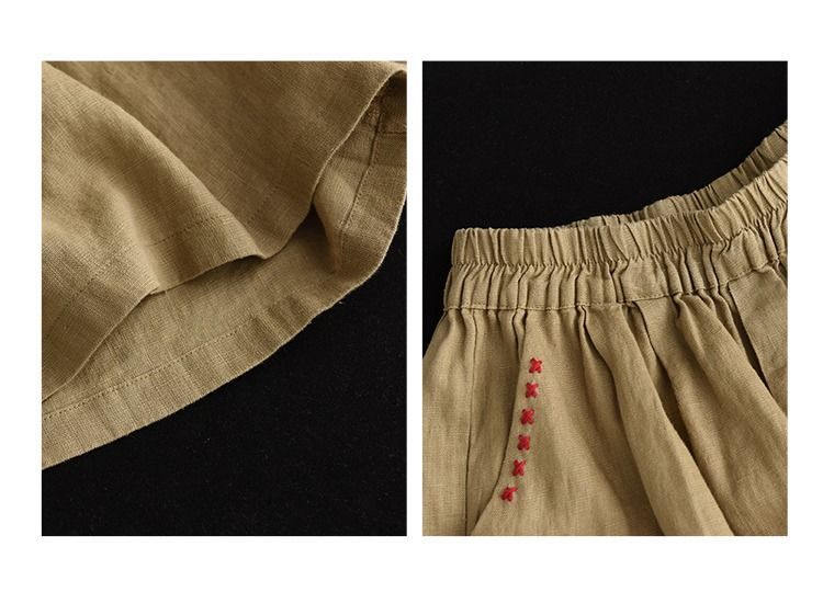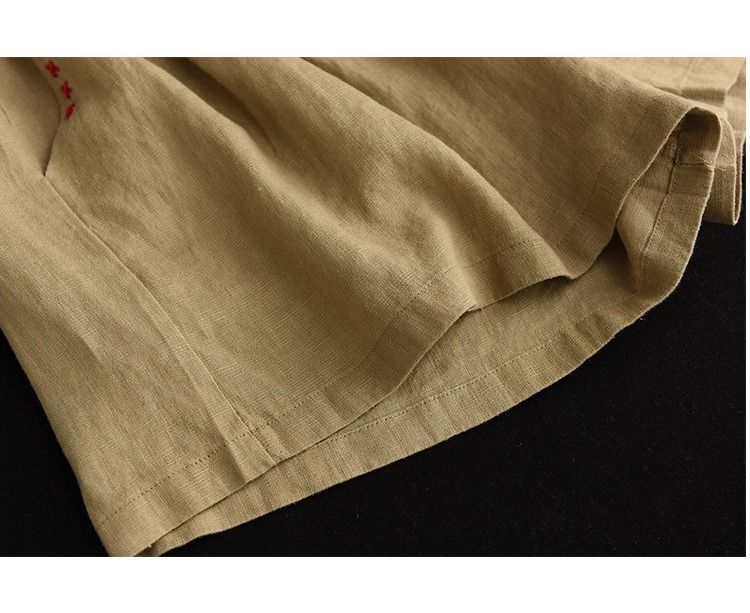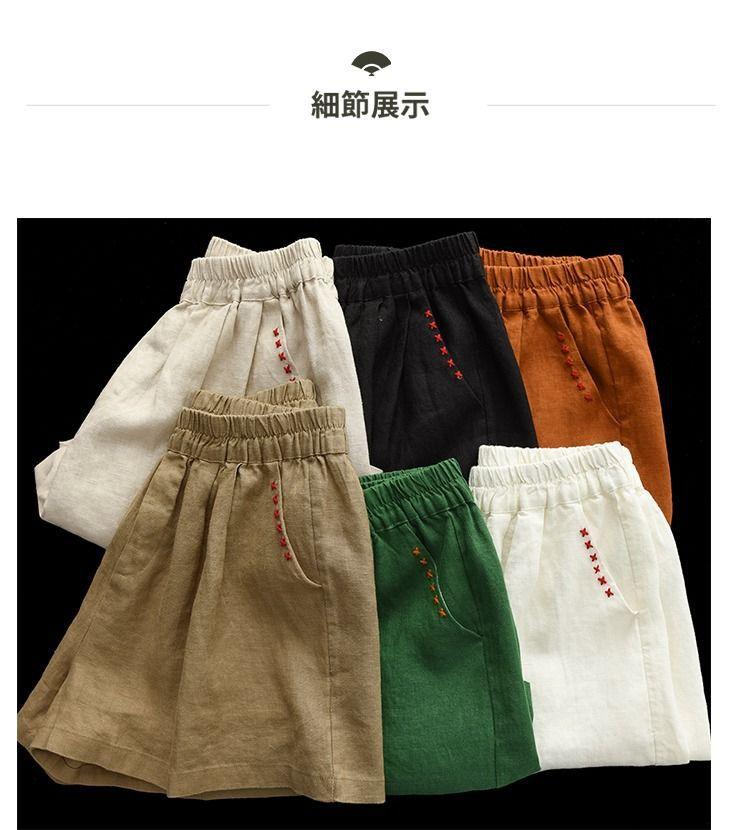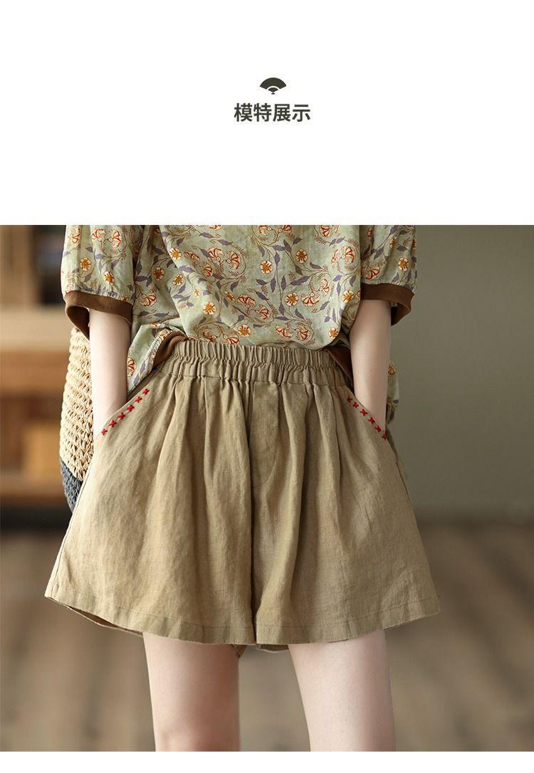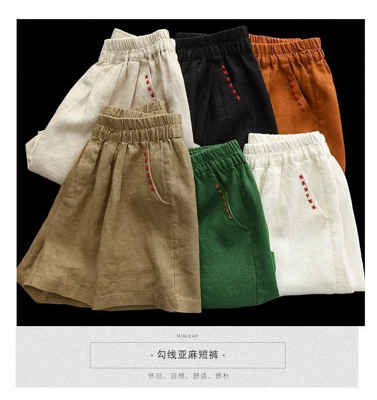 Shorts de Algodón y Lino para Mujer 2024 Verano Artístico Vintage Bordado Color Sólido Combinación Total Estilo Étnico Pantalones de Pierna Ancha