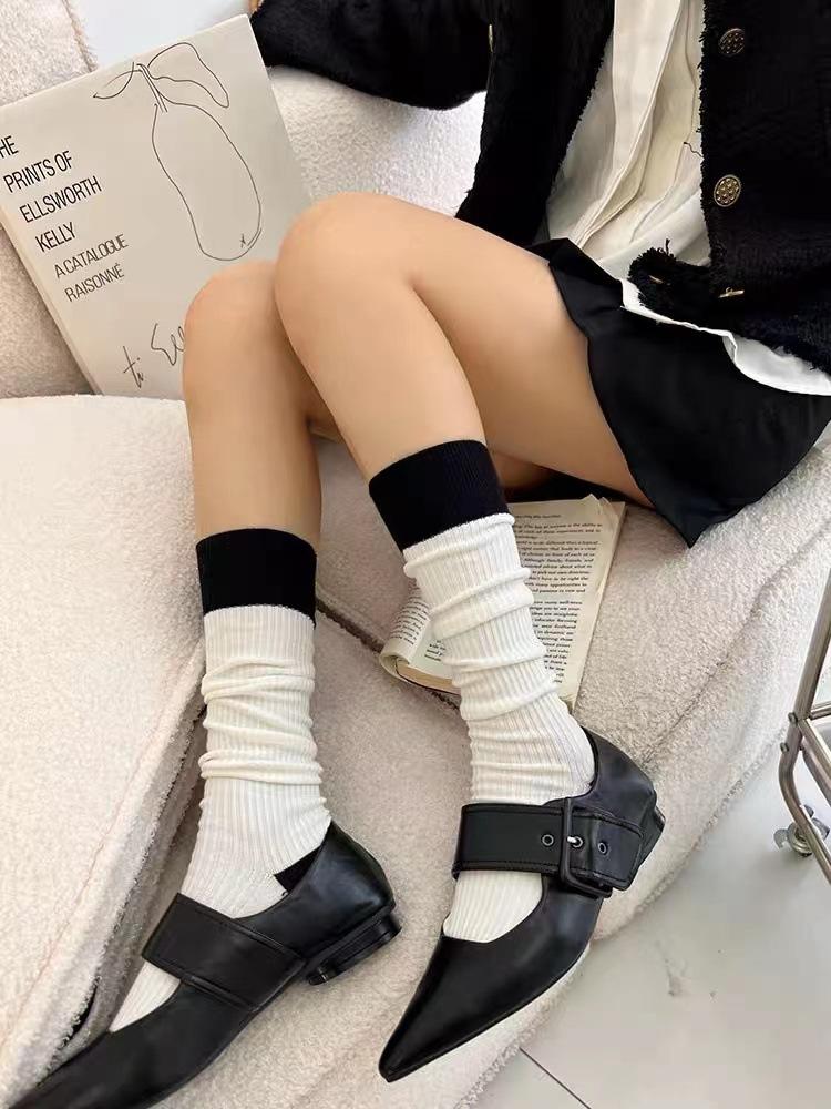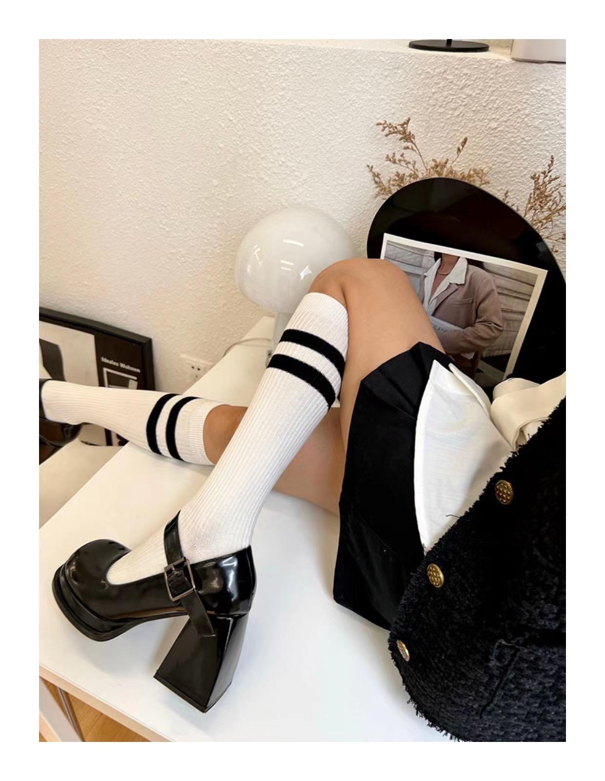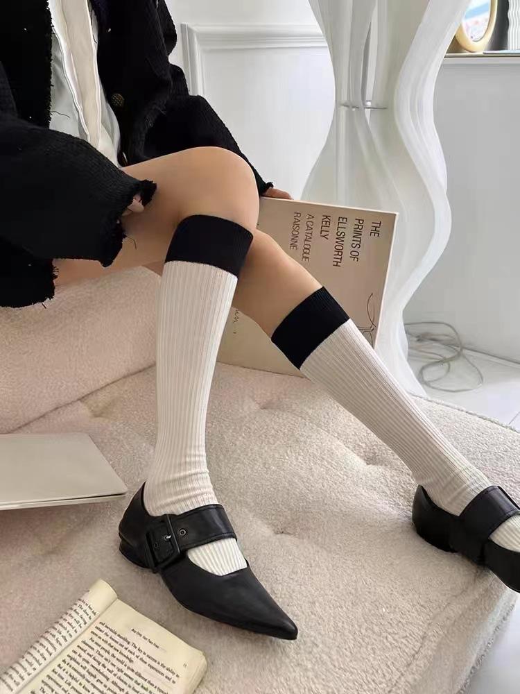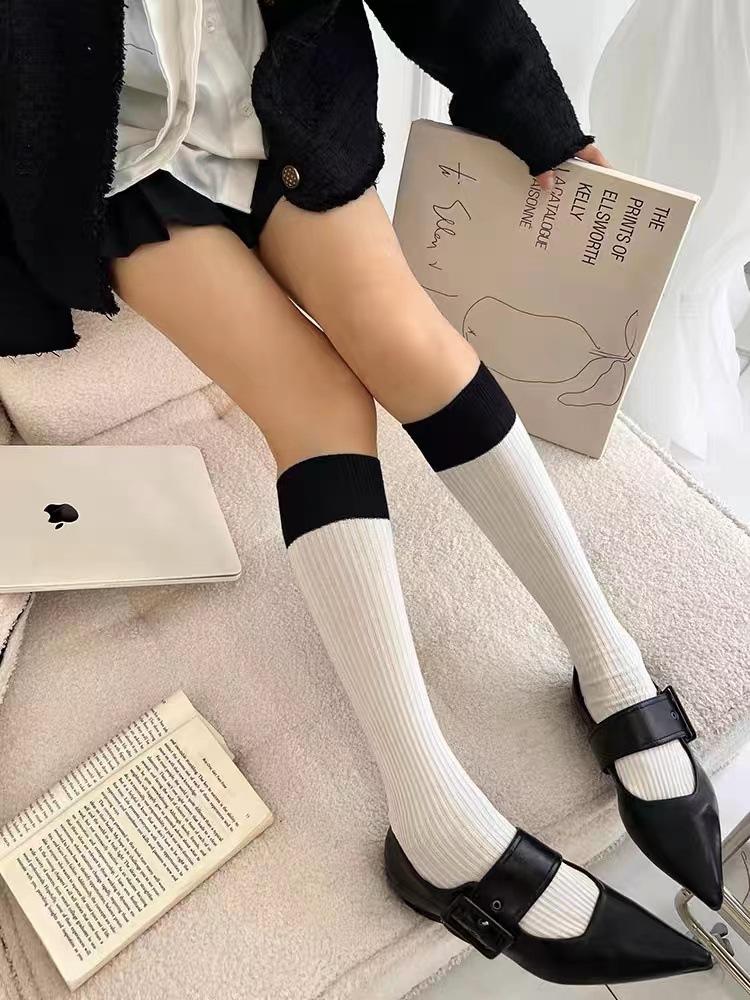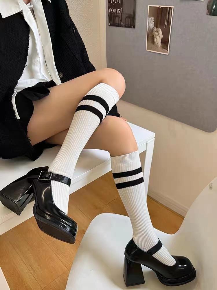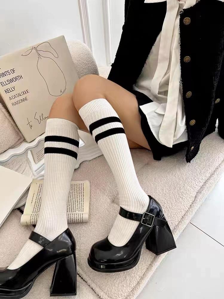 Calcetines de Compresión hasta la Rodilla Jk para Adelgazar las Piernas, Lindos Calcetines hasta la Mitad de la Pantorrilla en Blanco y Negro, Calcetines Largos Altos de Primavera y Otoño, Diseño de Rayas Versátil y Moderno