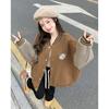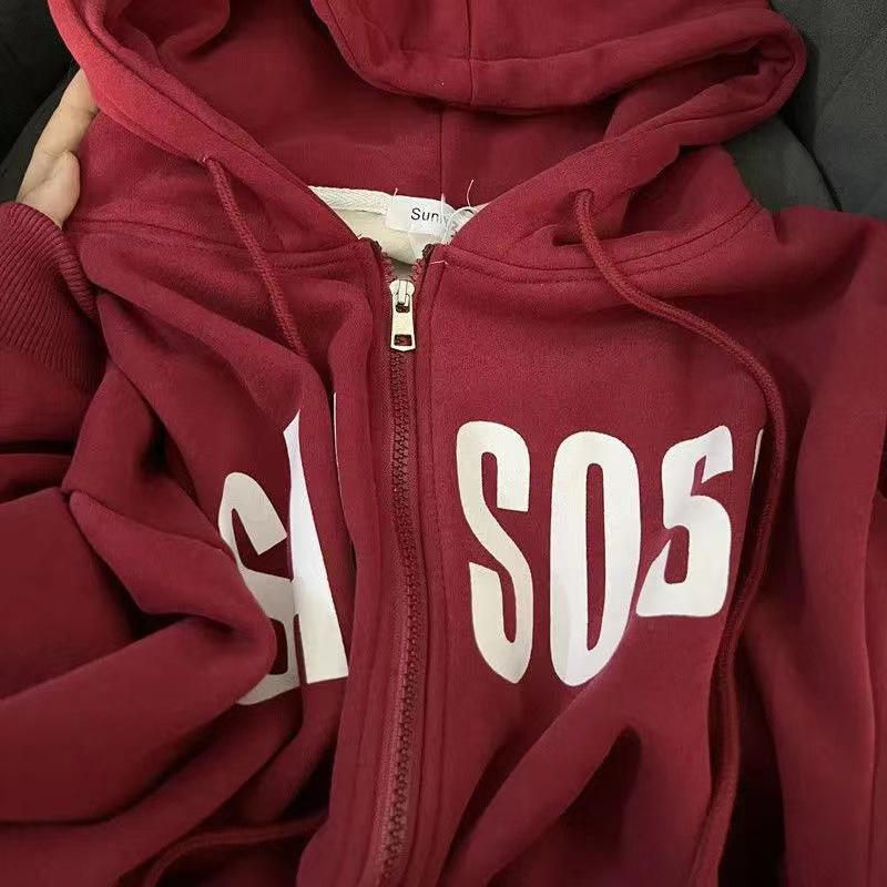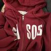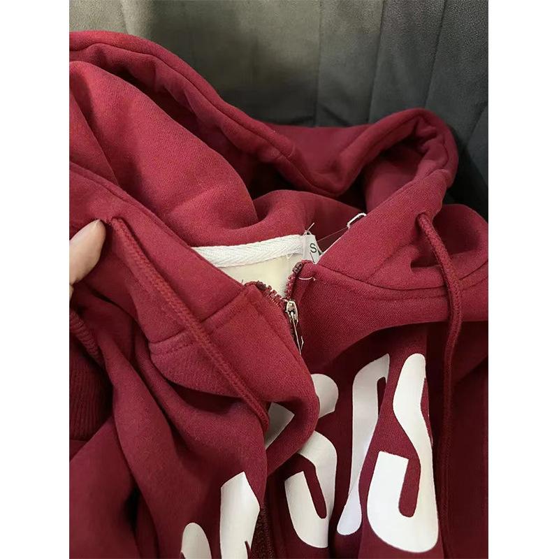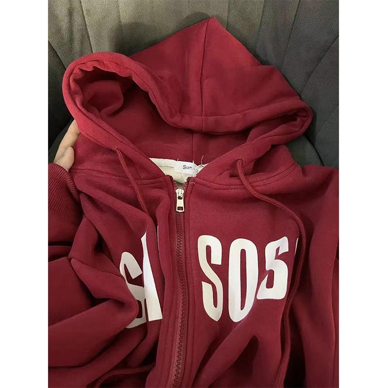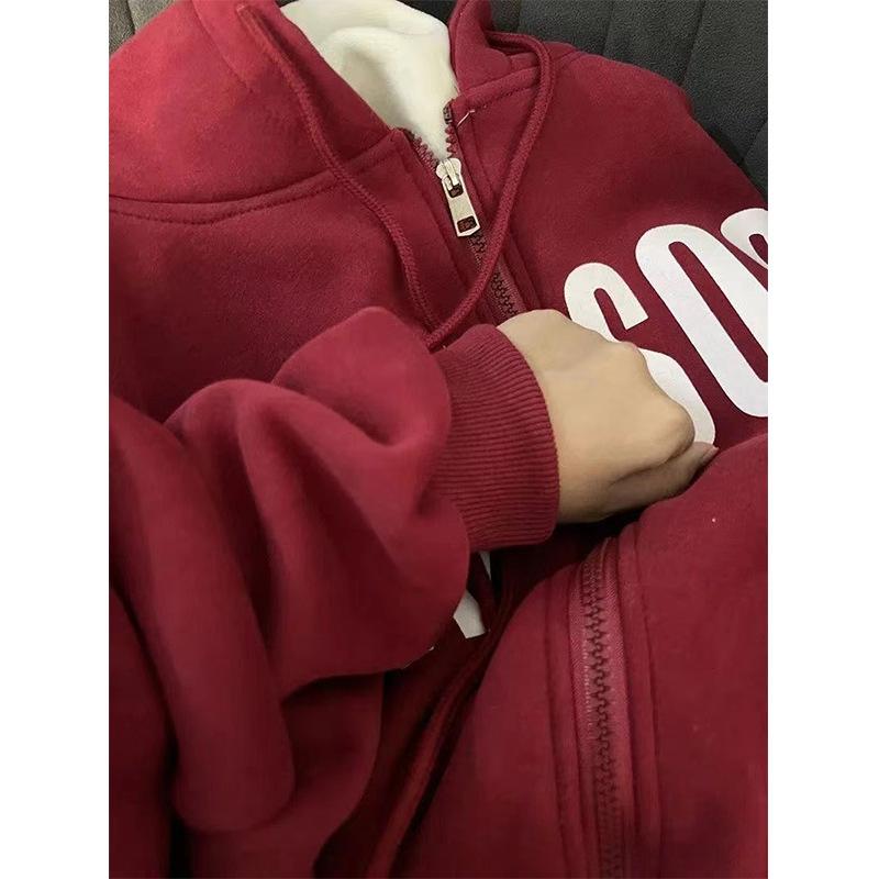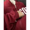 Suéter grueso con forro polar color rojo vino para mujer con capucha otoño e invierno uniforme de béisbol retro americano holgado marca de moda nacional chaqueta cárdigan